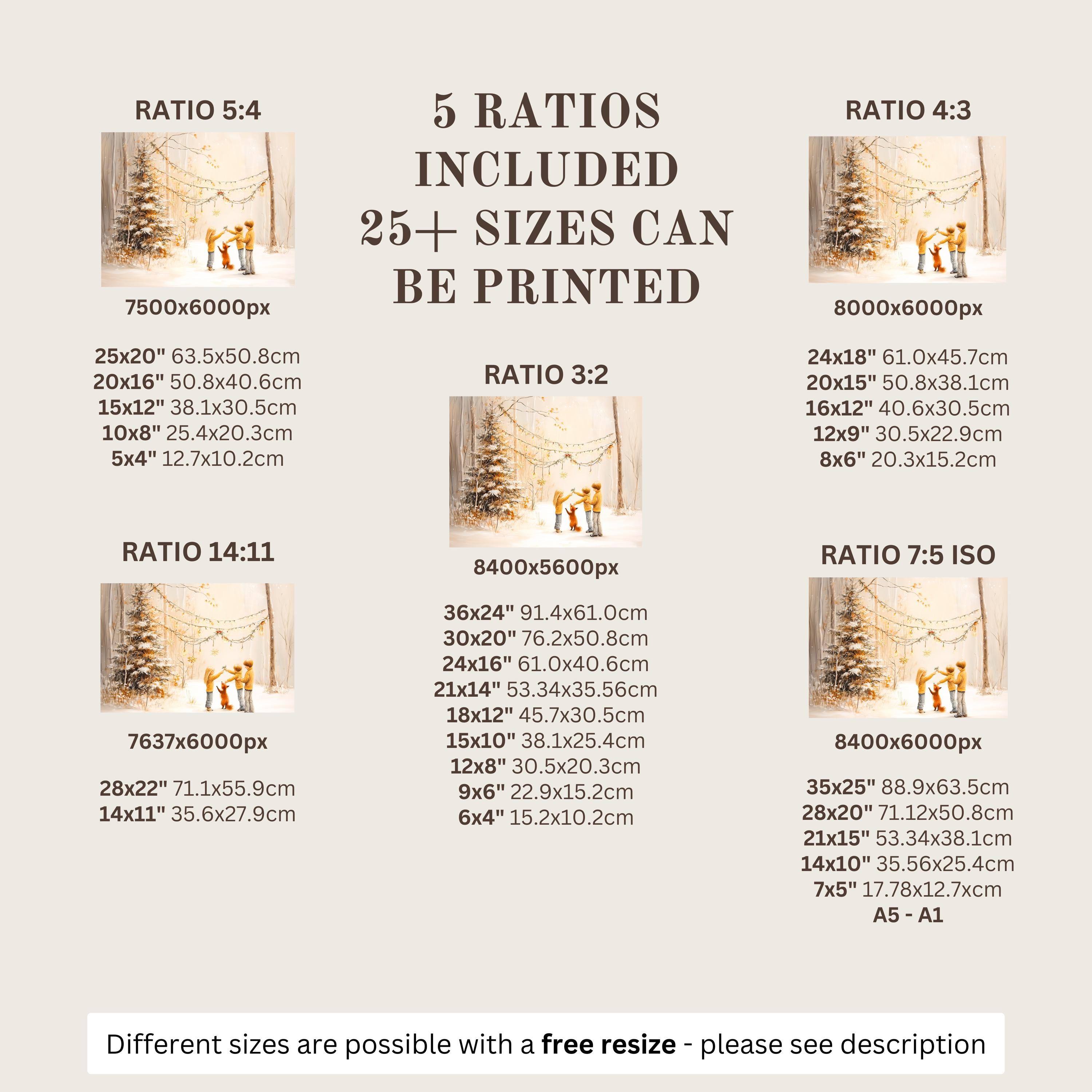 Each artwork includes 5 aspect ratios with 25+ print sizes. Most standard frames are covered. One custom resize per purchase available—message before ordering.