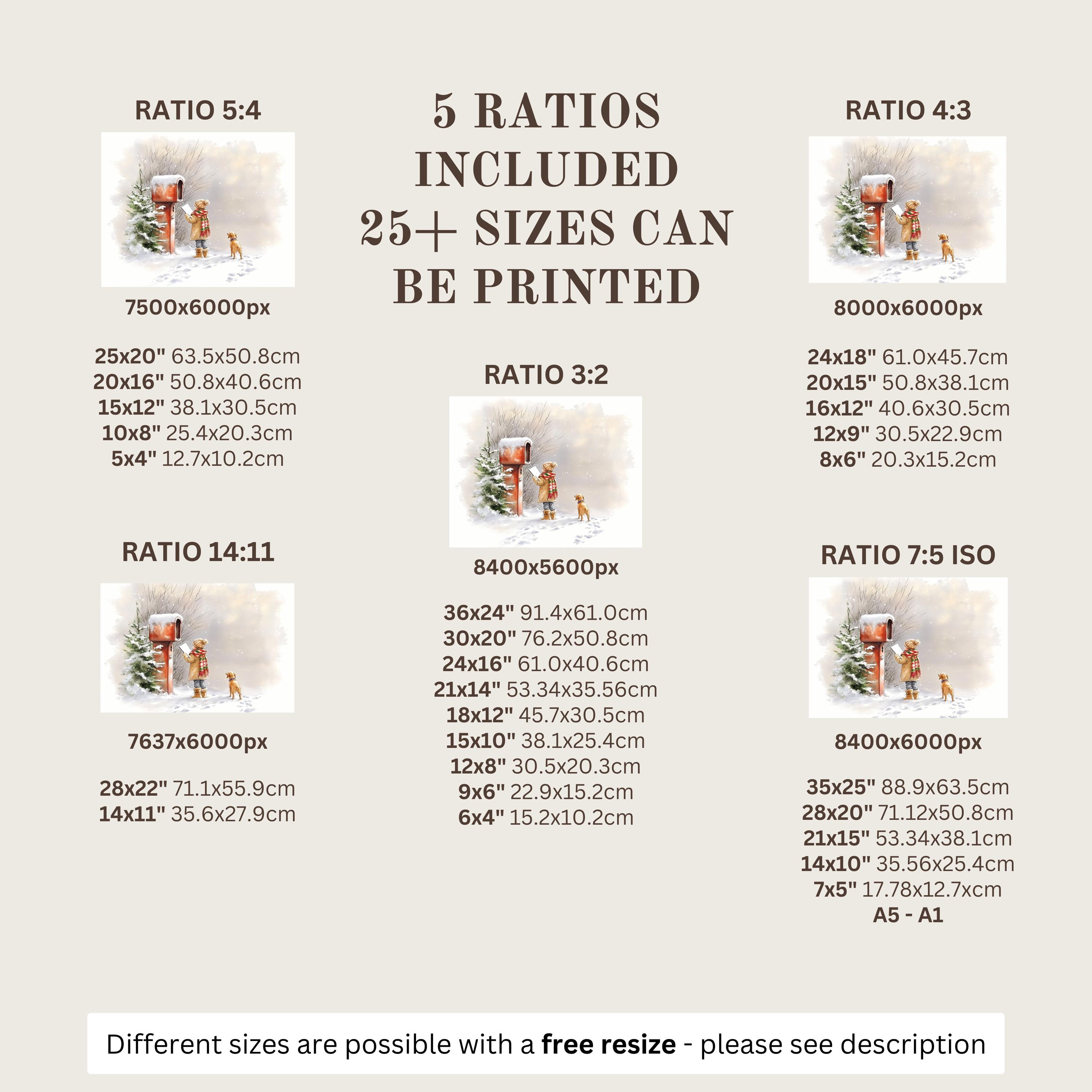 Each artwork includes 5 aspect ratios with 25+ print sizes. Most standard frames are covered. One custom resize per purchase available—message before ordering.