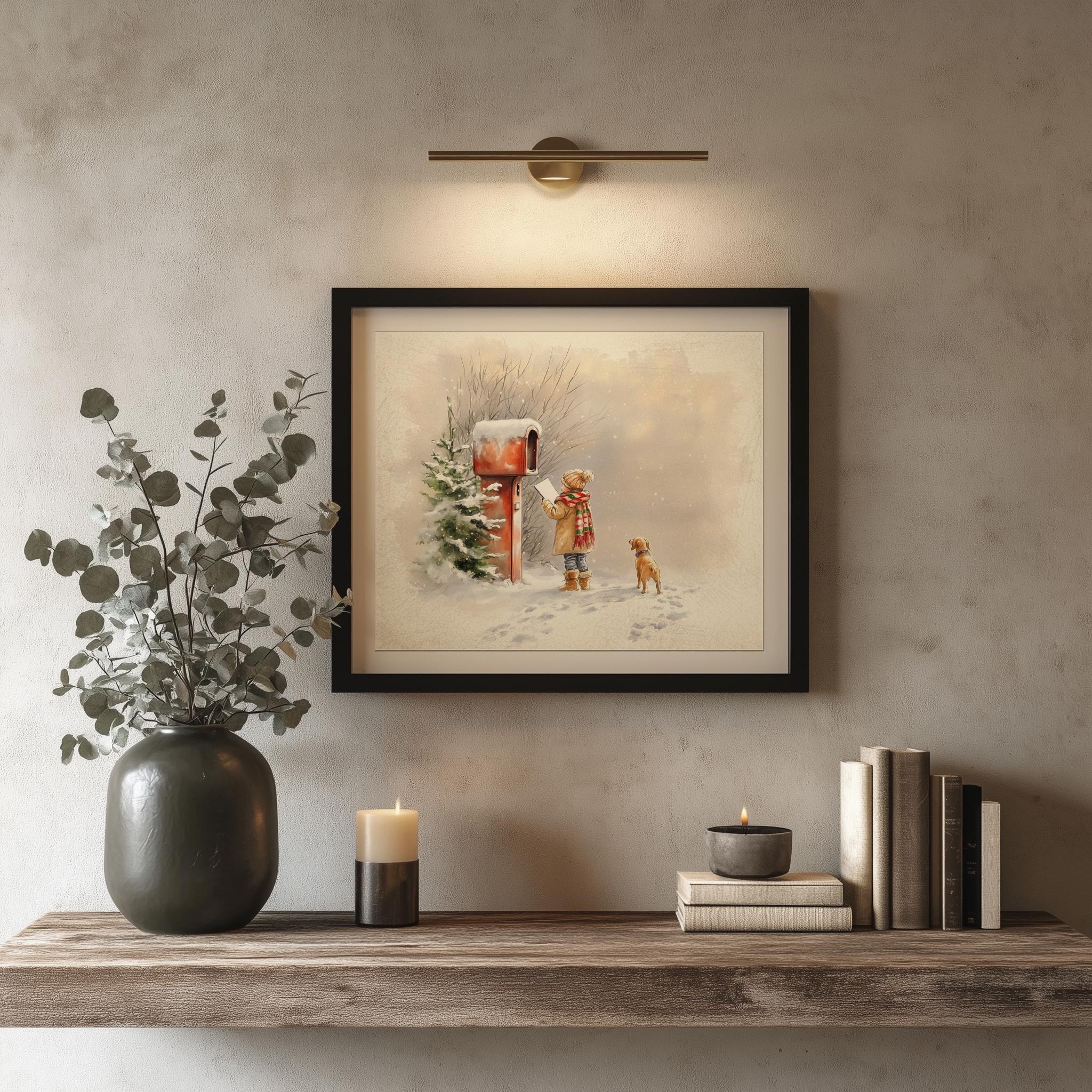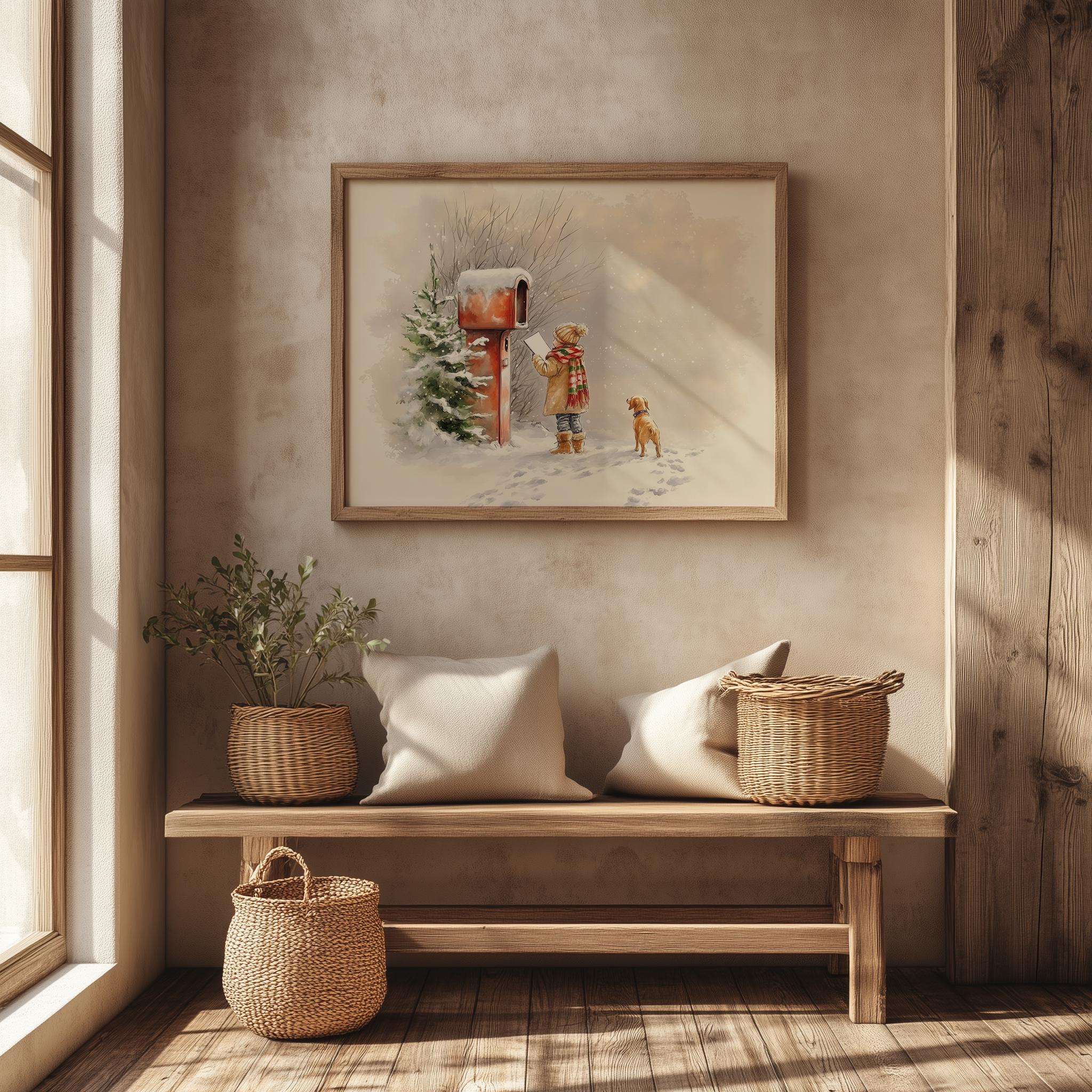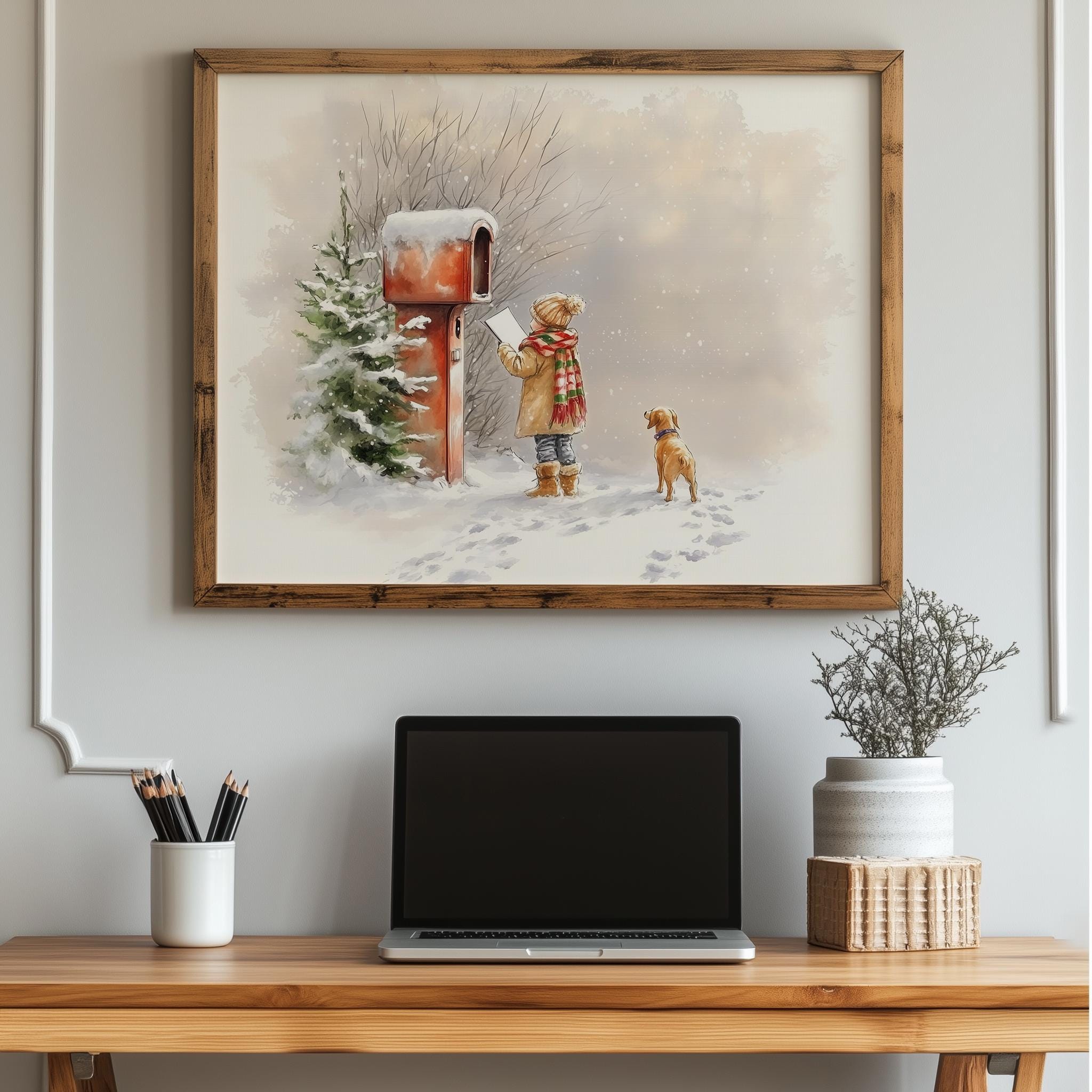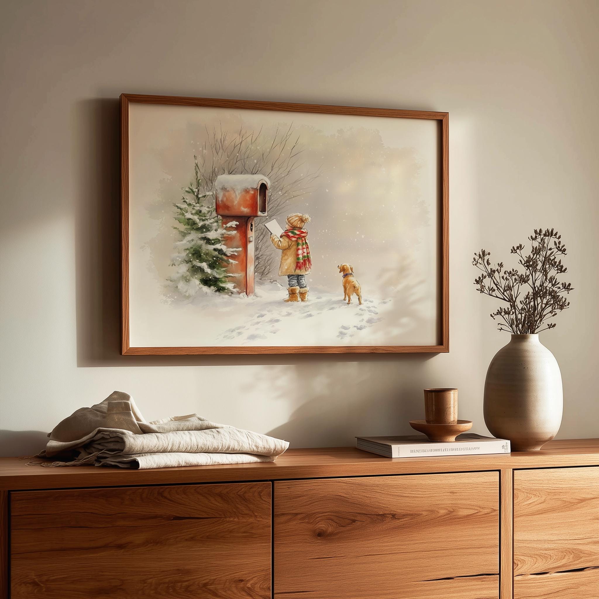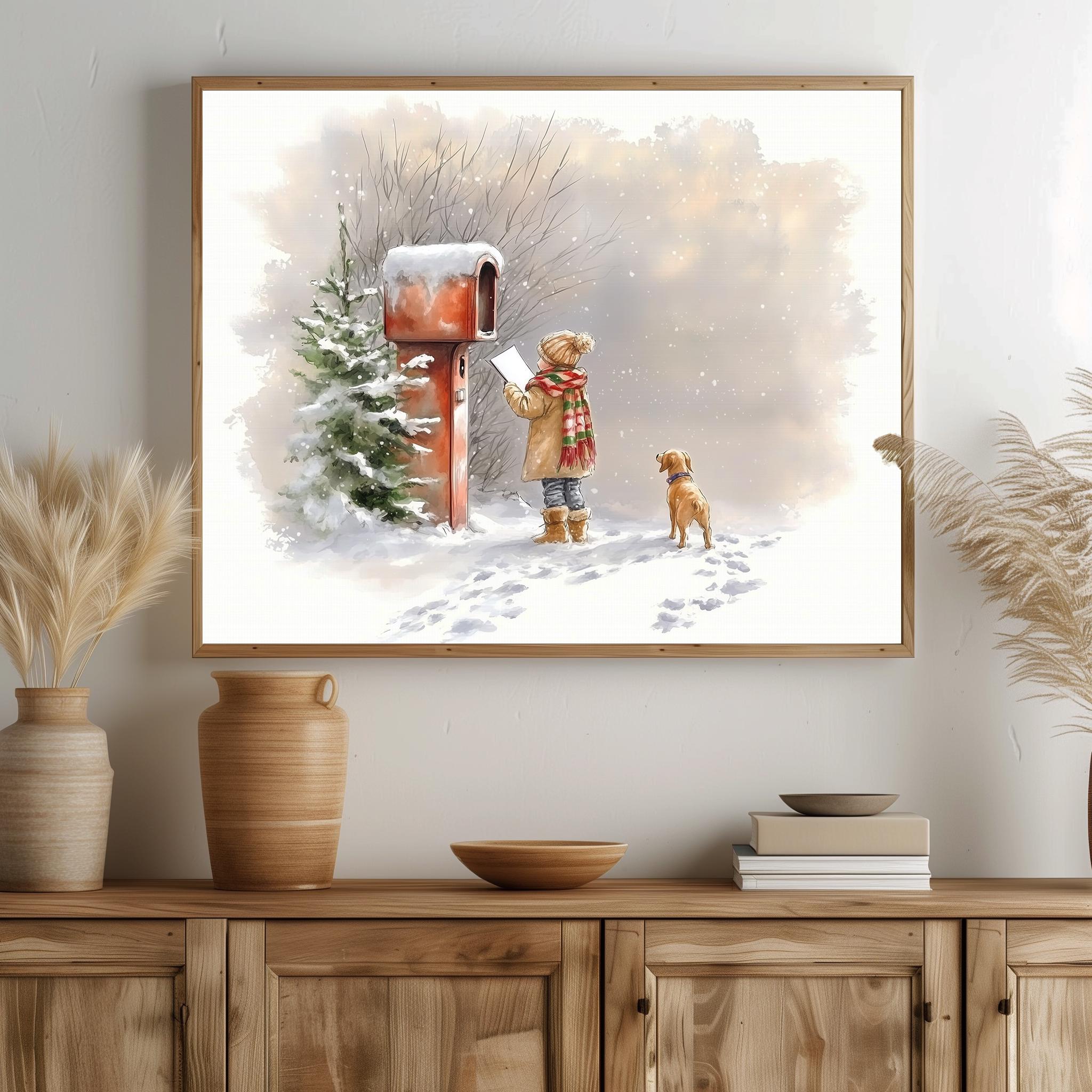 Immerse yourself in the charm with this rustic painting of a young child joyfully mailing a letter to Santa amidst a serene snowy landscape. An instantly downloadable print, it's perfect for elevating your decor with budget-friendly charm. This gives you the flexibility to customize the size, frame, and material according to your personal taste and space, ensuring a perfect fit for your walls.