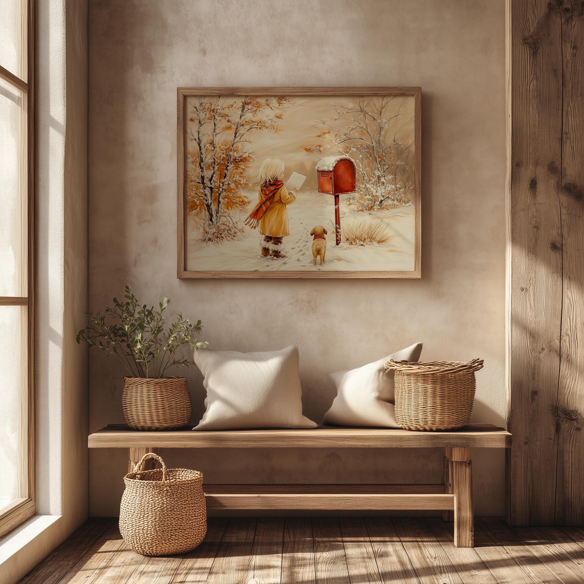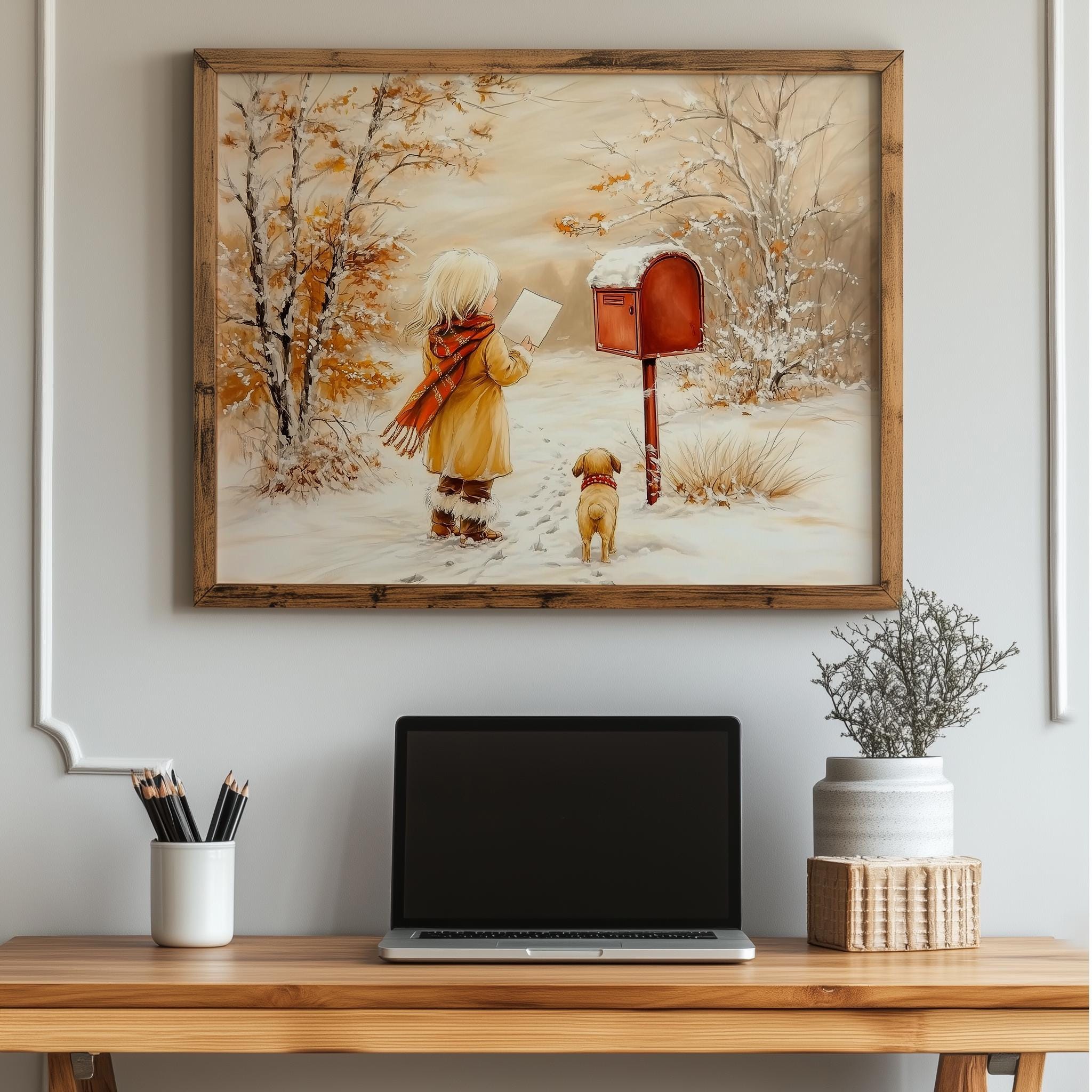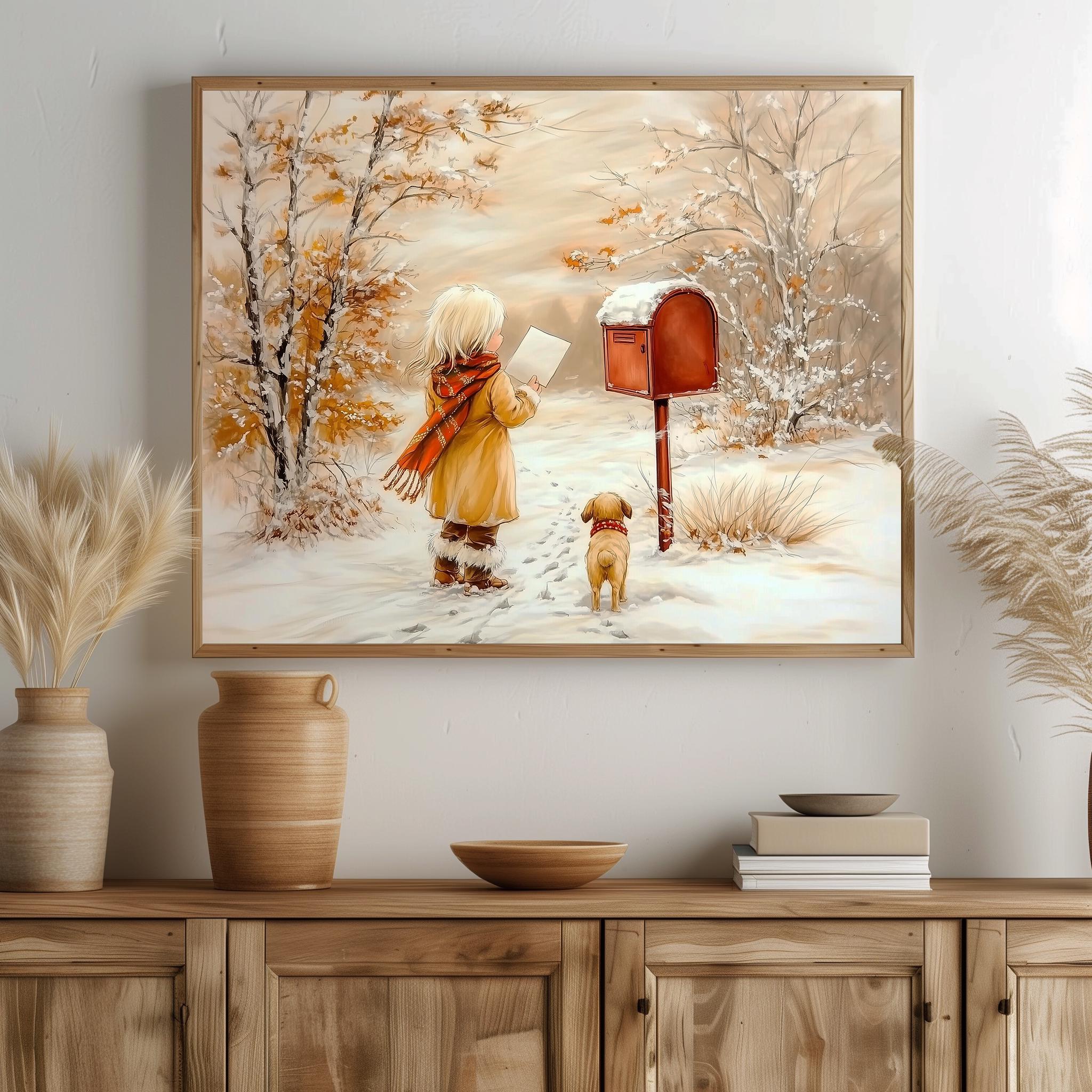 Immerse yourself in the charm with this rustic painting of a child joyfully mailing a letter to Santa. An instantly downloadable print, it's perfect for elevating your decor with budget-friendly charm. This gives you the flexibility to customize the size, frame, and material according to your personal taste and space, ensuring a perfect fit for your walls.