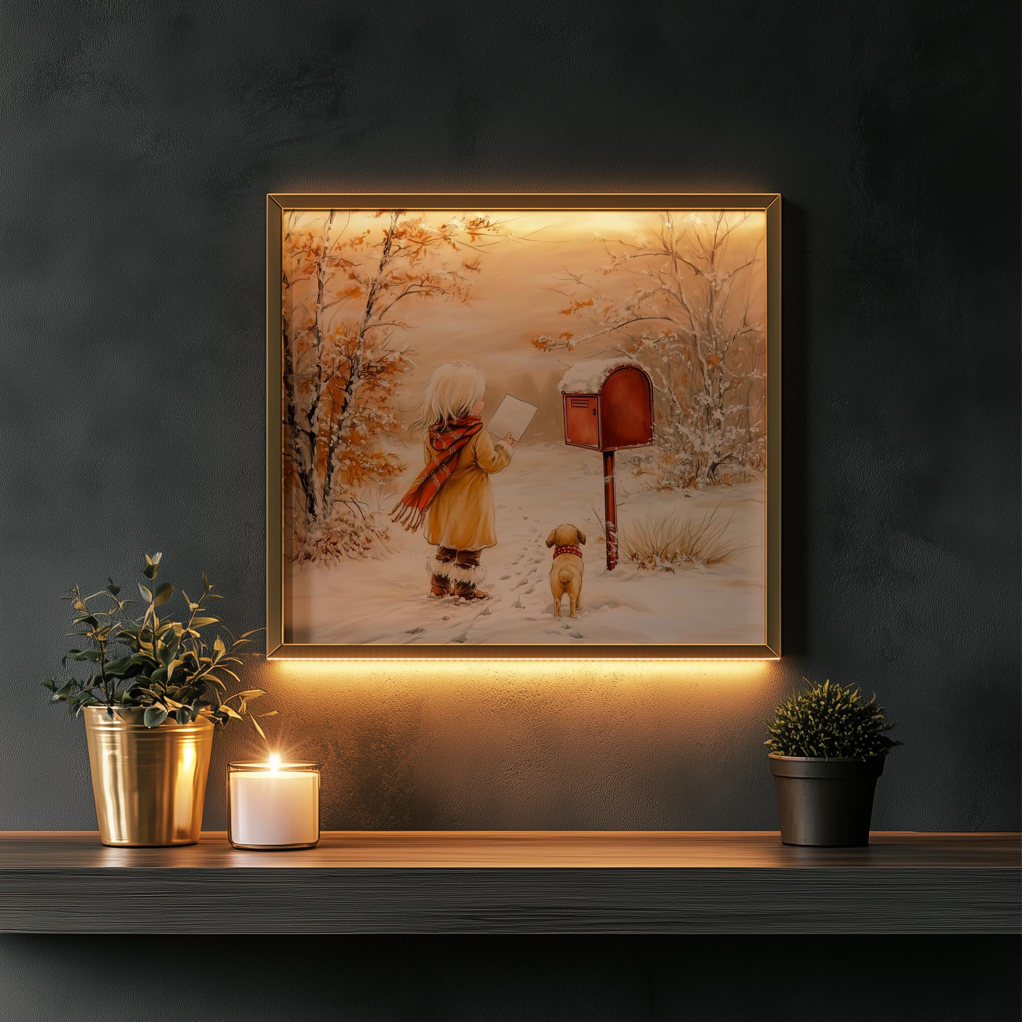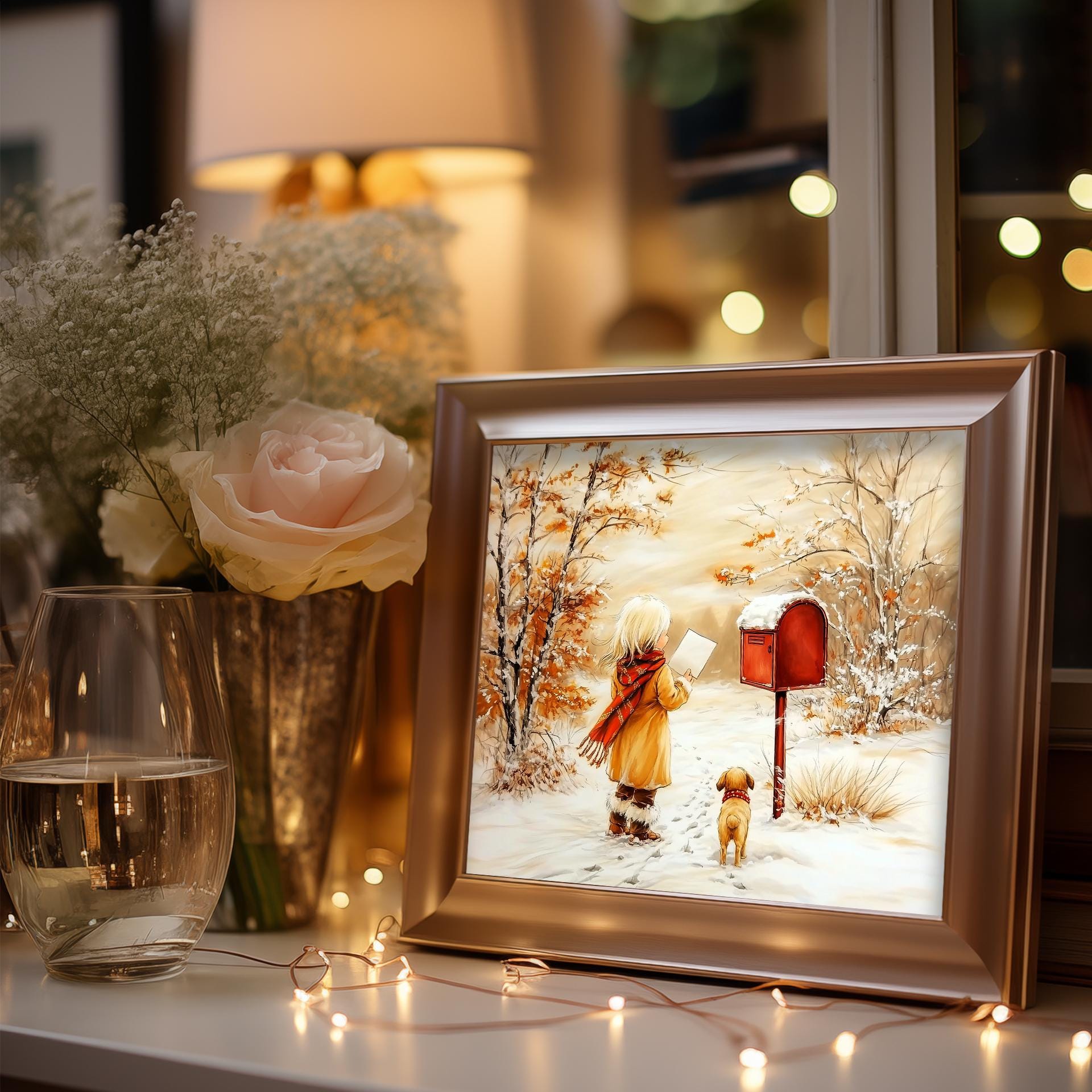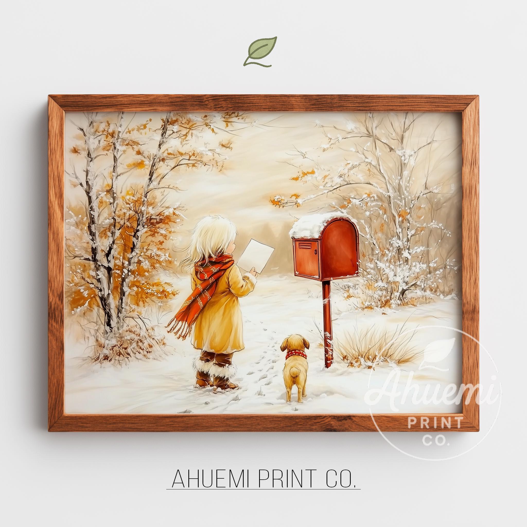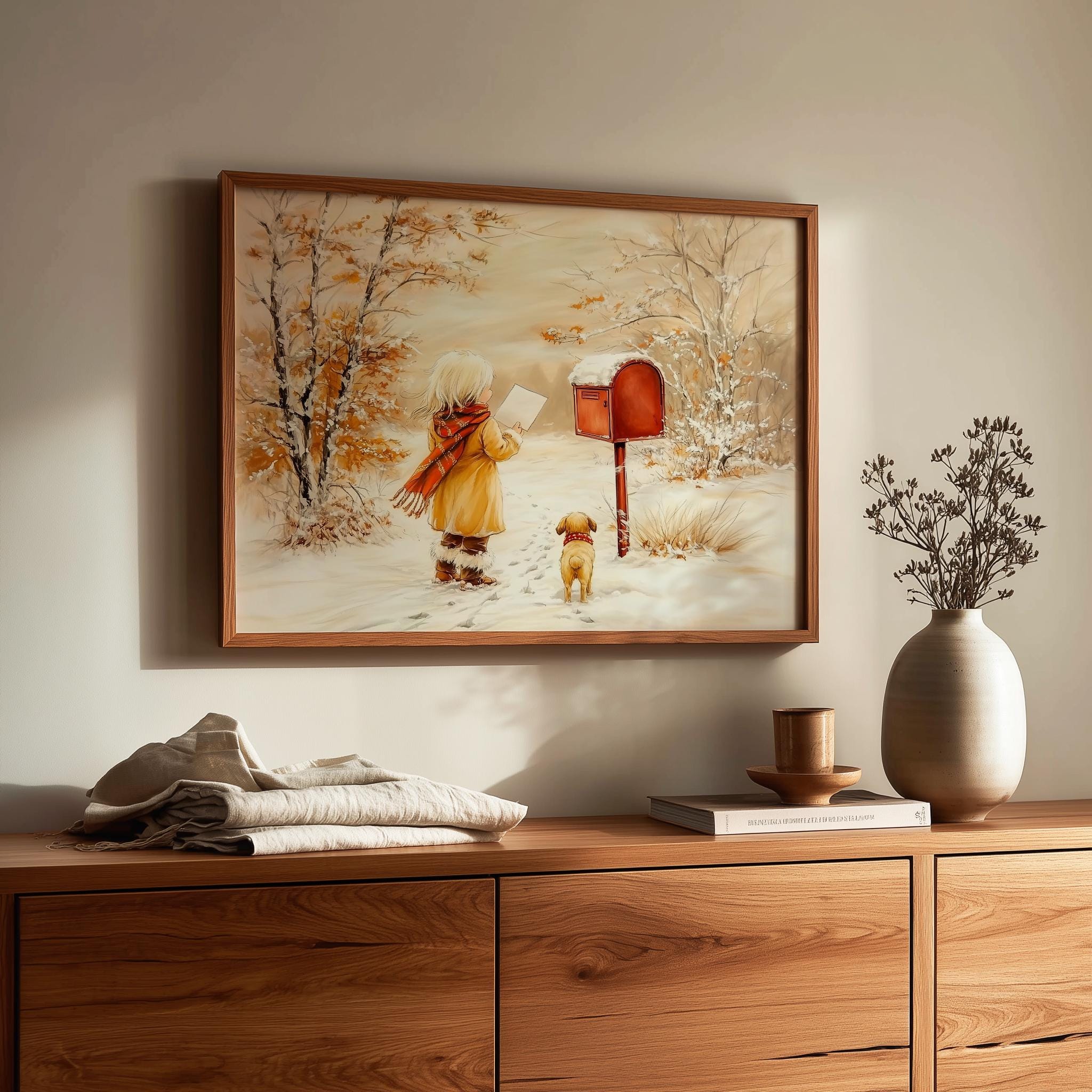 Immerse yourself in the charm with this rustic painting of a child joyfully mailing a letter to Santa. An instantly downloadable print, it's perfect for elevating your decor with budget-friendly charm. This gives you the flexibility to customize the size, frame, and material according to your personal taste and space, ensuring a perfect fit for your walls.
