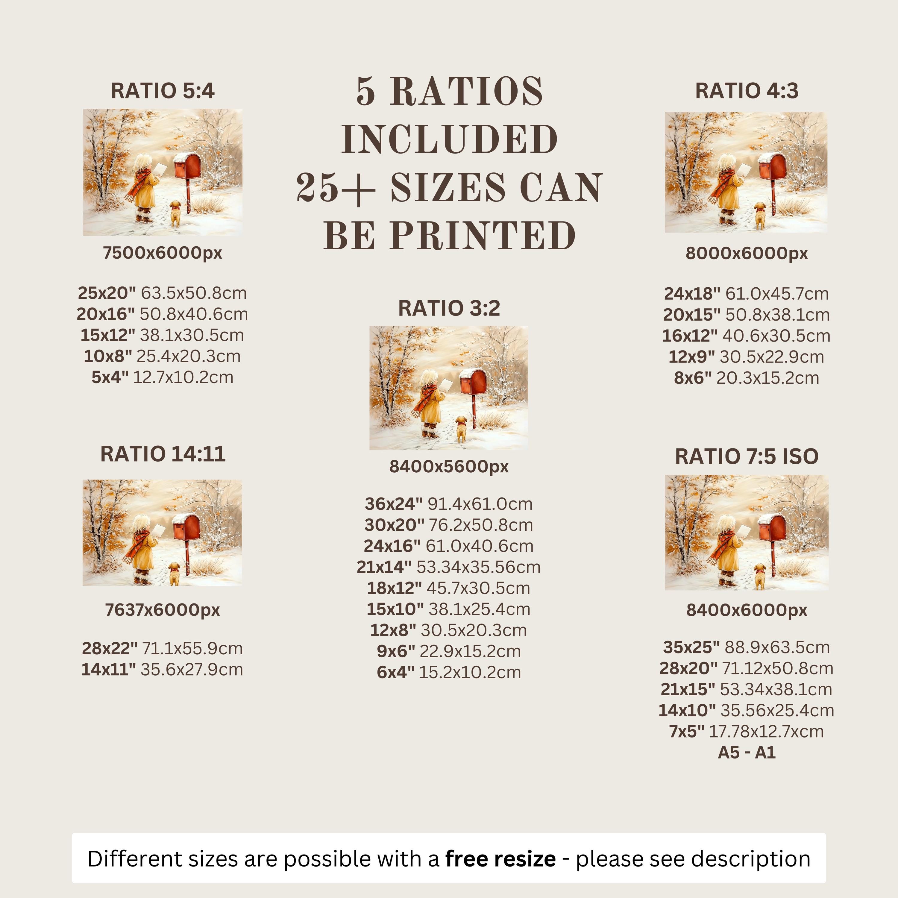 Each artwork includes 5 aspect ratios with 25+ print sizes. Most standard frames are covered. One custom resize per purchase available—message before ordering.