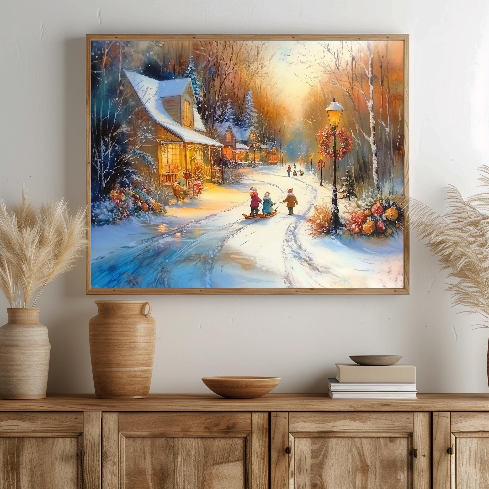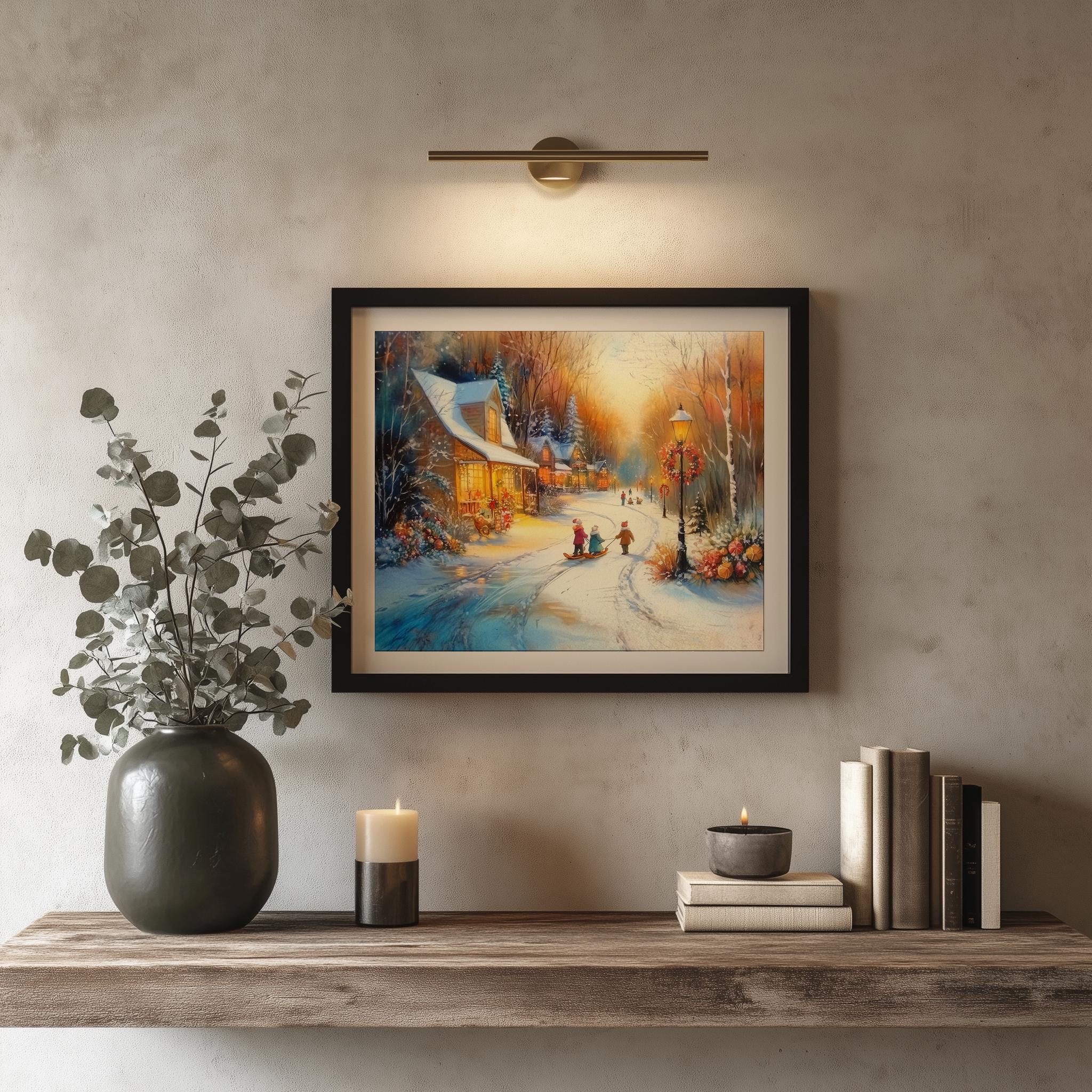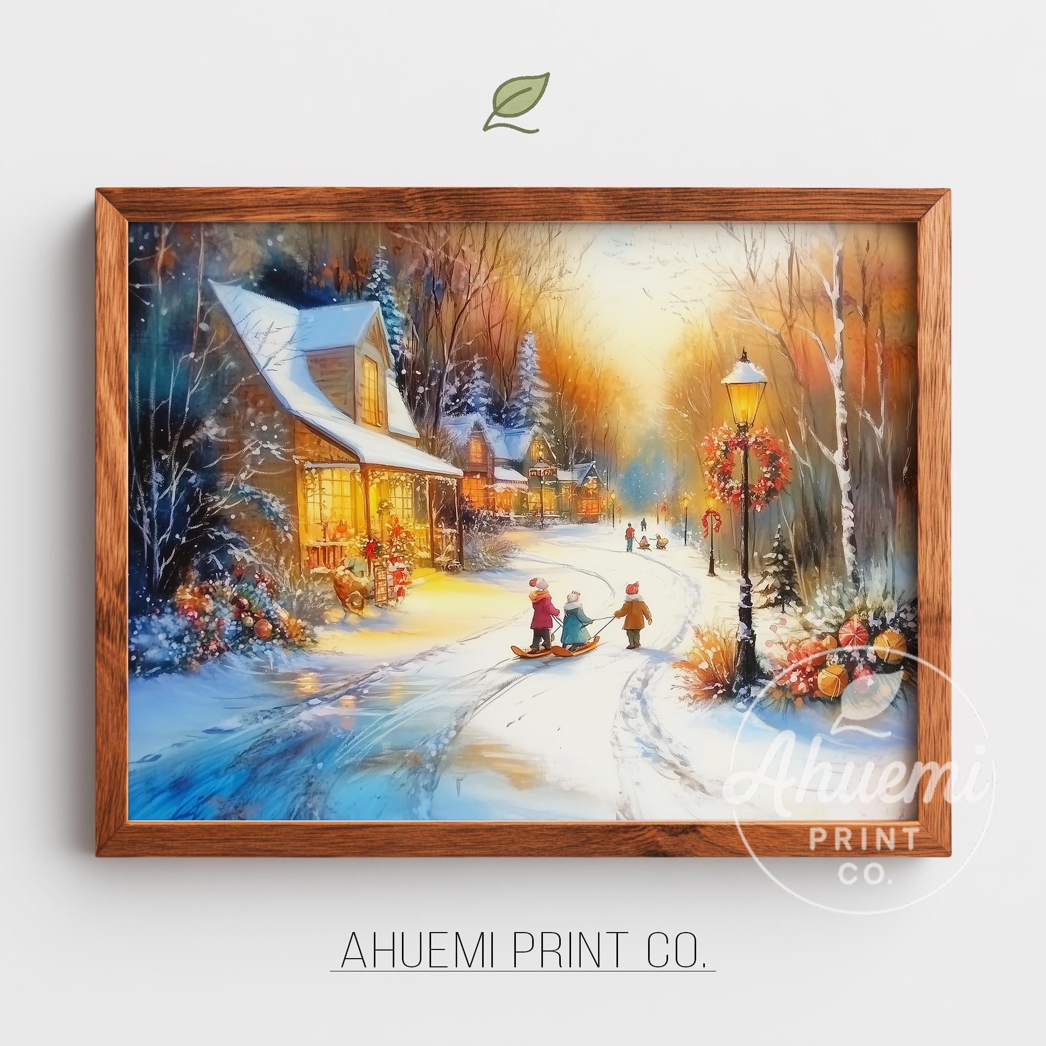 Immerse yourself in the charm with this rustic painting of a quaint snowy village street at twilight, featuring vintage children playing joyfully in the snow. An instantly downloadable print, it's perfect for elevating your decor with budget-friendly charm. This gives you the flexibility to customize the size, frame, and material according to your personal taste and space, ensuring a perfect fit for your walls.