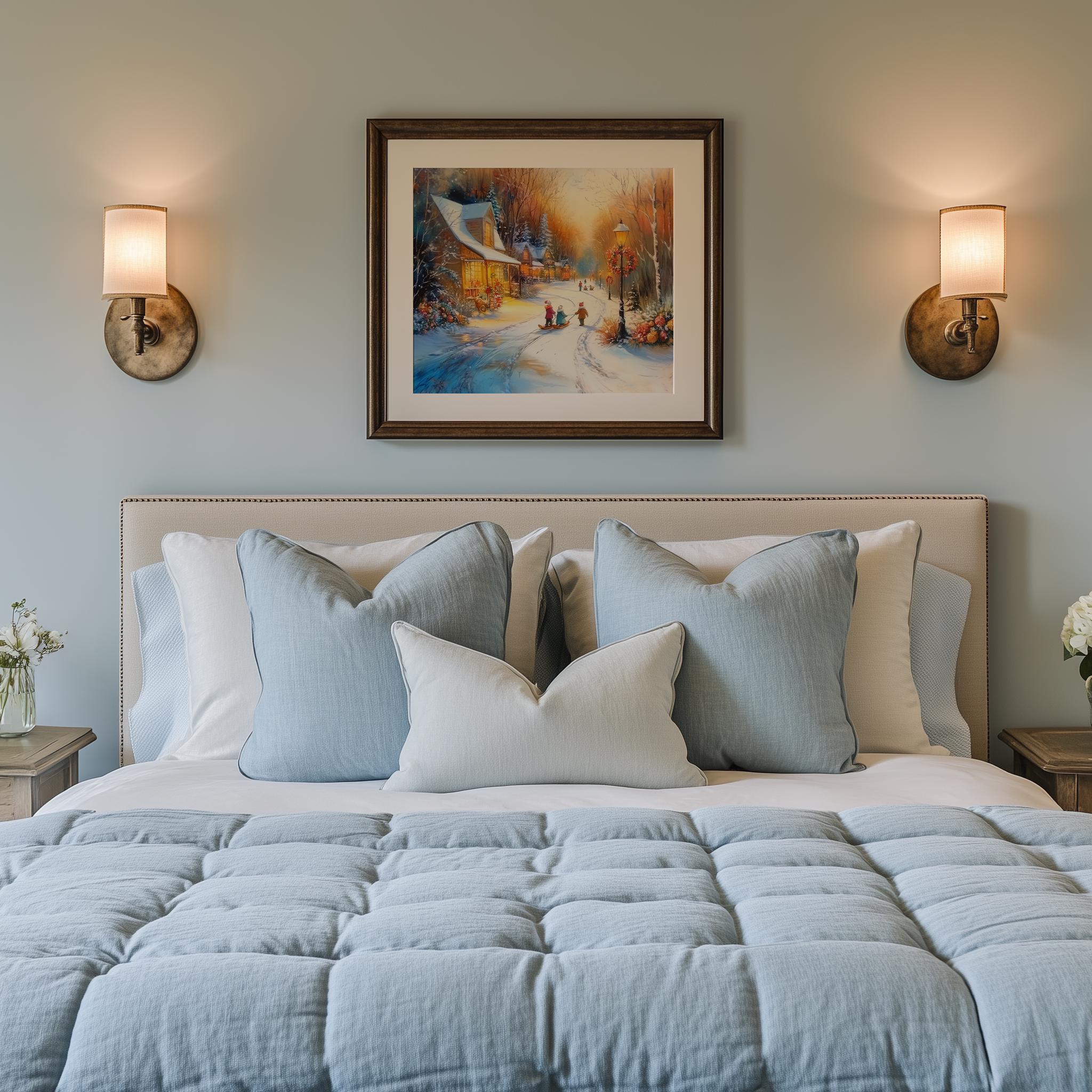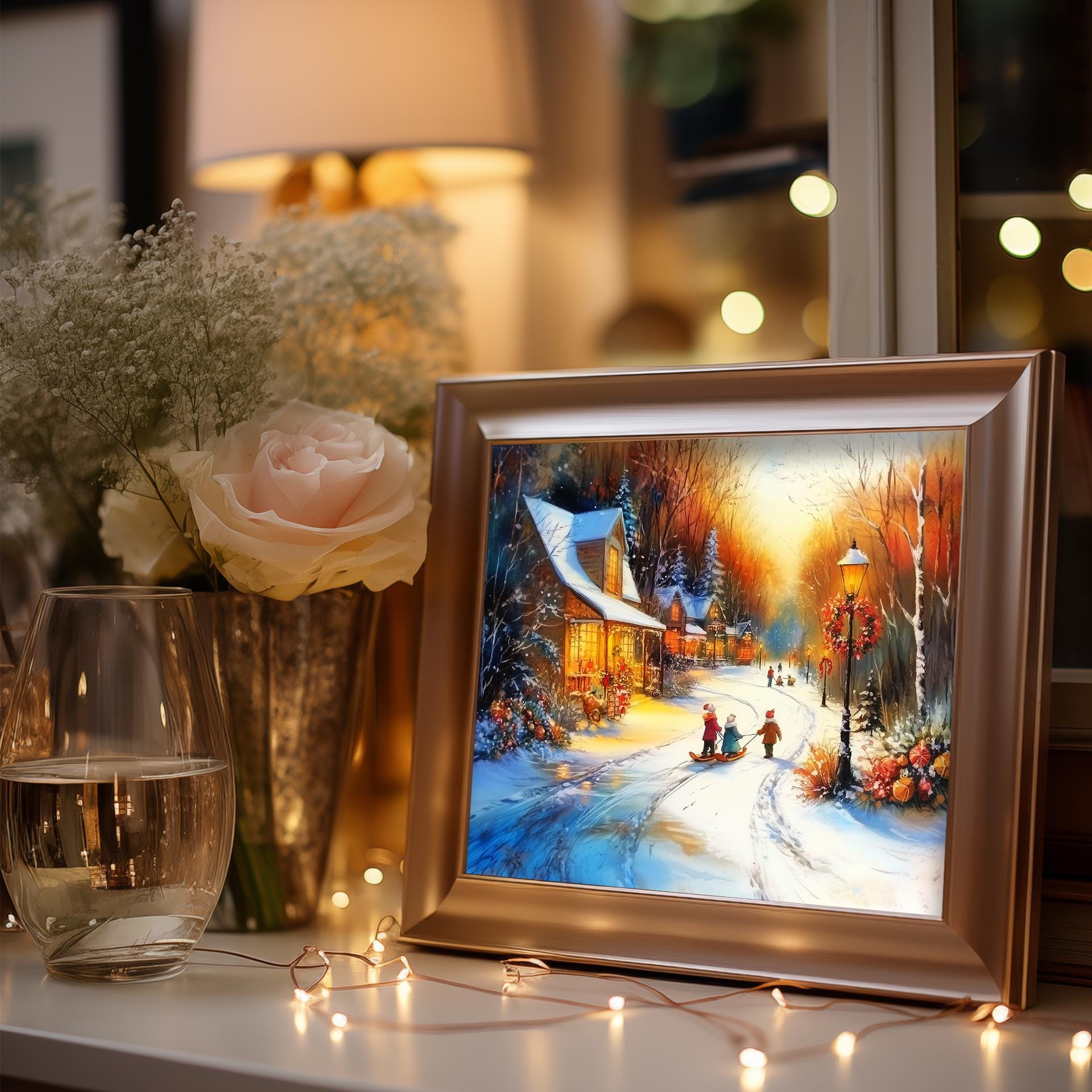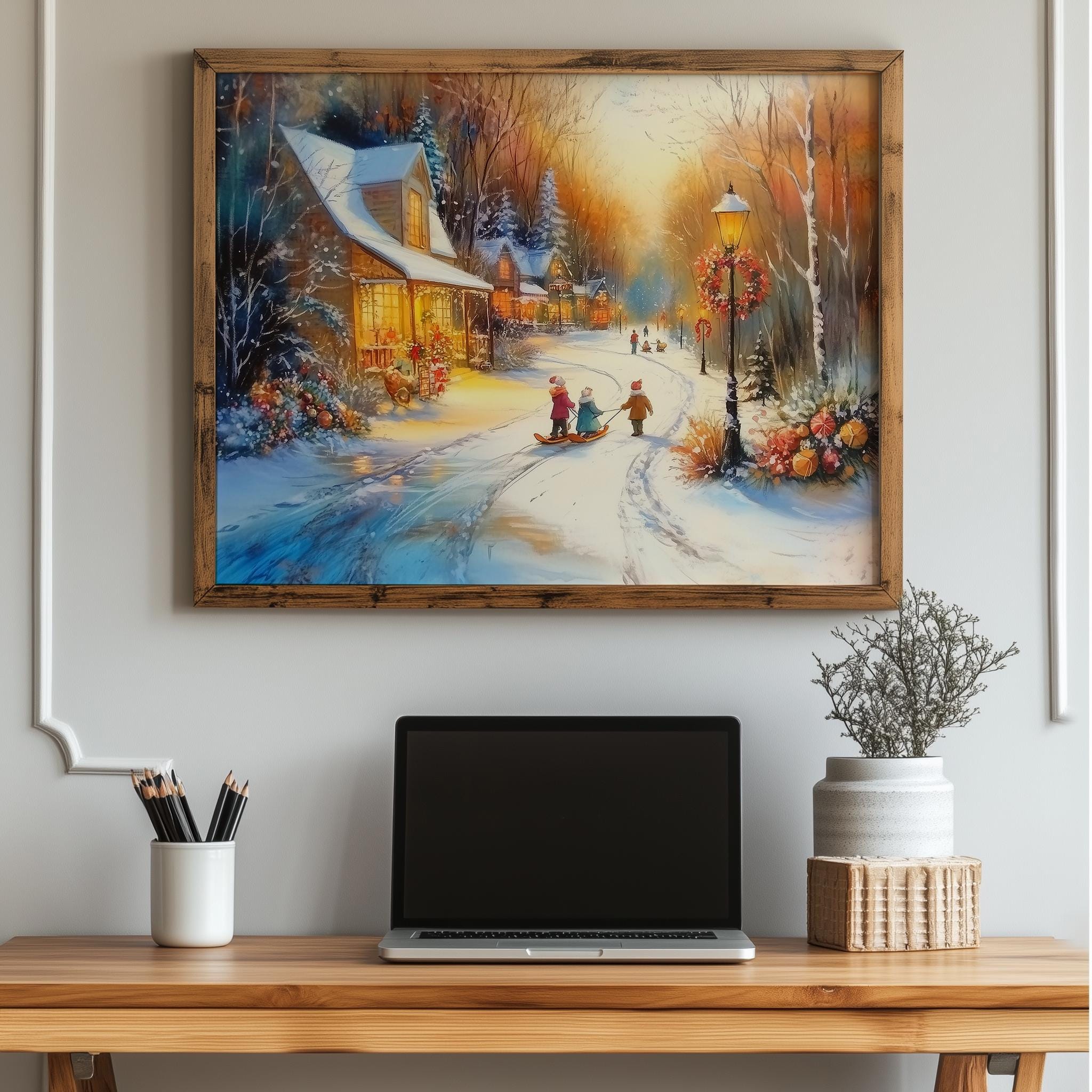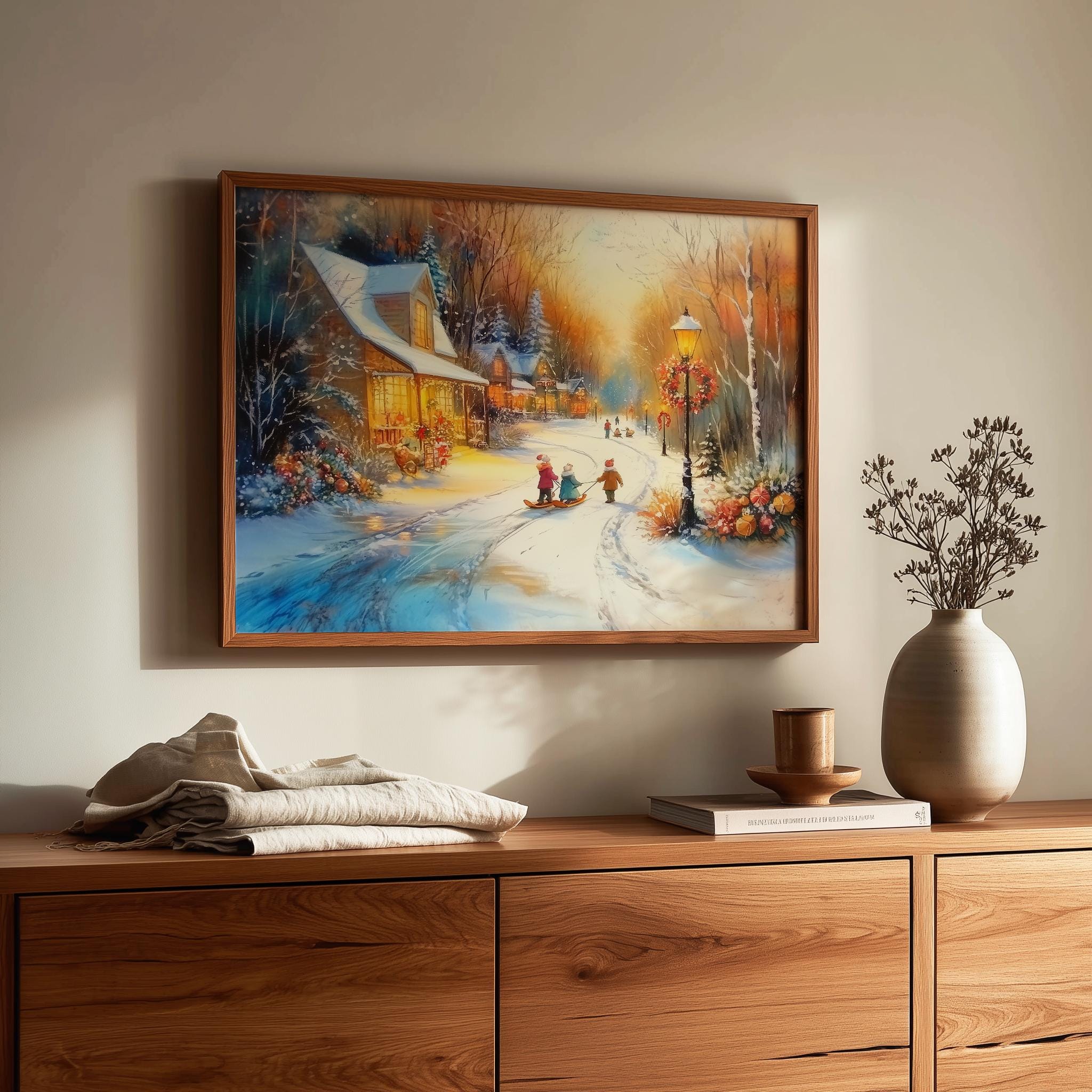 Immerse yourself in the charm with this rustic painting of a quaint snowy village street at twilight, featuring vintage children playing joyfully in the snow. An instantly downloadable print, it's perfect for elevating your decor with budget-friendly charm. This gives you the flexibility to customize the size, frame, and material according to your personal taste and space, ensuring a perfect fit for your walls.