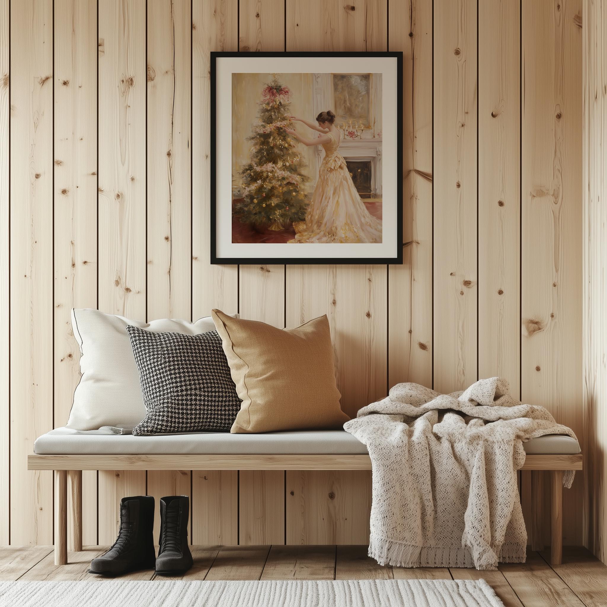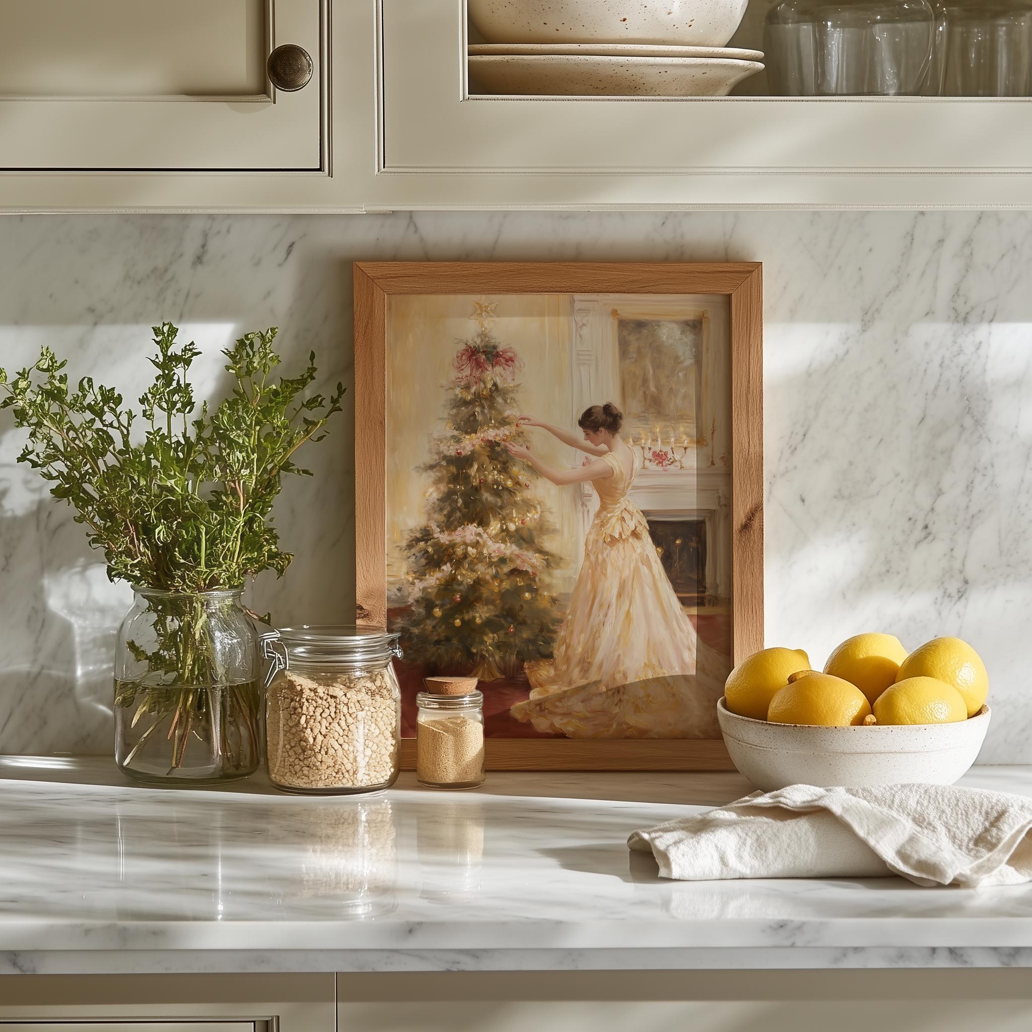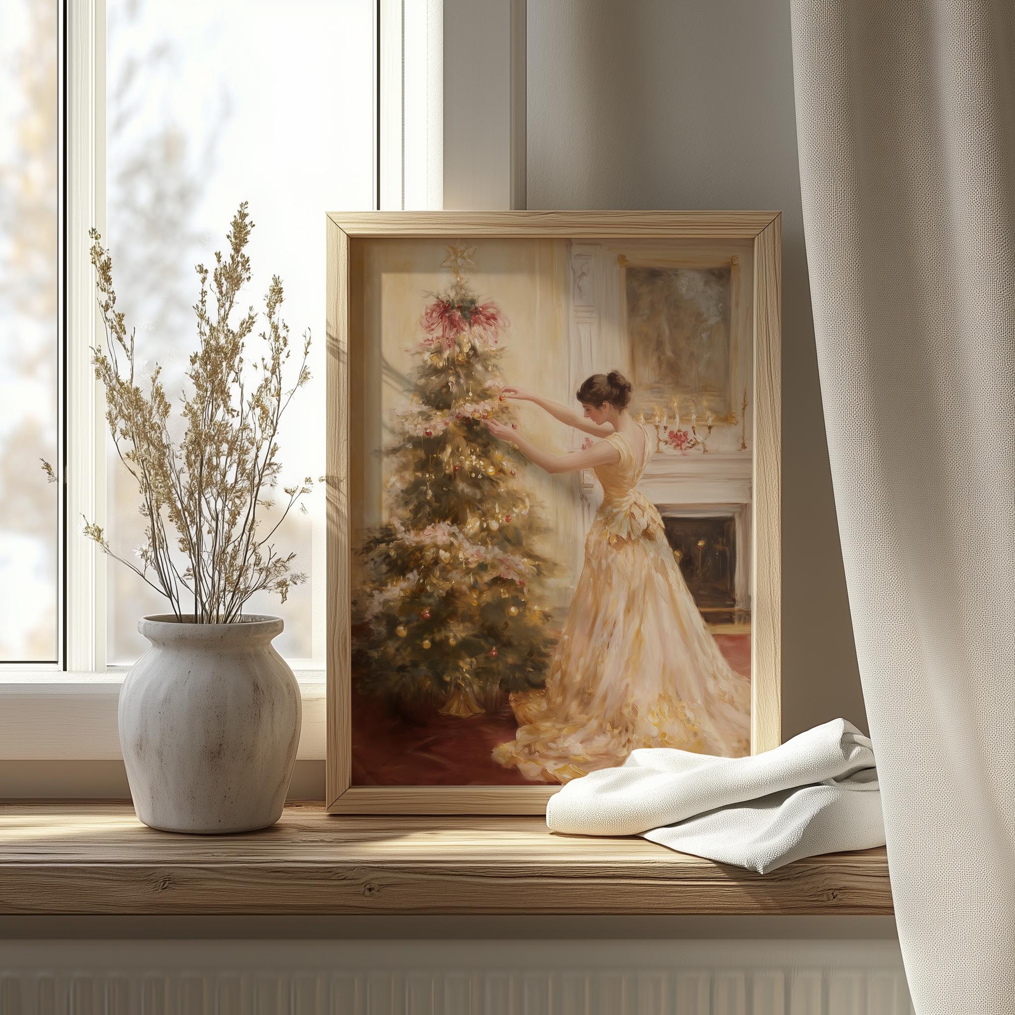Immerse yourself in the charm with this rustic painting of an elegant woman in a satin gown, gracefully decorating a pastel pink Christmas tree. An instantly downloadable print, it's perfect for elevating your decor with budget-friendly charm. This gives you the flexibility to customize the size, frame, and material according to your personal taste and space, ensuring a perfect fit for your walls.