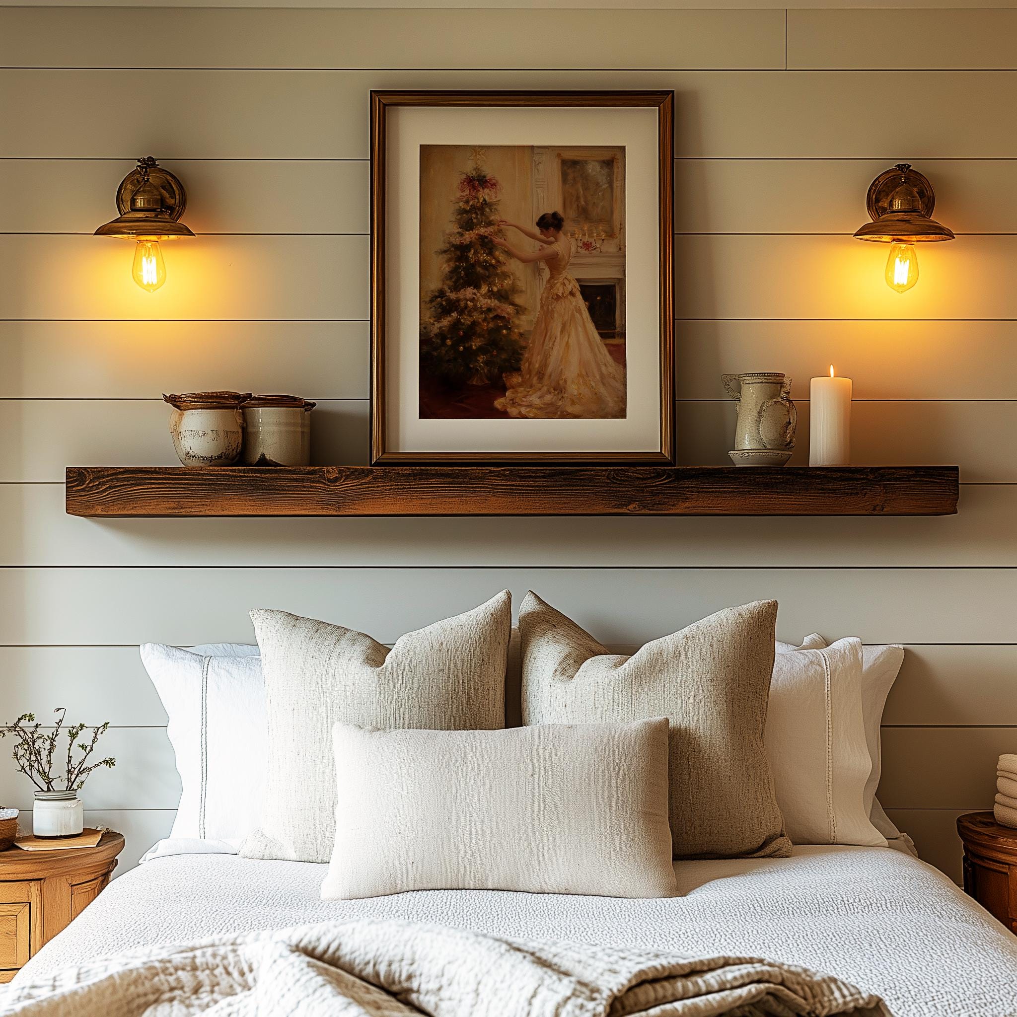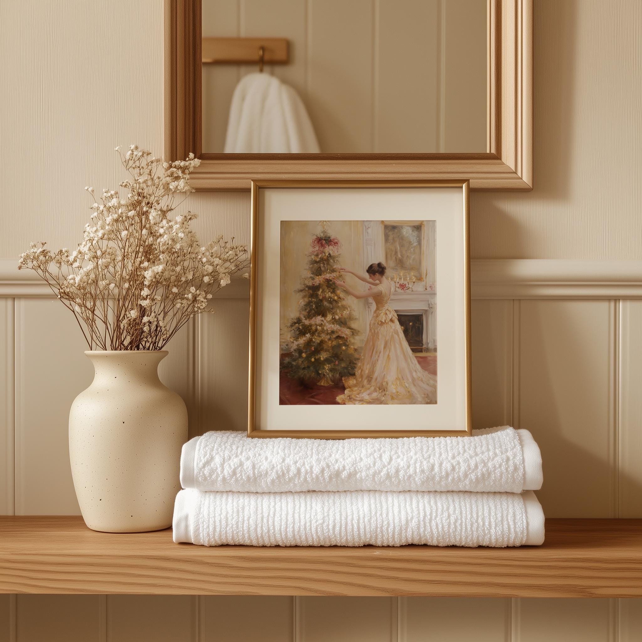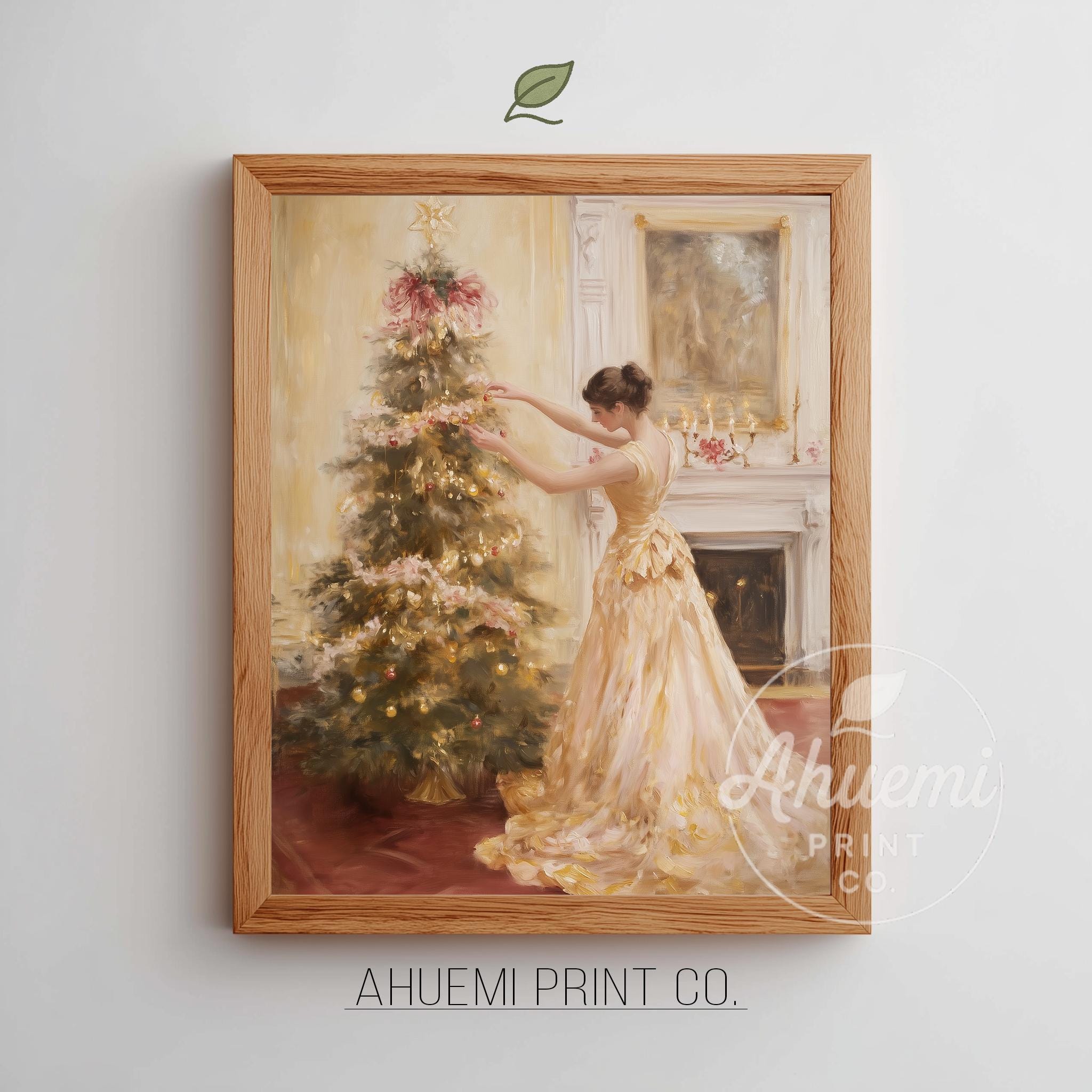 Immerse yourself in the charm with this rustic painting of an elegant woman in a satin gown, gracefully decorating a pastel pink Christmas tree. An instantly downloadable print, it's perfect for elevating your decor with budget-friendly charm. This gives you the flexibility to customize the size, frame, and material according to your personal taste and space, ensuring a perfect fit for your walls.