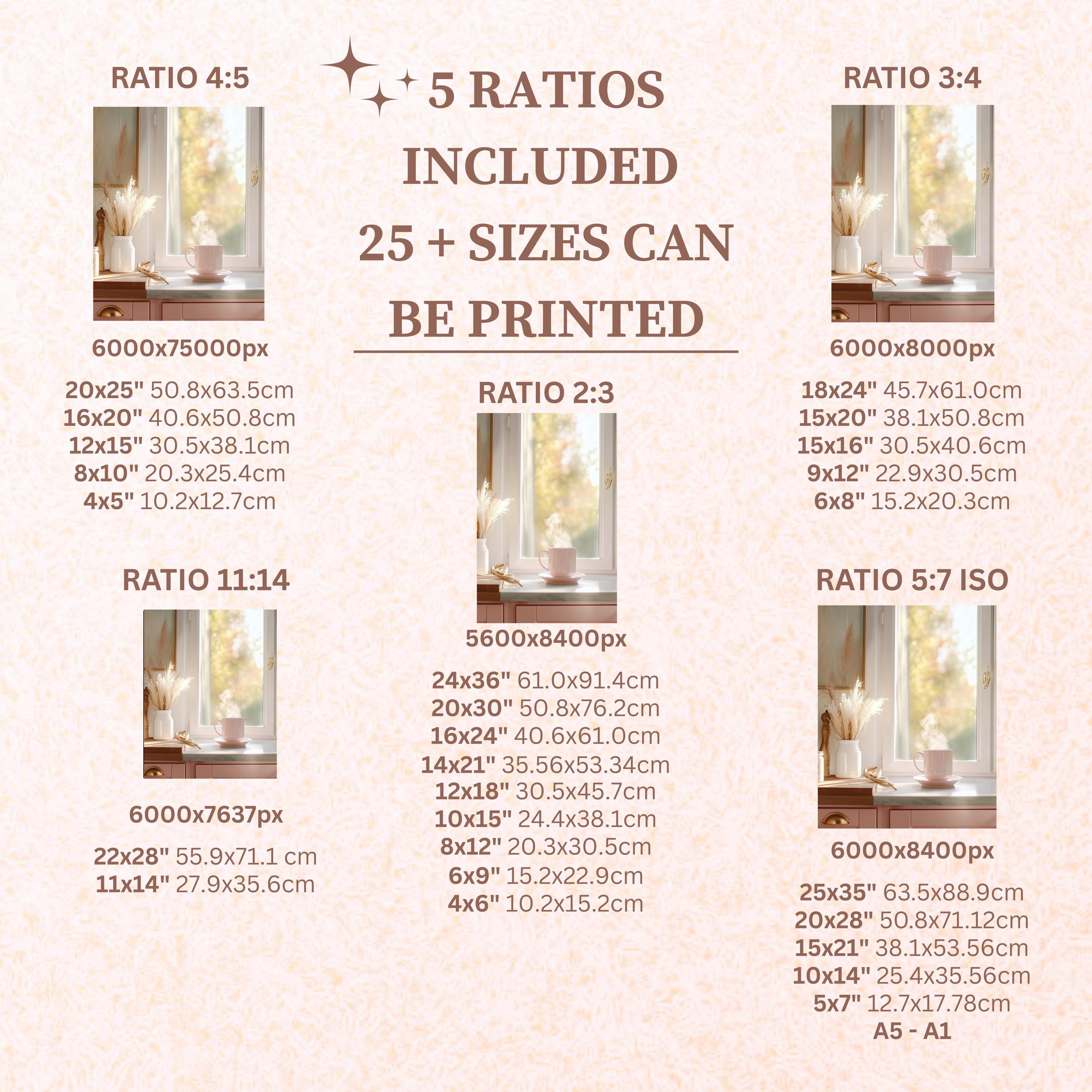 Each artwork includes 5 aspect ratios with 25+ print sizes. Most standard frames are covered. One custom resize per purchase available—message before ordering.