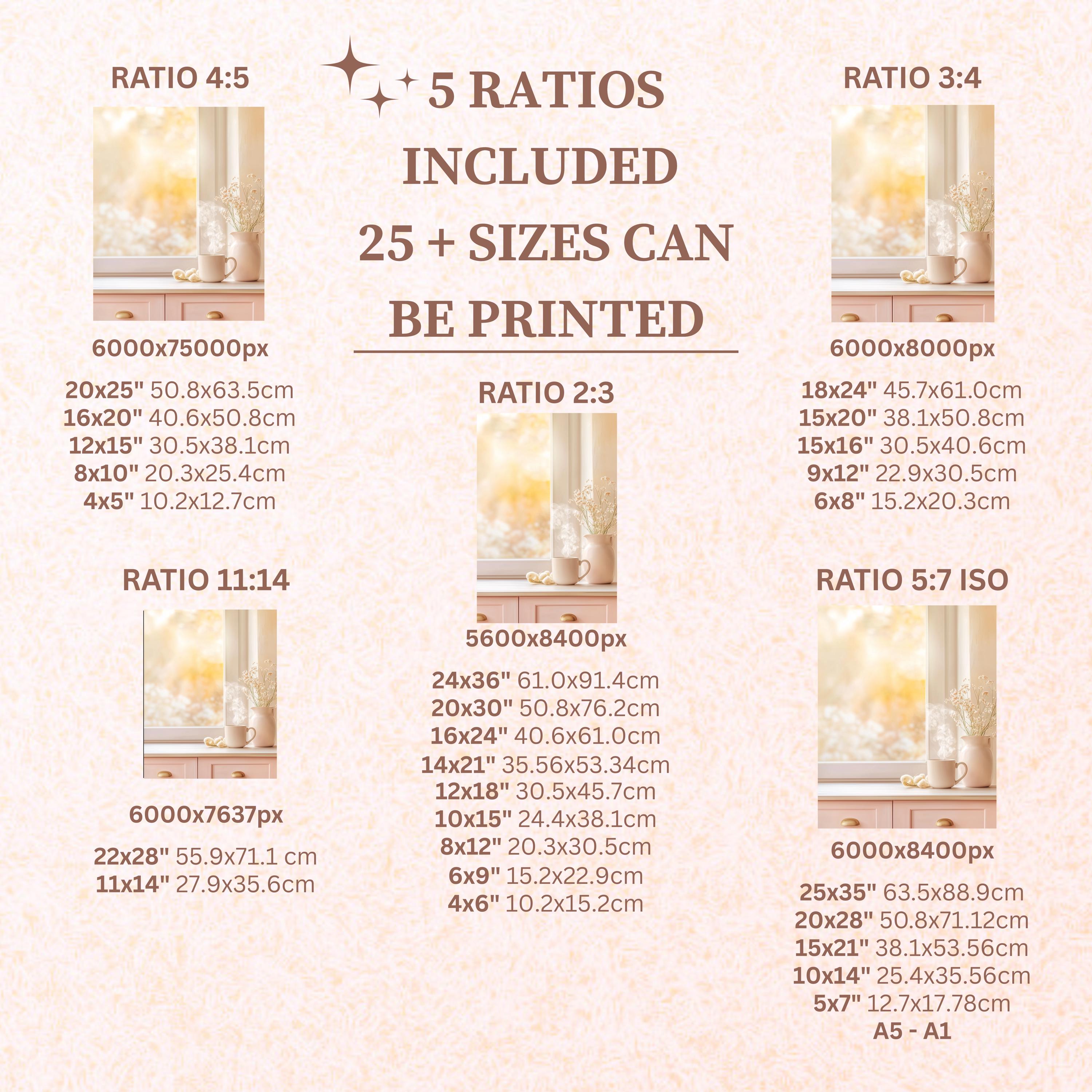 Each artwork includes 5 aspect ratios with 25+ print sizes. Most standard frames are covered. One custom resize per purchase available—message before ordering.