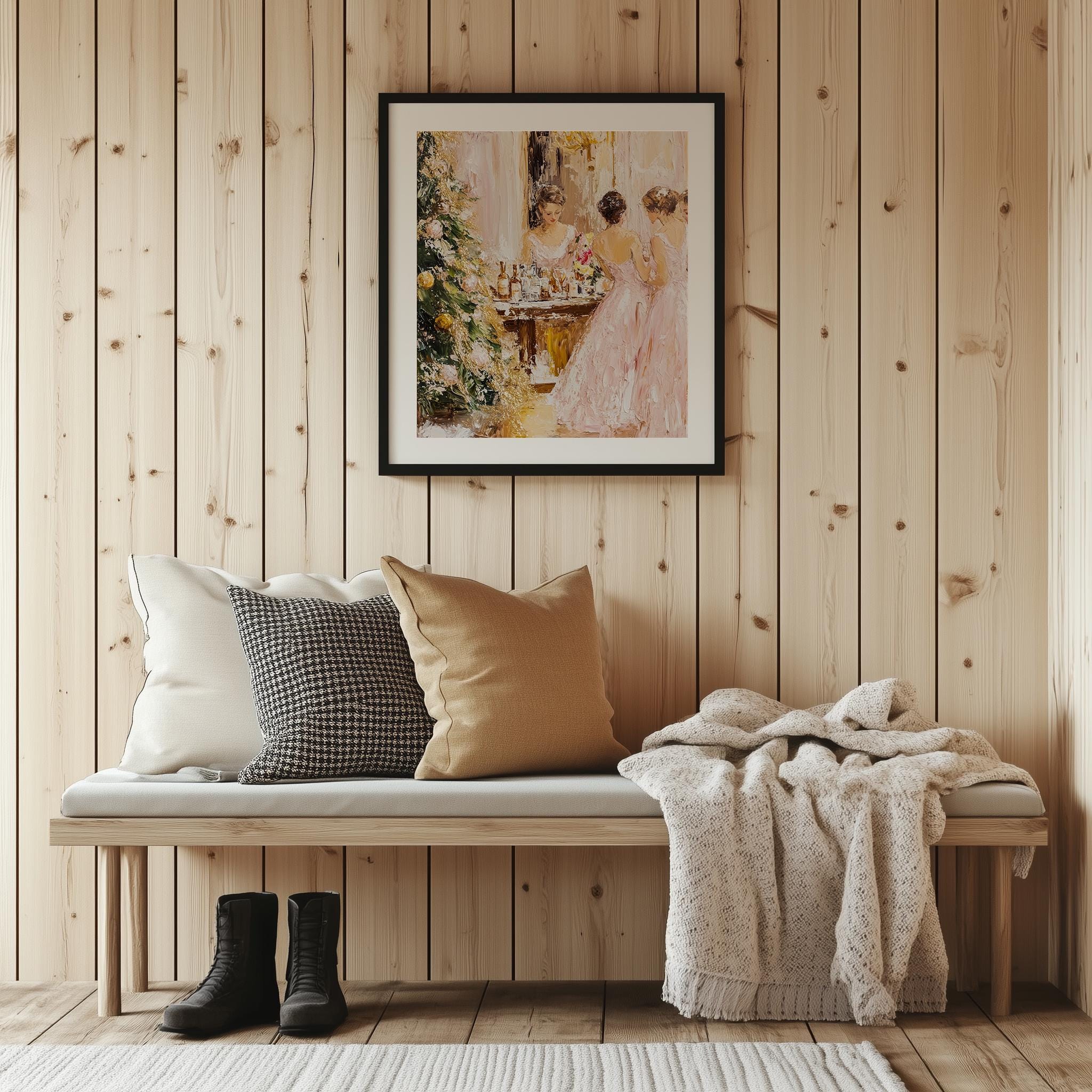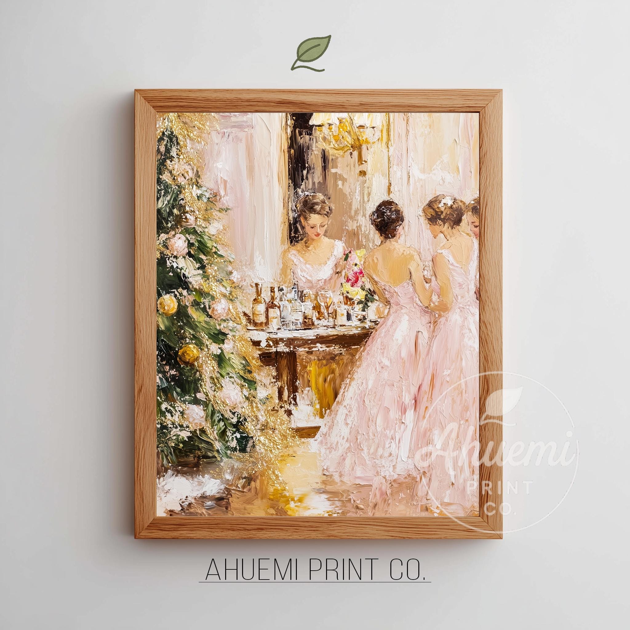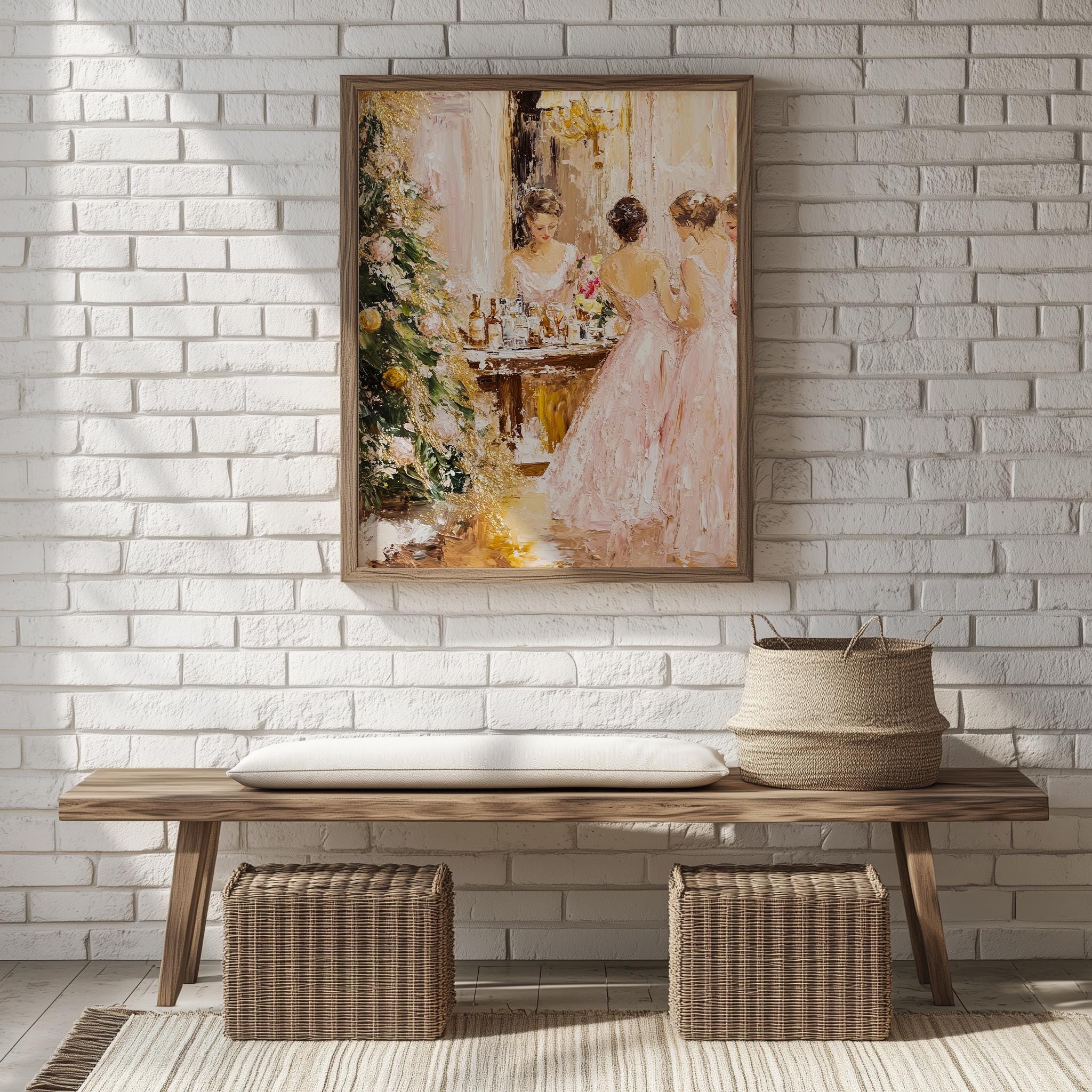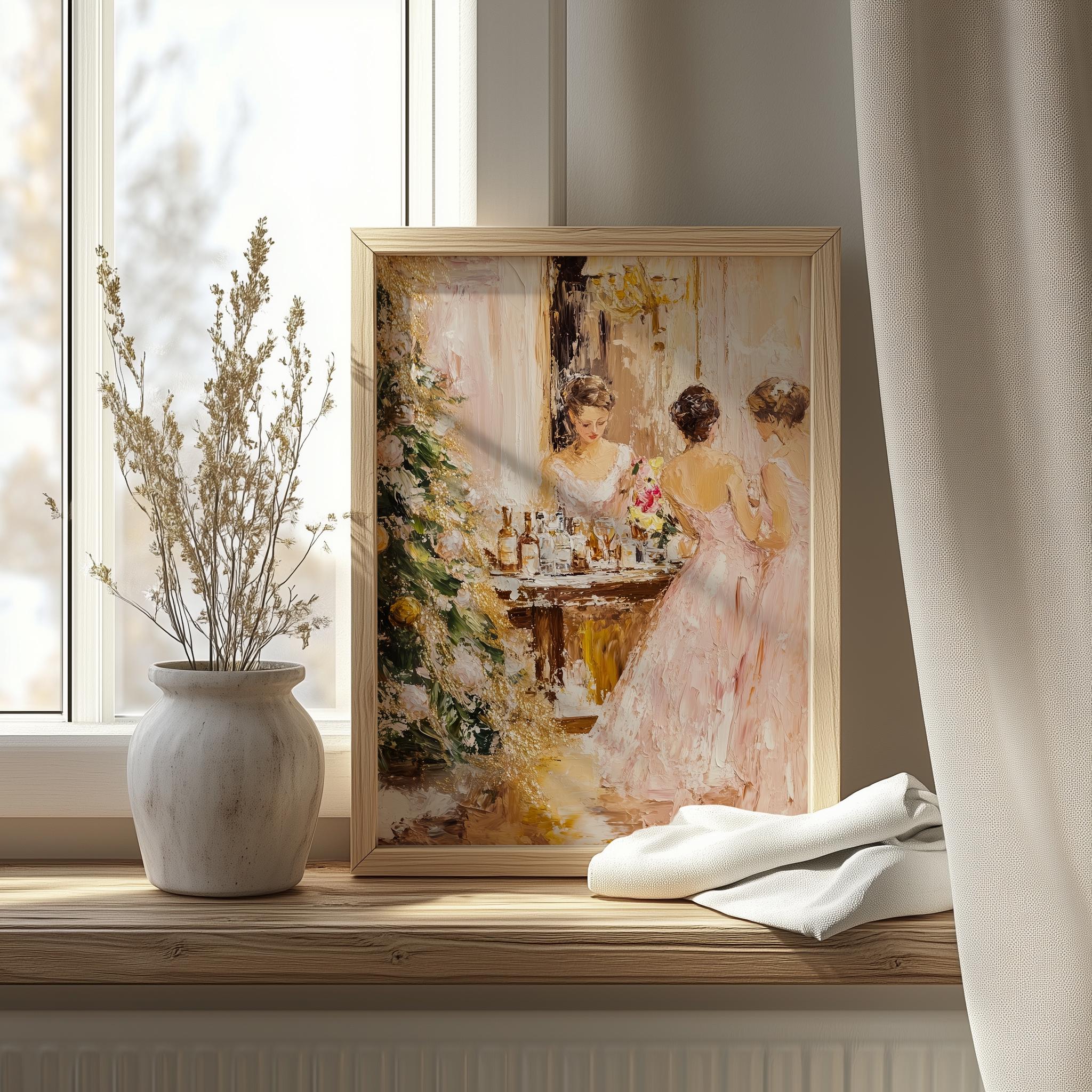 Immerse yourself in the charm with this rustic painting of elegant women in pink dresses celebrating the joy of the holiday season. An instantly downloadable print, it's perfect for elevating your decor with budget-friendly charm. This gives you the flexibility to customize the size, frame, and material according to your personal taste and space, ensuring a perfect fit for your walls.