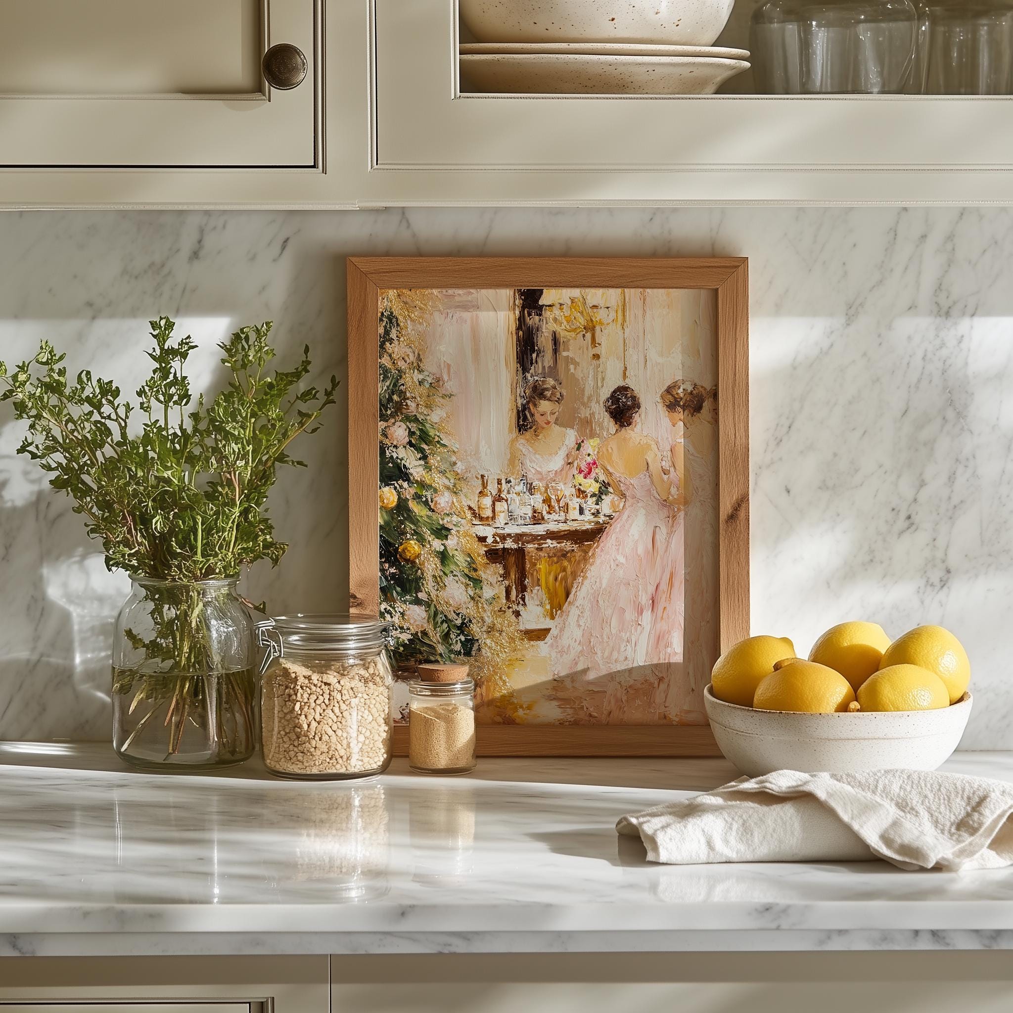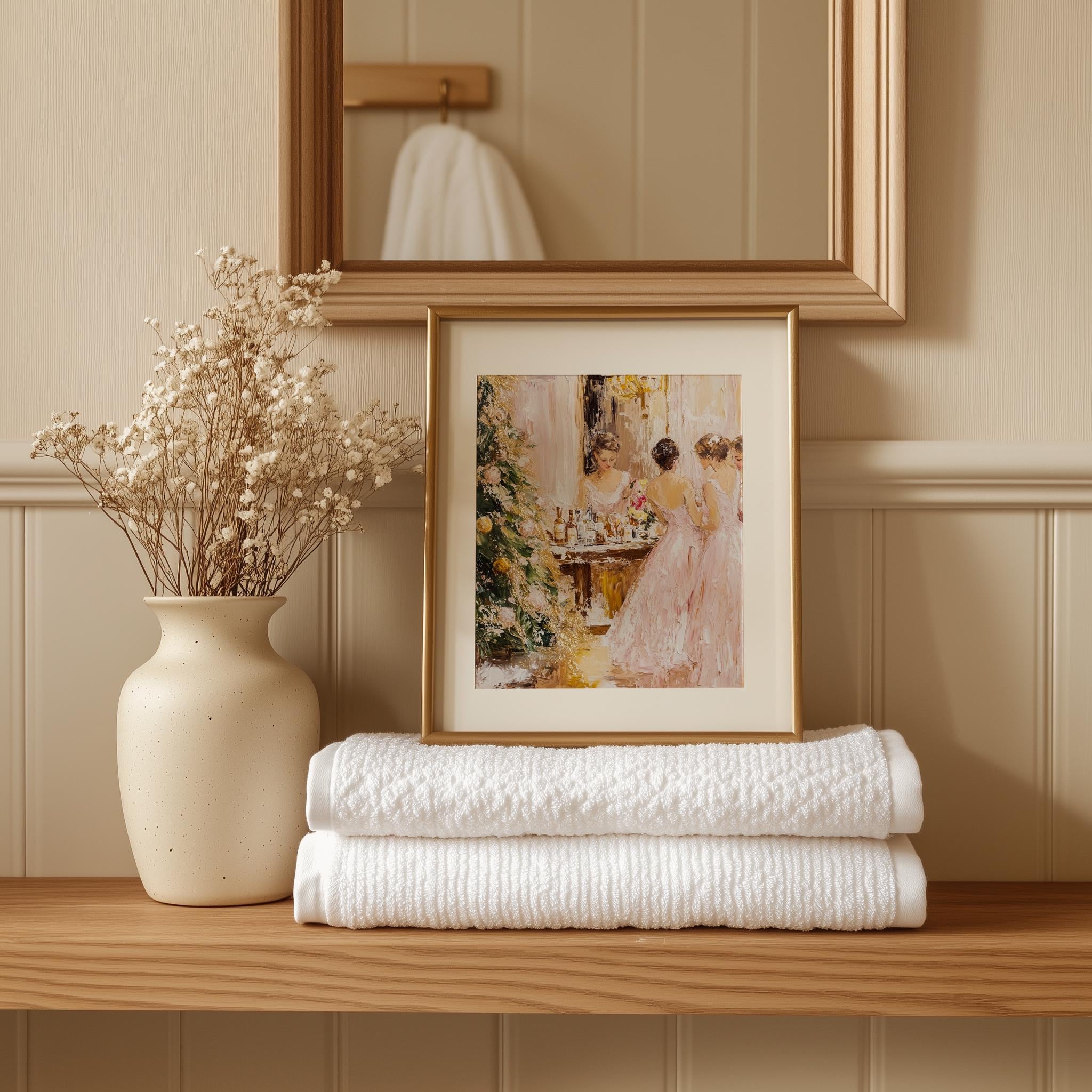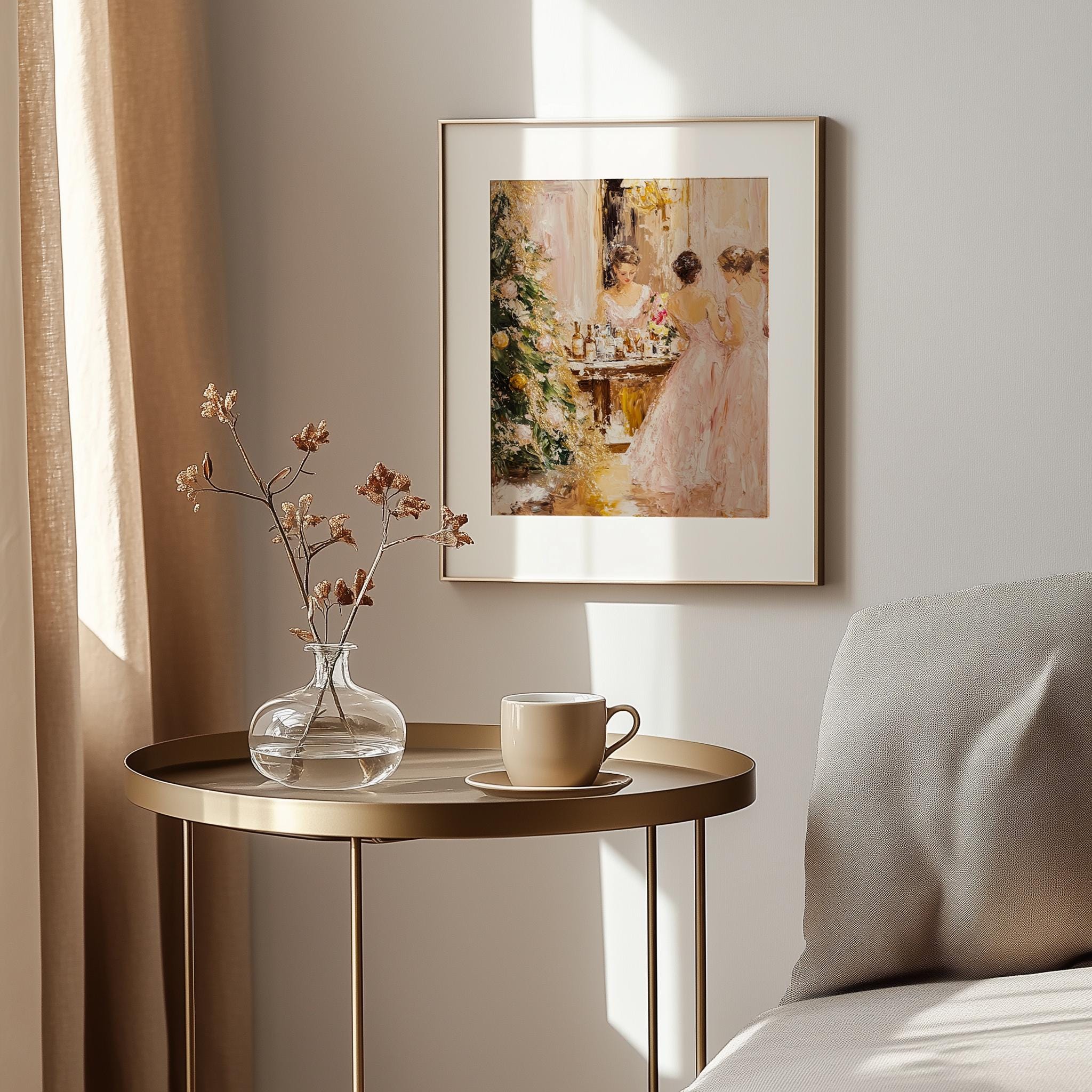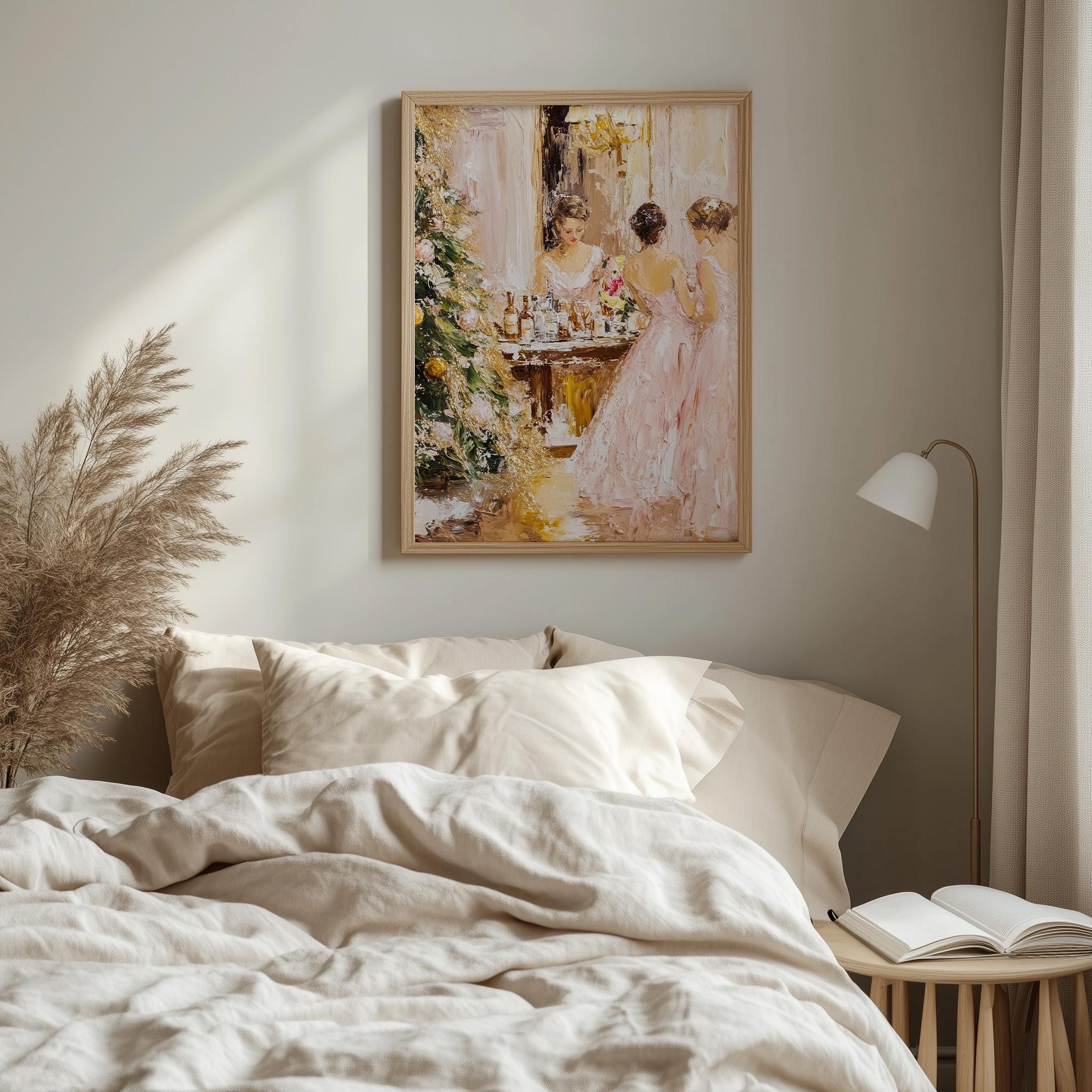 Immerse yourself in the charm with this rustic painting of elegant women in pink dresses celebrating the joy of the holiday season. An instantly downloadable print, it's perfect for elevating your decor with budget-friendly charm. This gives you the flexibility to customize the size, frame, and material according to your personal taste and space, ensuring a perfect fit for your walls.