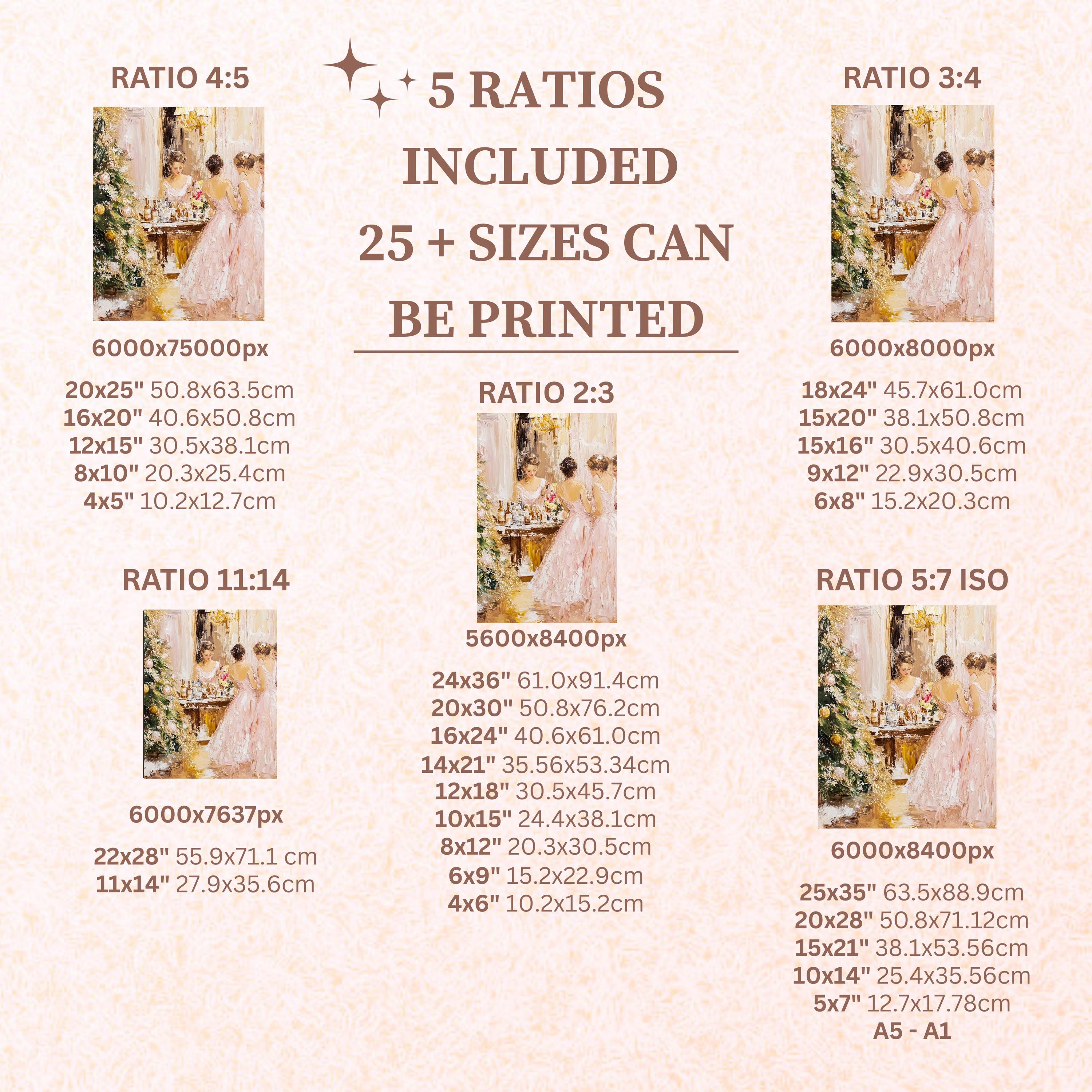 Each artwork includes 5 aspect ratios with 25+ print sizes. Most standard frames are covered. One custom resize per purchase available—message before ordering.