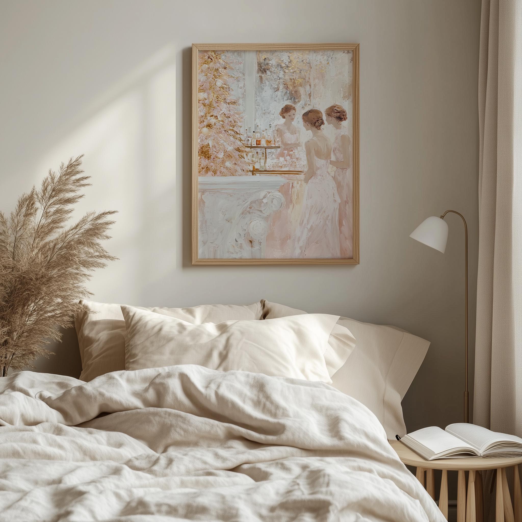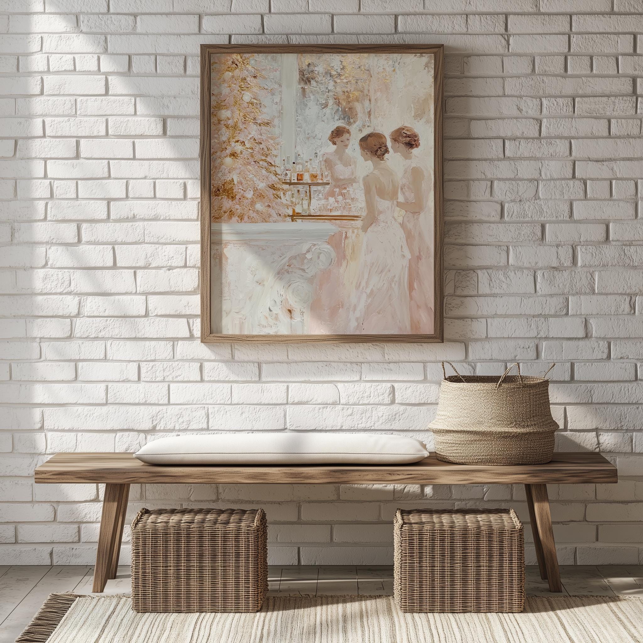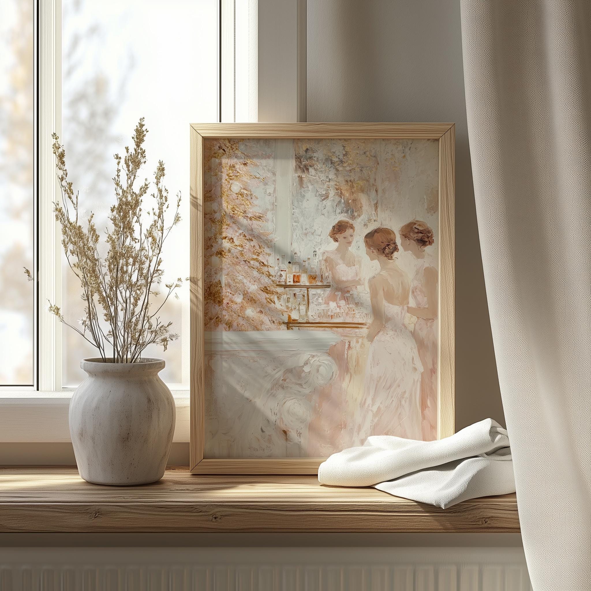 Immerse yourself in the charm with this rustic painting of elegant women in vintage blush cocktail dresses celebrating the holiday season. An instantly downloadable print, it's perfect for elevating your decor with budget-friendly charm. This gives you the flexibility to customize the size, frame, and material according to your personal taste and space, ensuring a perfect fit for your walls.