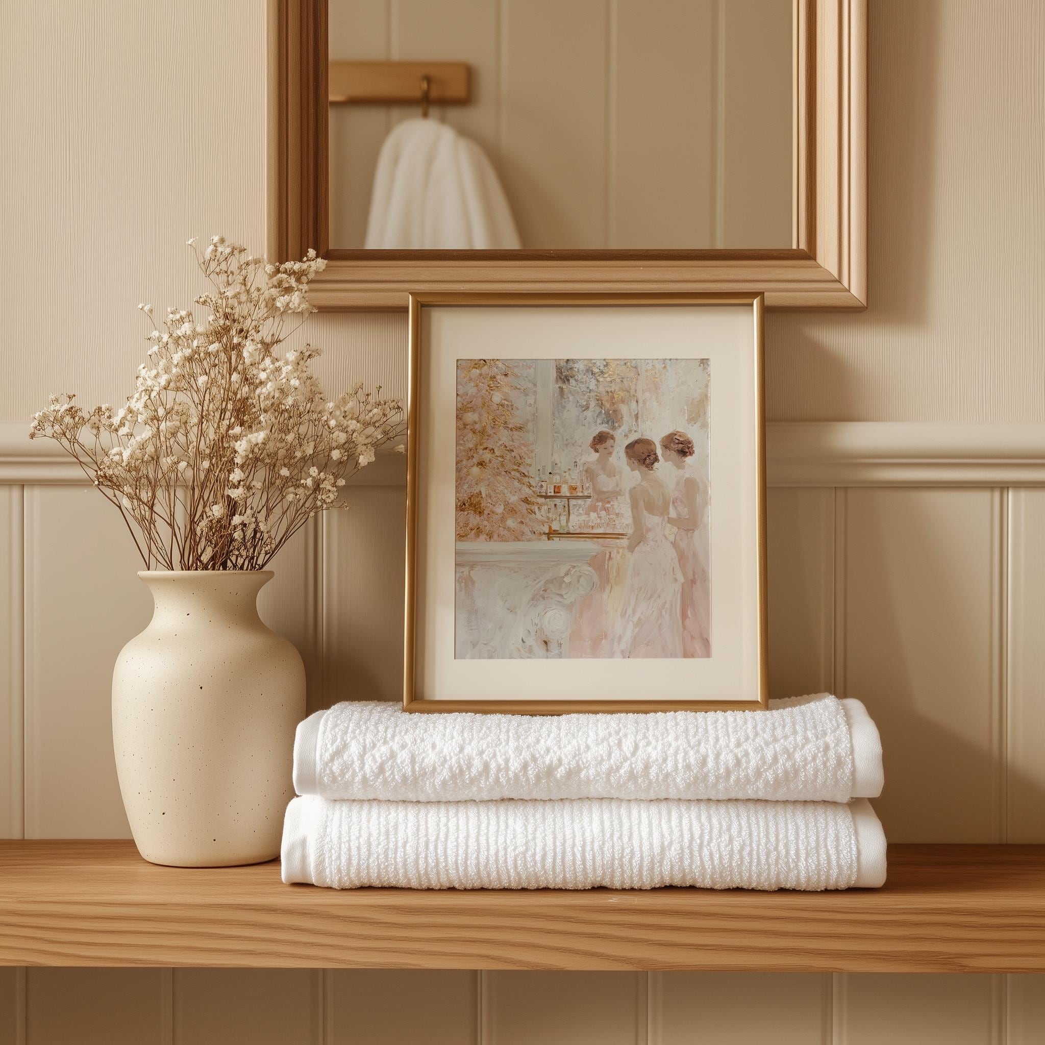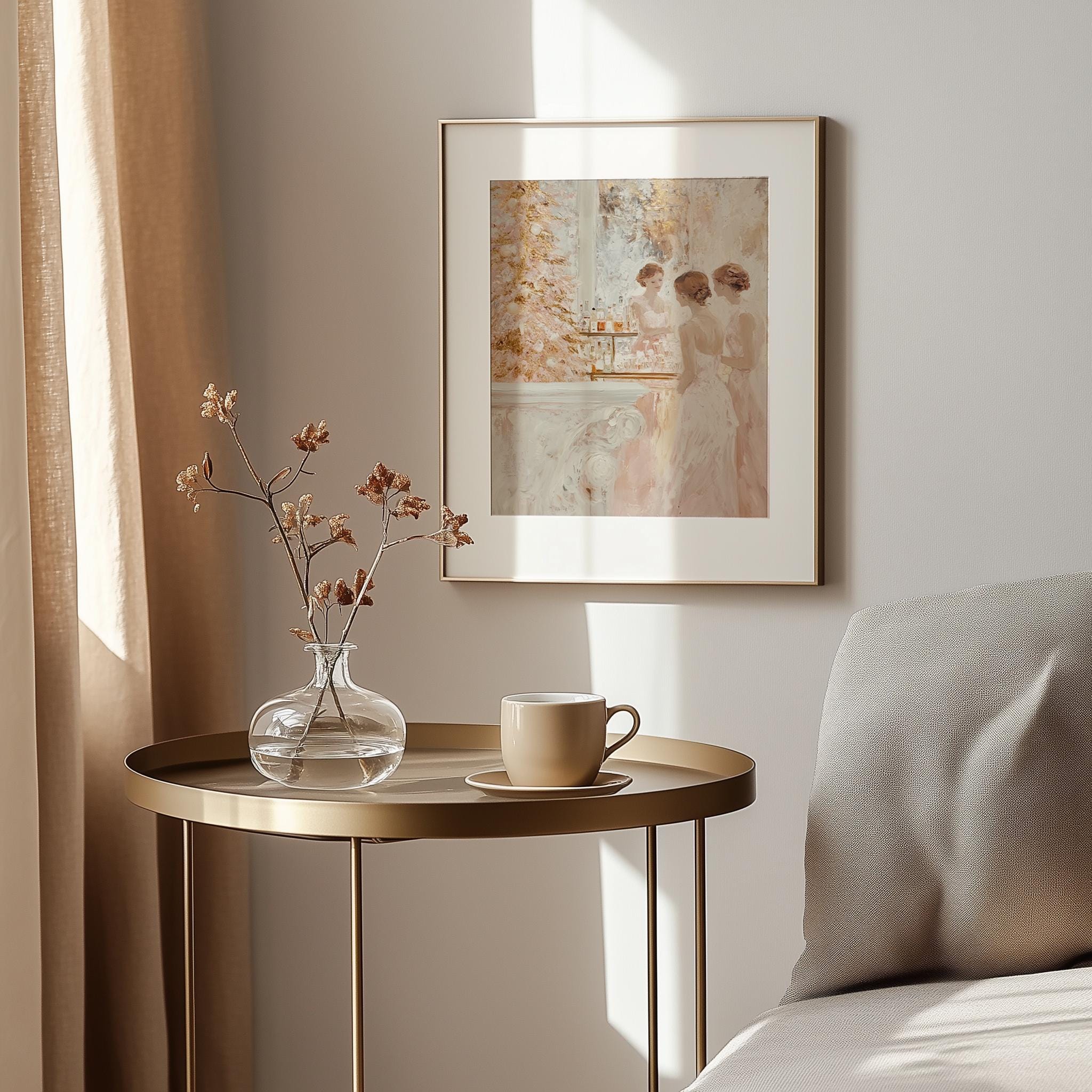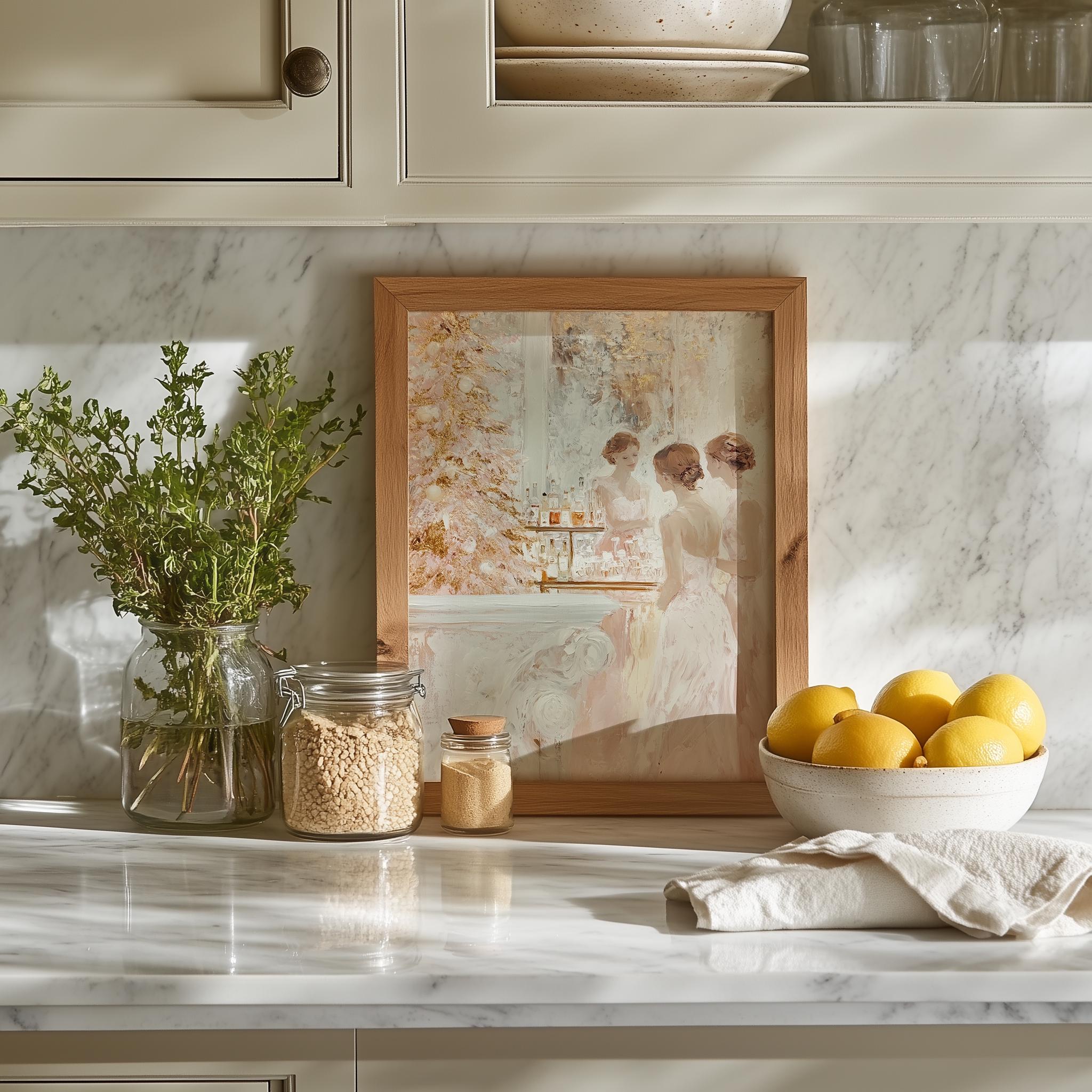 Immerse yourself in the charm with this rustic painting of elegant women in vintage blush cocktail dresses celebrating the holiday season. An instantly downloadable print, it's perfect for elevating your decor with budget-friendly charm. This gives you the flexibility to customize the size, frame, and material according to your personal taste and space, ensuring a perfect fit for your walls.
