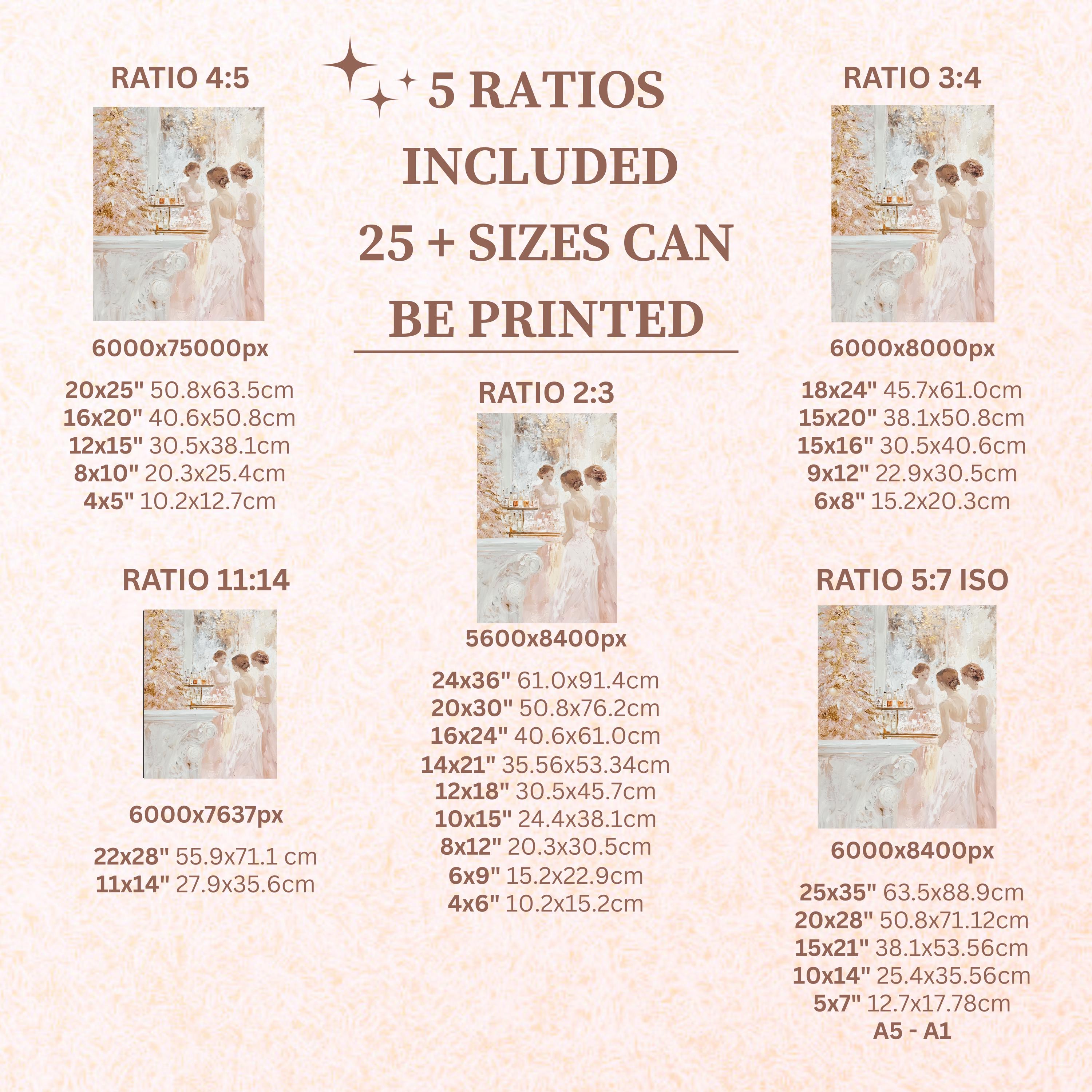 Each artwork includes 5 aspect ratios with 25+ print sizes. Most standard frames are covered. One custom resize per purchase available—message before ordering.