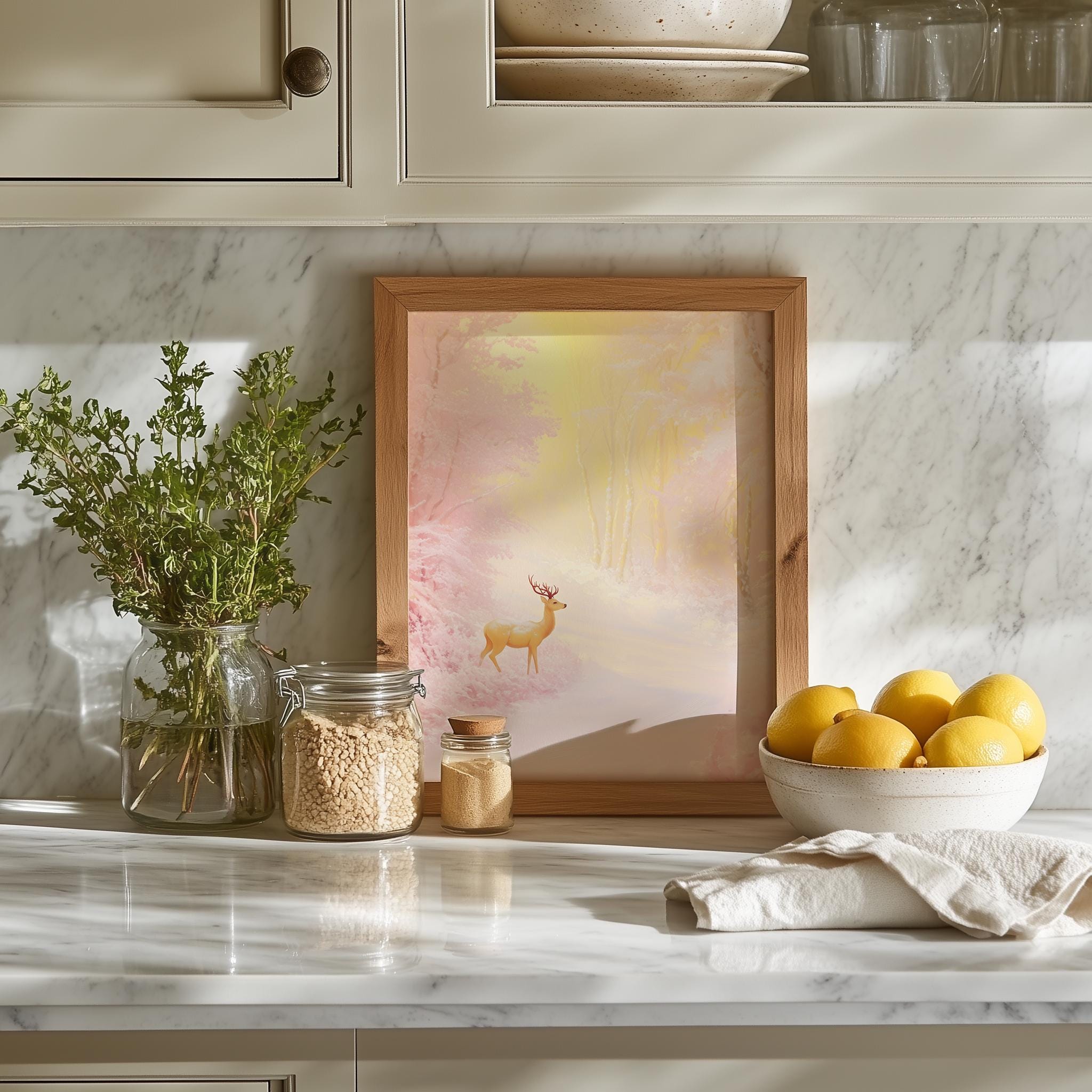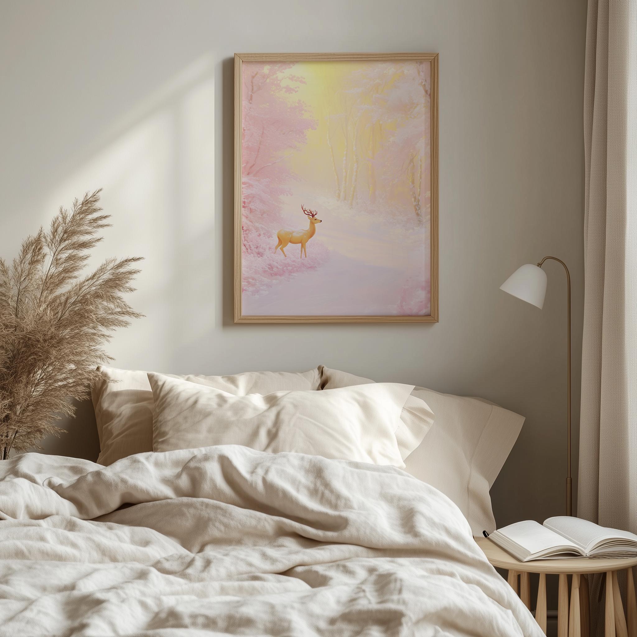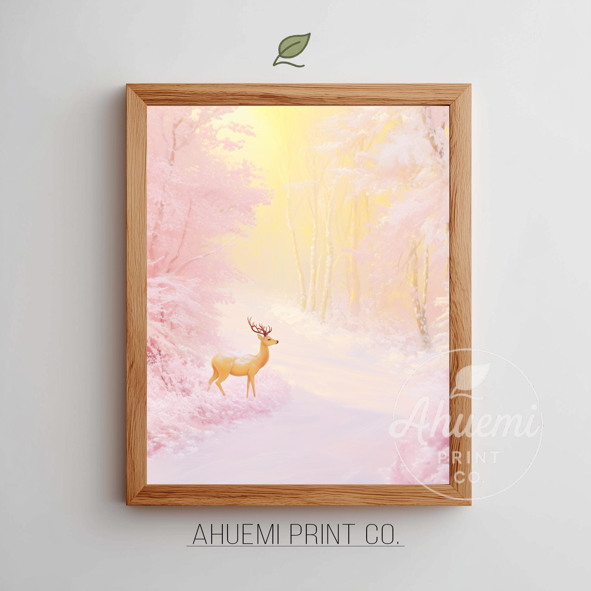 Immerse yourself in the charm with this rustic painting of a graceful pink deer wandering through a snowy twilight forest. An instantly downloadable print, it's perfect for elevating your decor with budget-friendly charm. This gives you the flexibility to customize the size, frame, and material according to your personal taste and space, ensuring a perfect fit for your walls.