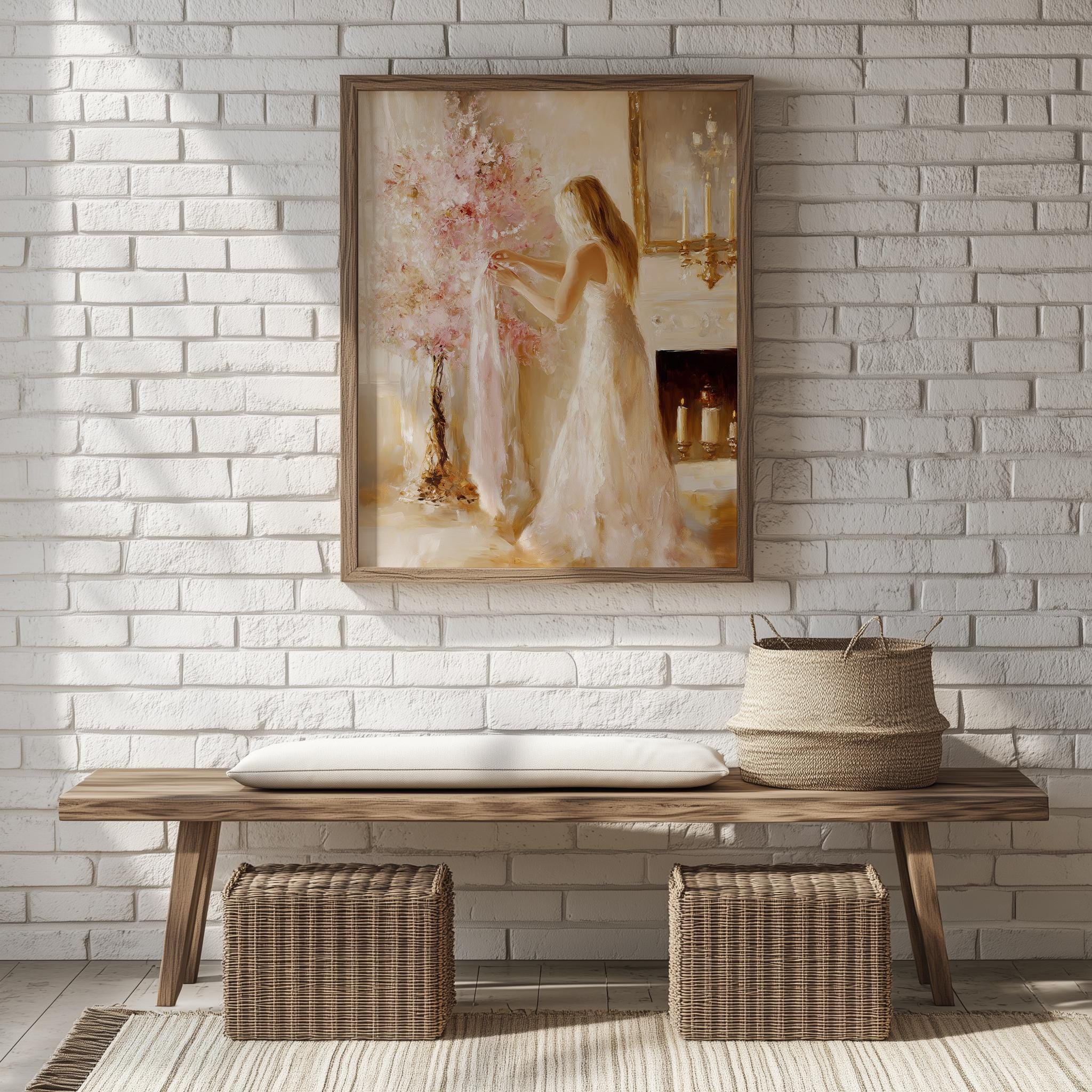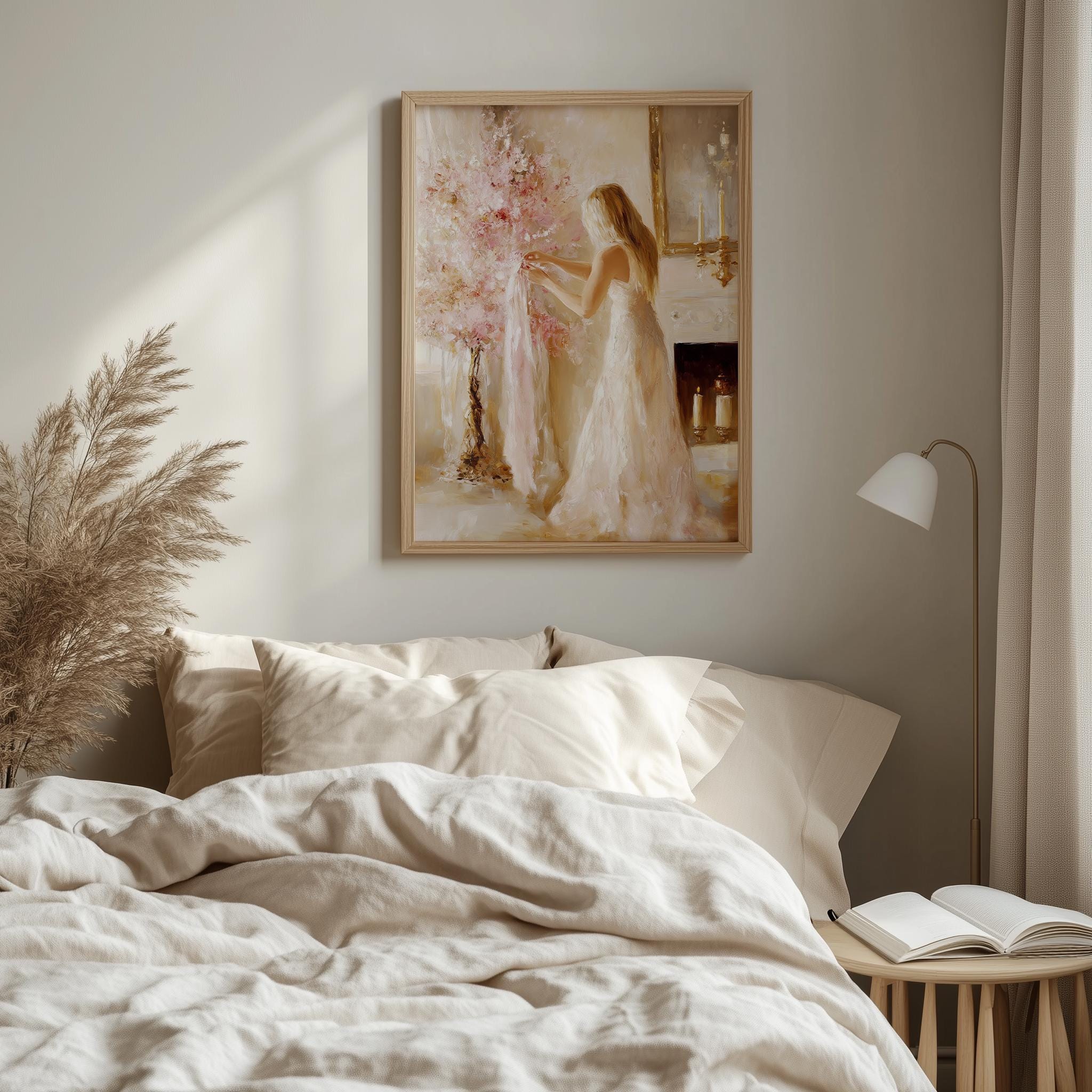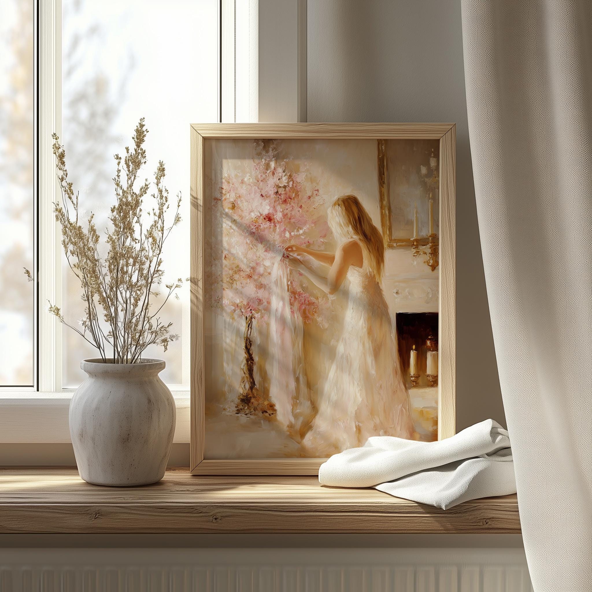 Immerse yourself in the charm with this rustic painting of an elegant woman surrounded by a vintage pink holiday tree, embodying festive femininity and cozy charm. An instantly downloadable print, it's perfect for elevating your decor with budget-friendly charm. This gives you the flexibility to customize the size, frame, and material according to your personal taste and space, ensuring a perfect fit for your walls.