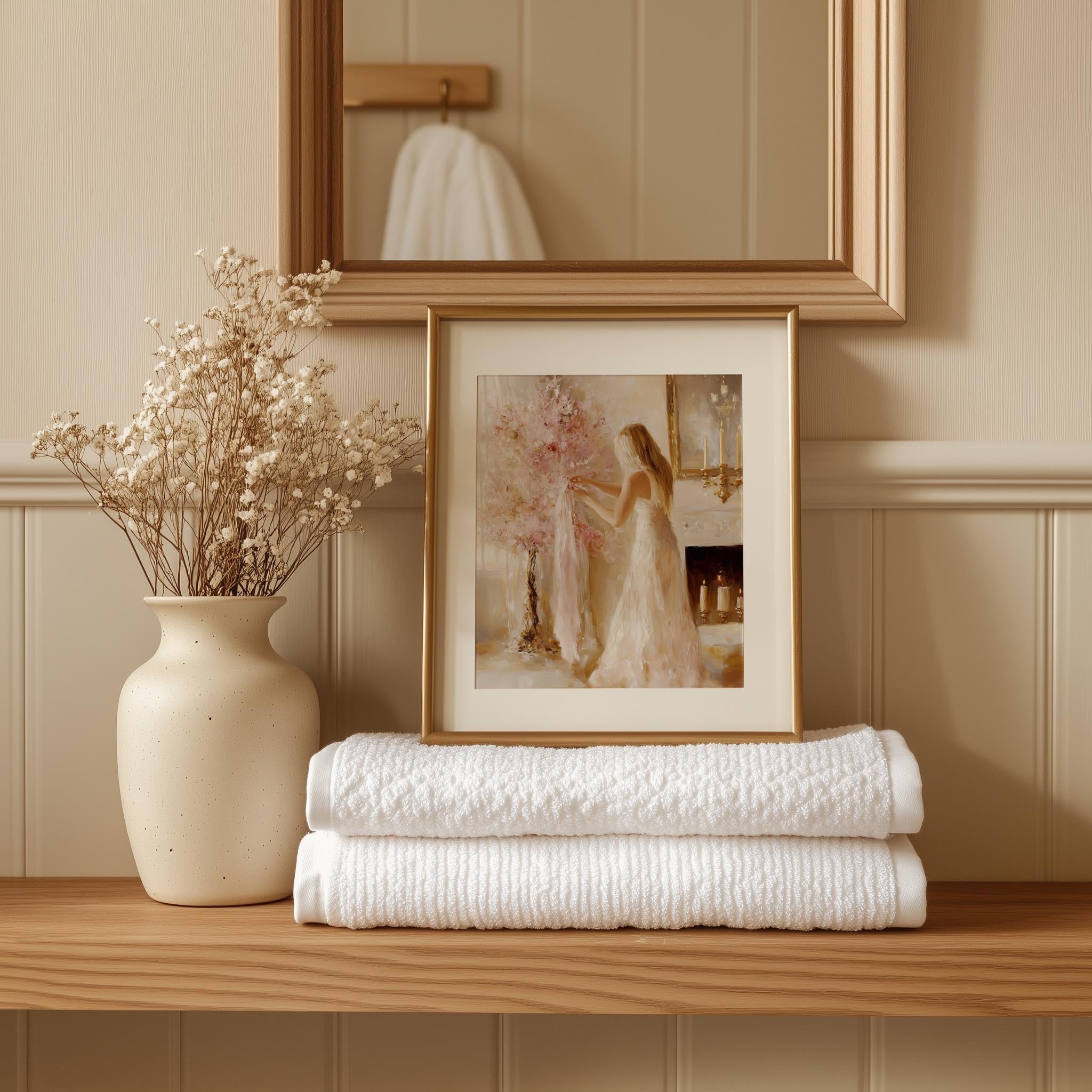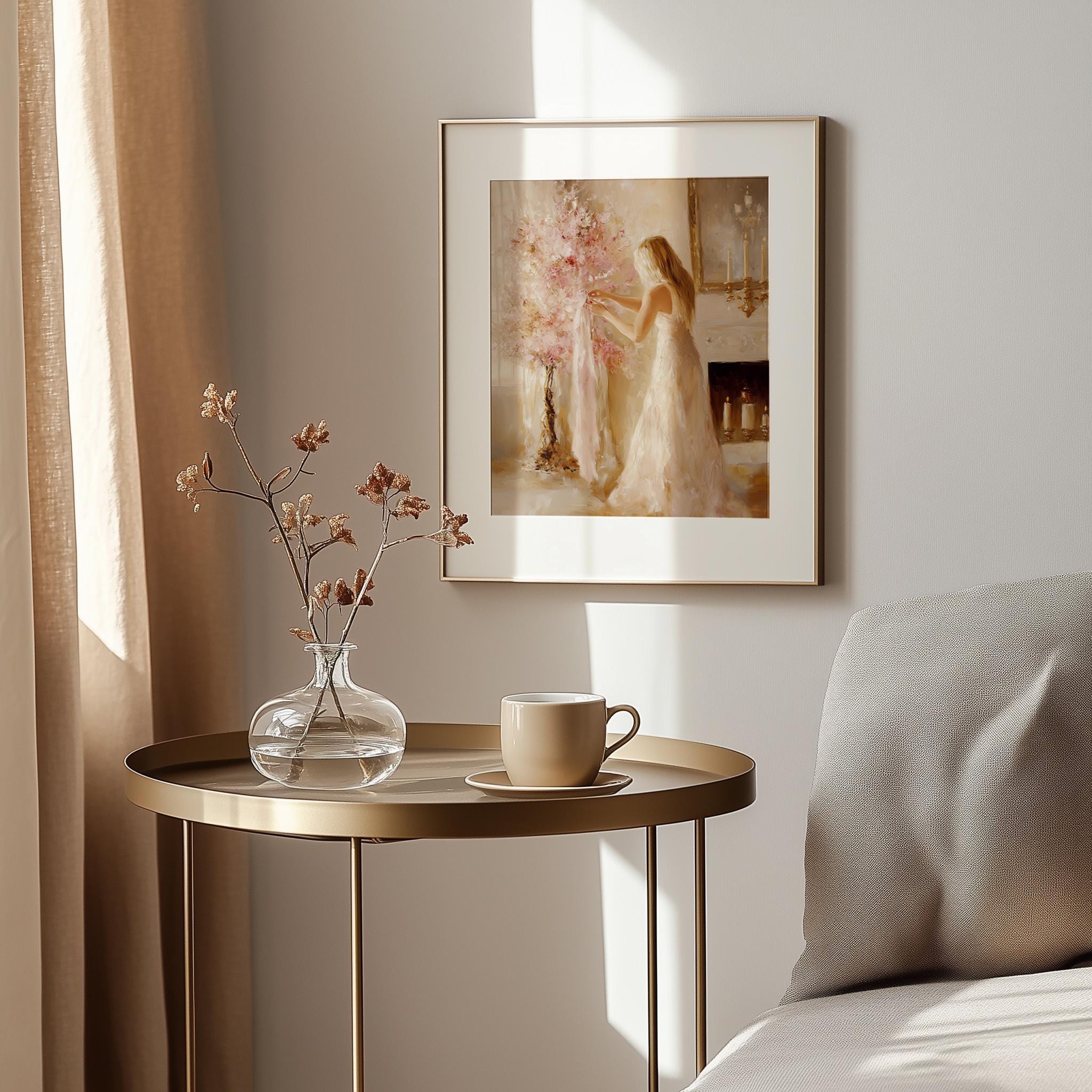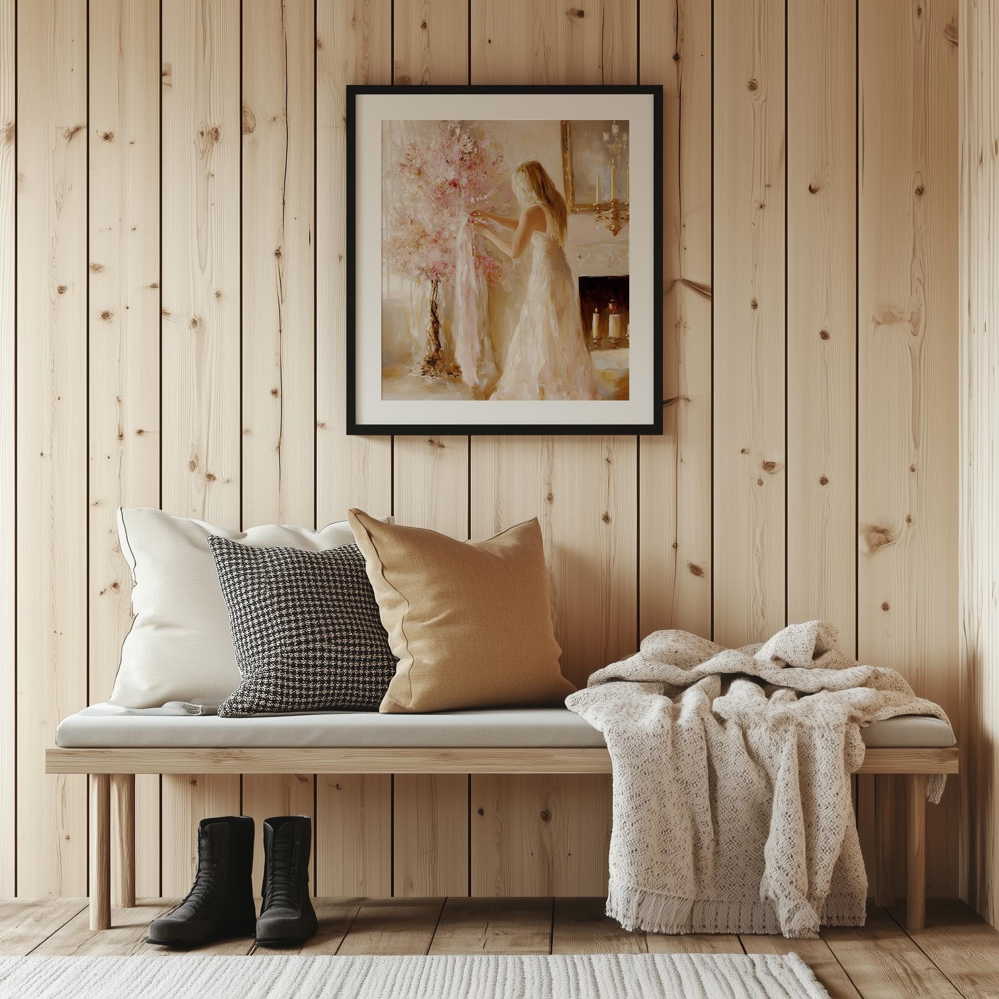 Immerse yourself in the charm with this rustic painting of an elegant woman surrounded by a vintage pink holiday tree, embodying festive femininity and cozy charm. An instantly downloadable print, it's perfect for elevating your decor with budget-friendly charm. This gives you the flexibility to customize the size, frame, and material according to your personal taste and space, ensuring a perfect fit for your walls.