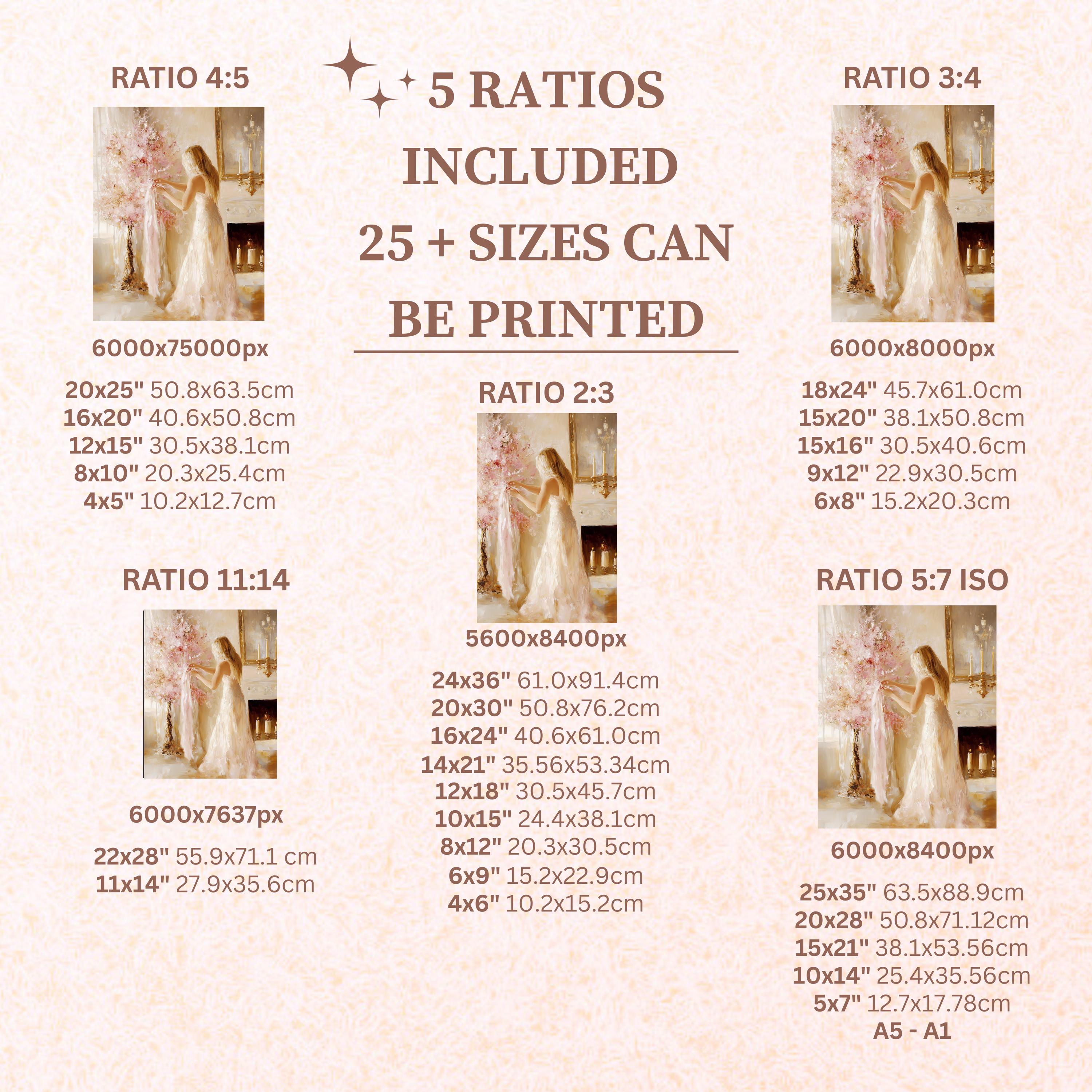 Each artwork includes 5 aspect ratios with 25+ print sizes. Most standard frames are covered. One custom resize per purchase available—message before ordering.