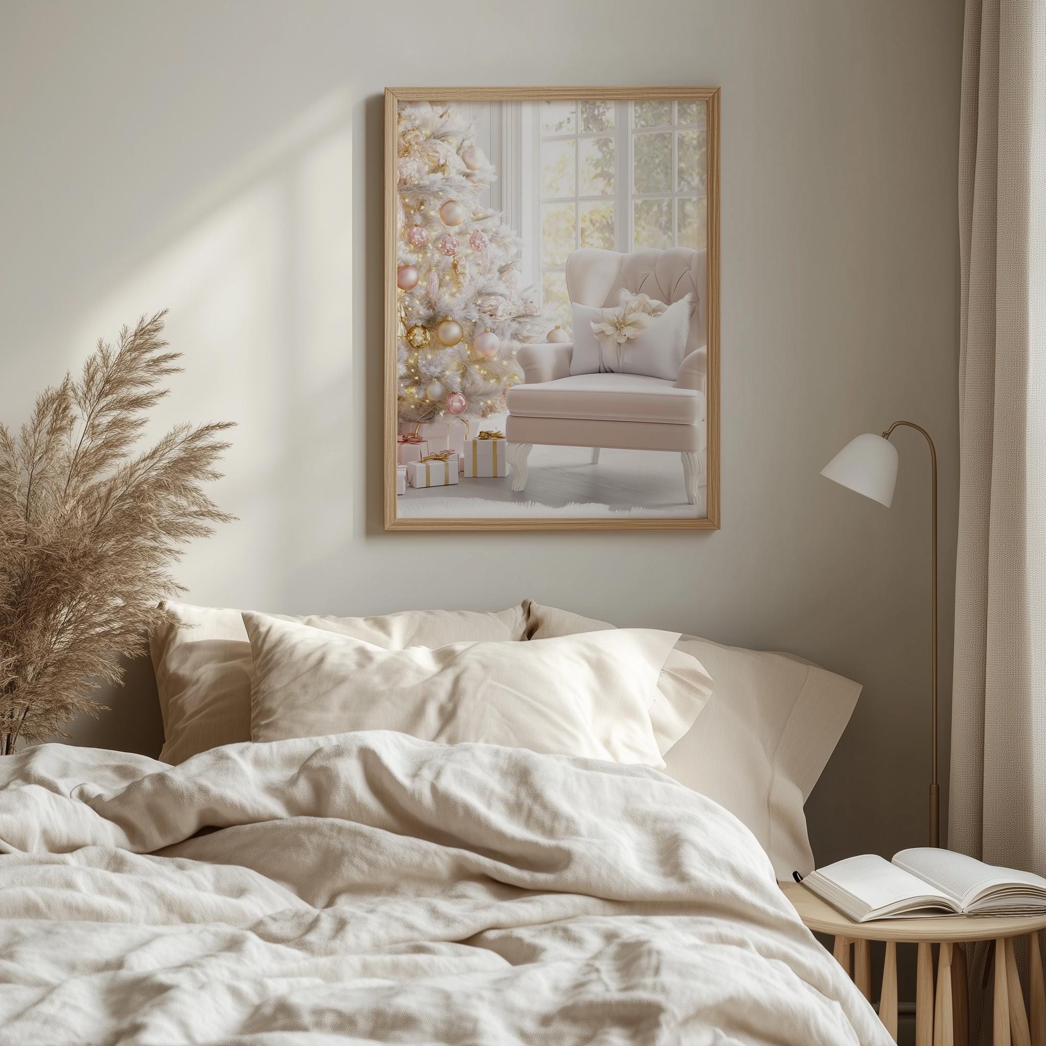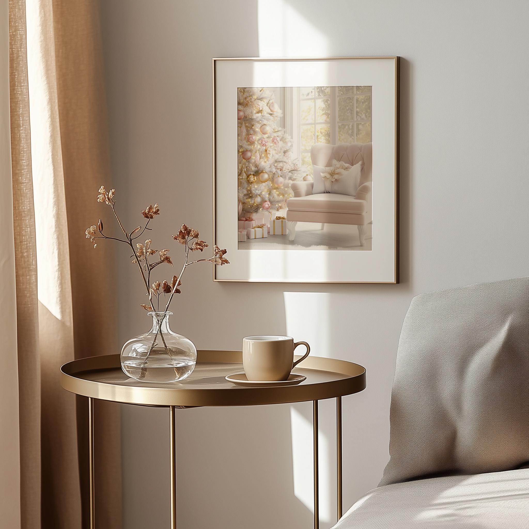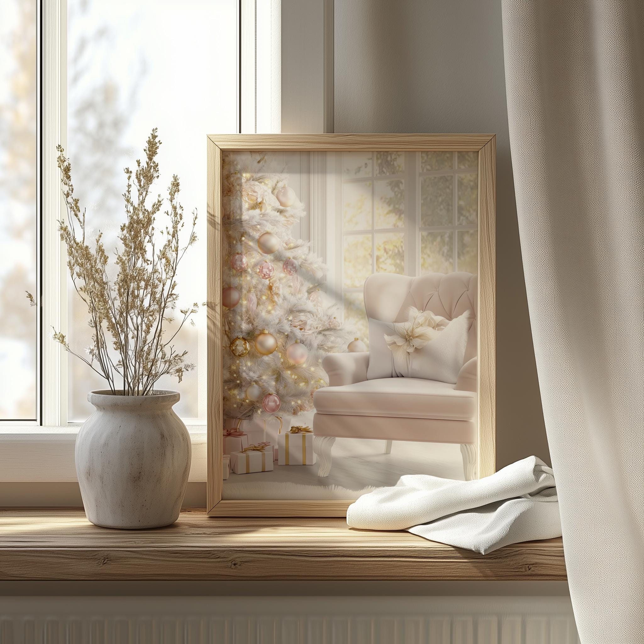 Immerse yourself in the charm with this rustic painting of a pastel pink velvet armchair adorned with festive decorations. An instantly downloadable print, it's perfect for elevating your decor with budget-friendly charm. This gives you the flexibility to customize the size, frame, and material according to your personal taste and space, ensuring a perfect fit for your walls.