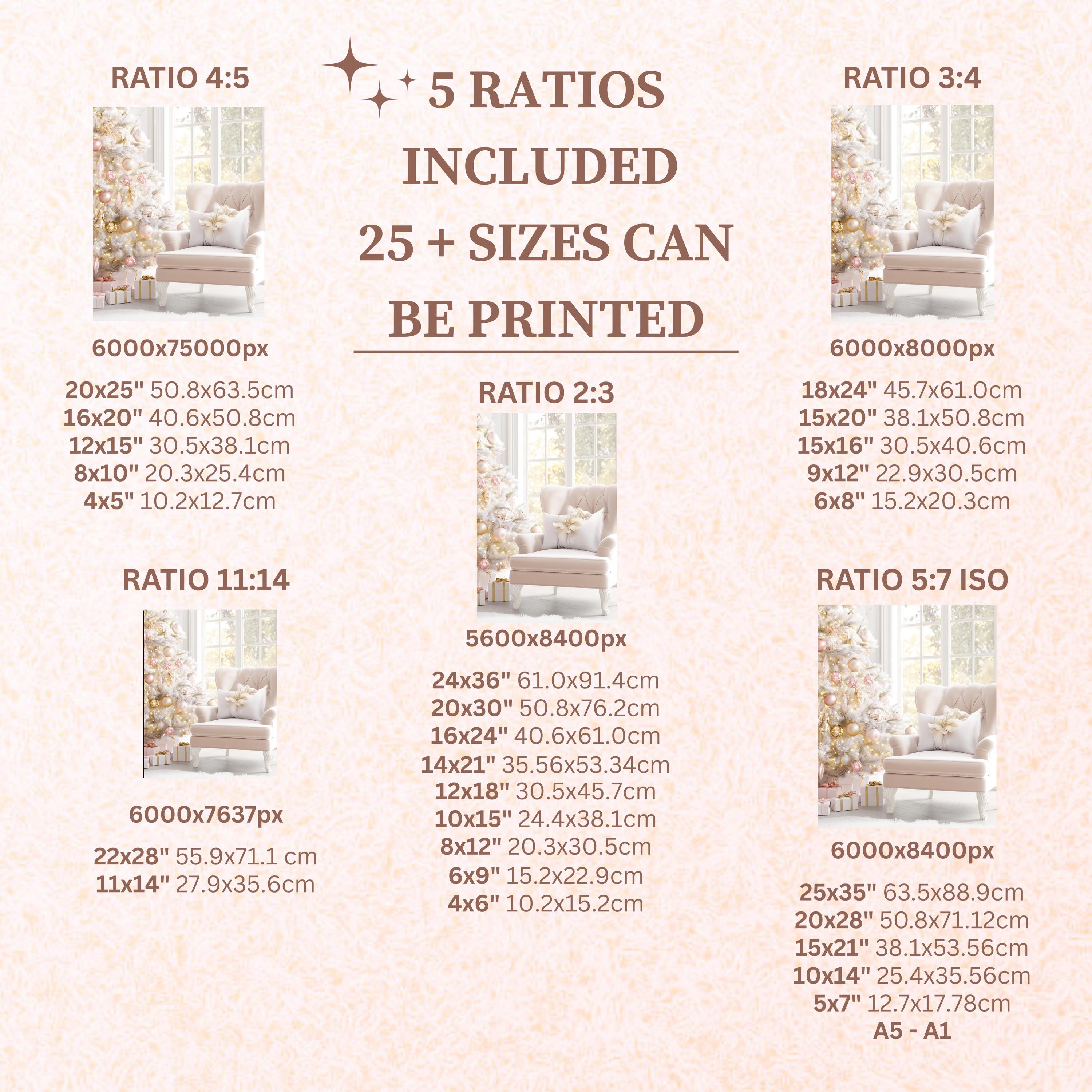 With your purchase, you’ll receive 5 high-resolution JPG files (300 DPI), each designed to print beautifully in 25+ different sizes. These files are grouped into common aspect ratios so you can print and frame your art however you like: