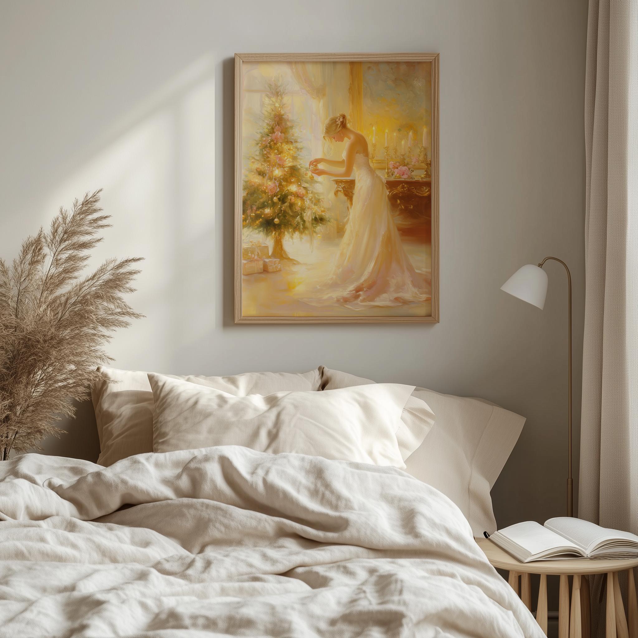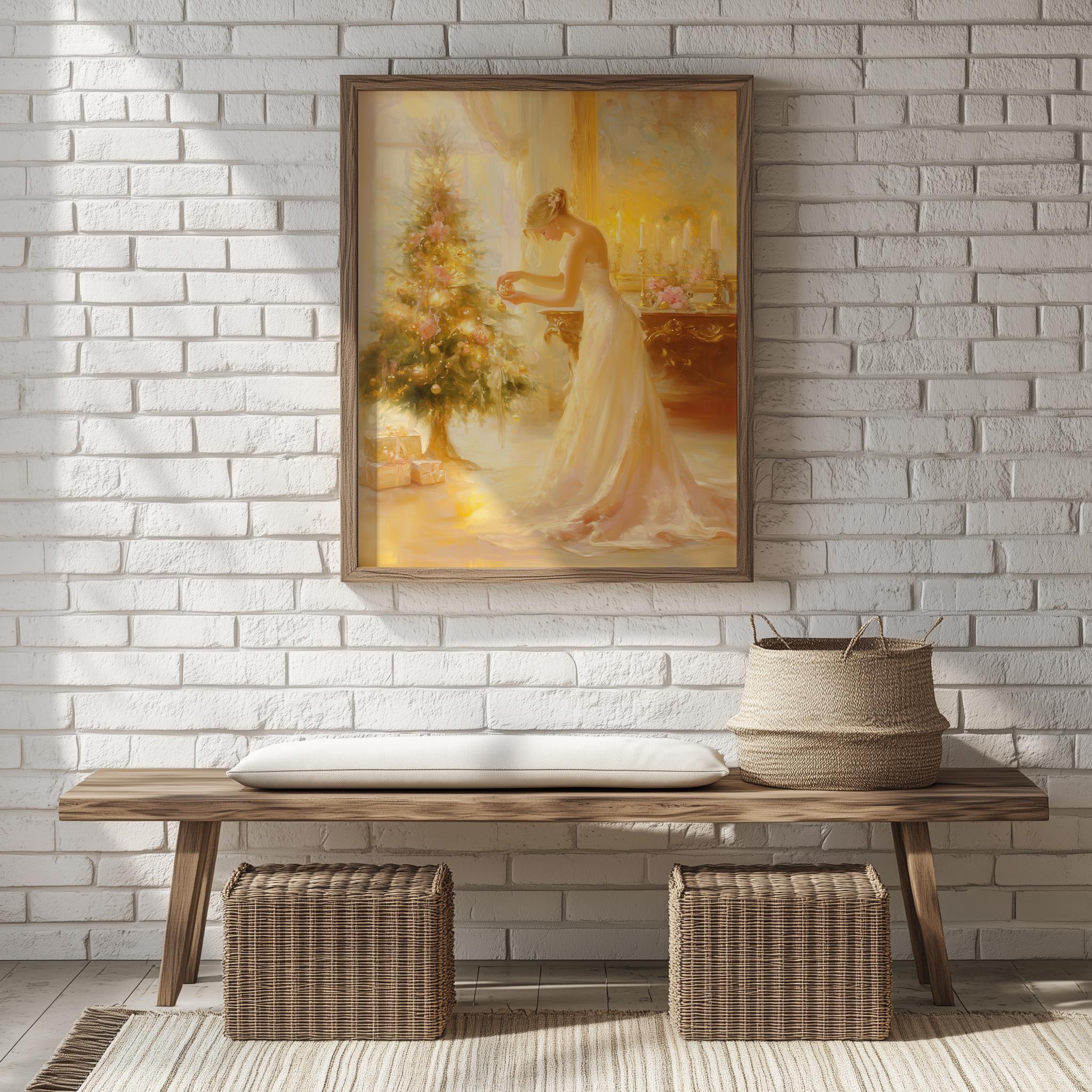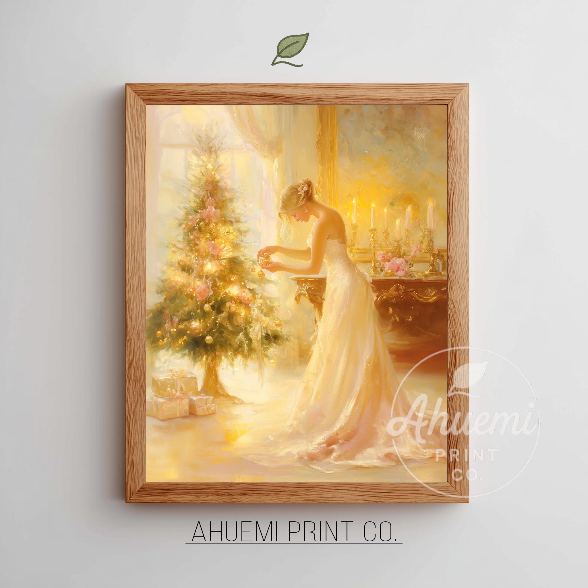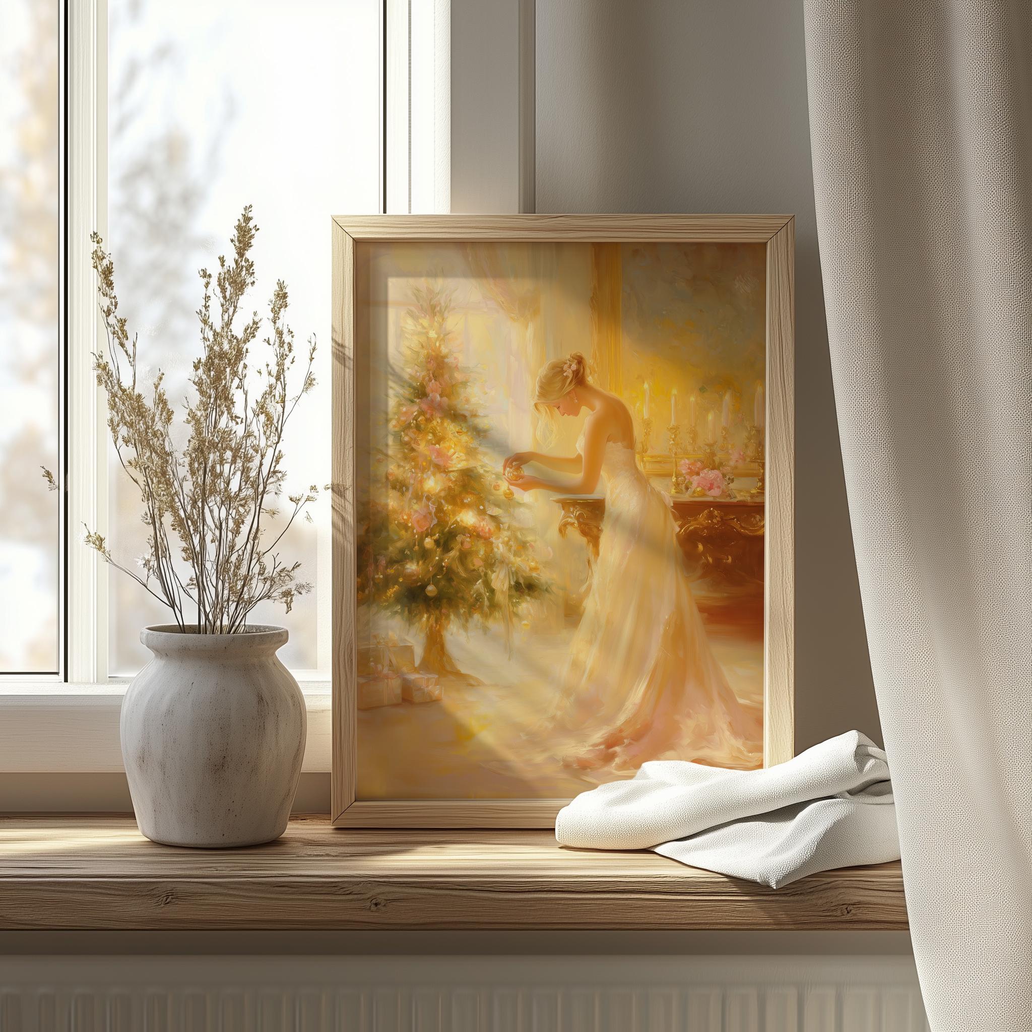 Immerse yourself in the charm with this rustic painting of an elegant woman adorned in a satin gown, standing gracefully beside a beautifully decorated pink Christmas tree. An instantly downloadable print, it's perfect for elevating your decor with budget-friendly charm. This gives you the flexibility to customize the size, frame, and material according to your personal taste and space, ensuring a perfect fit for your walls.
