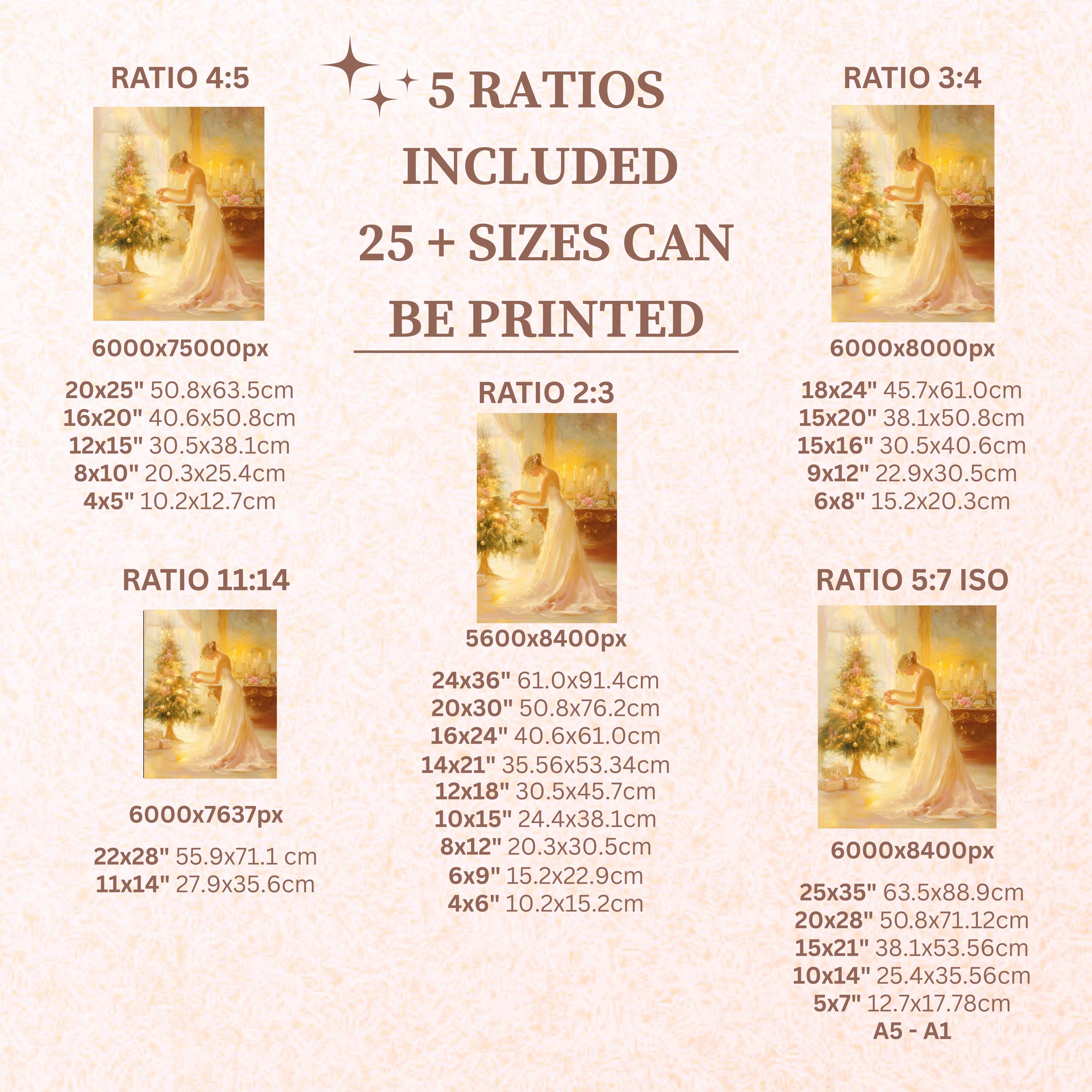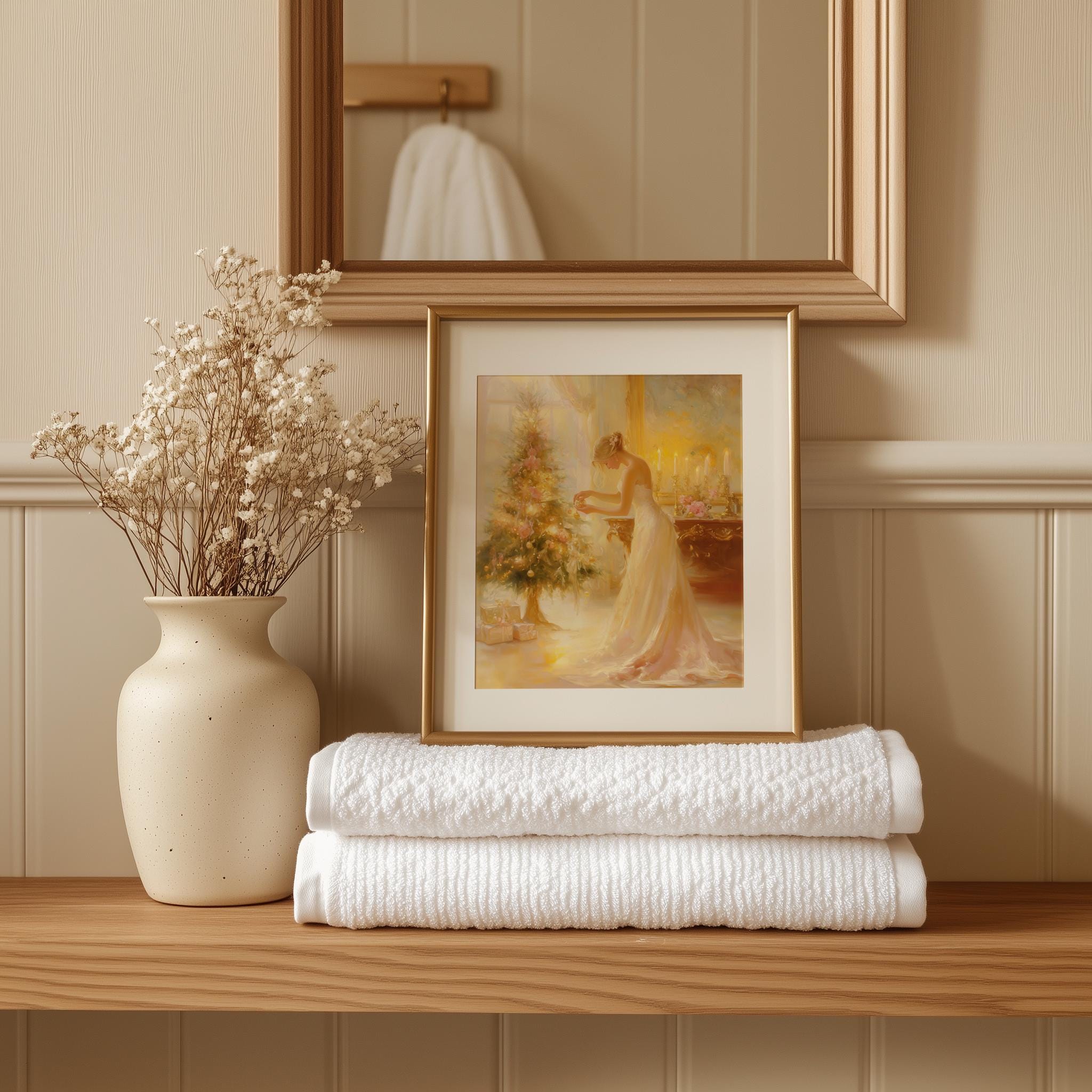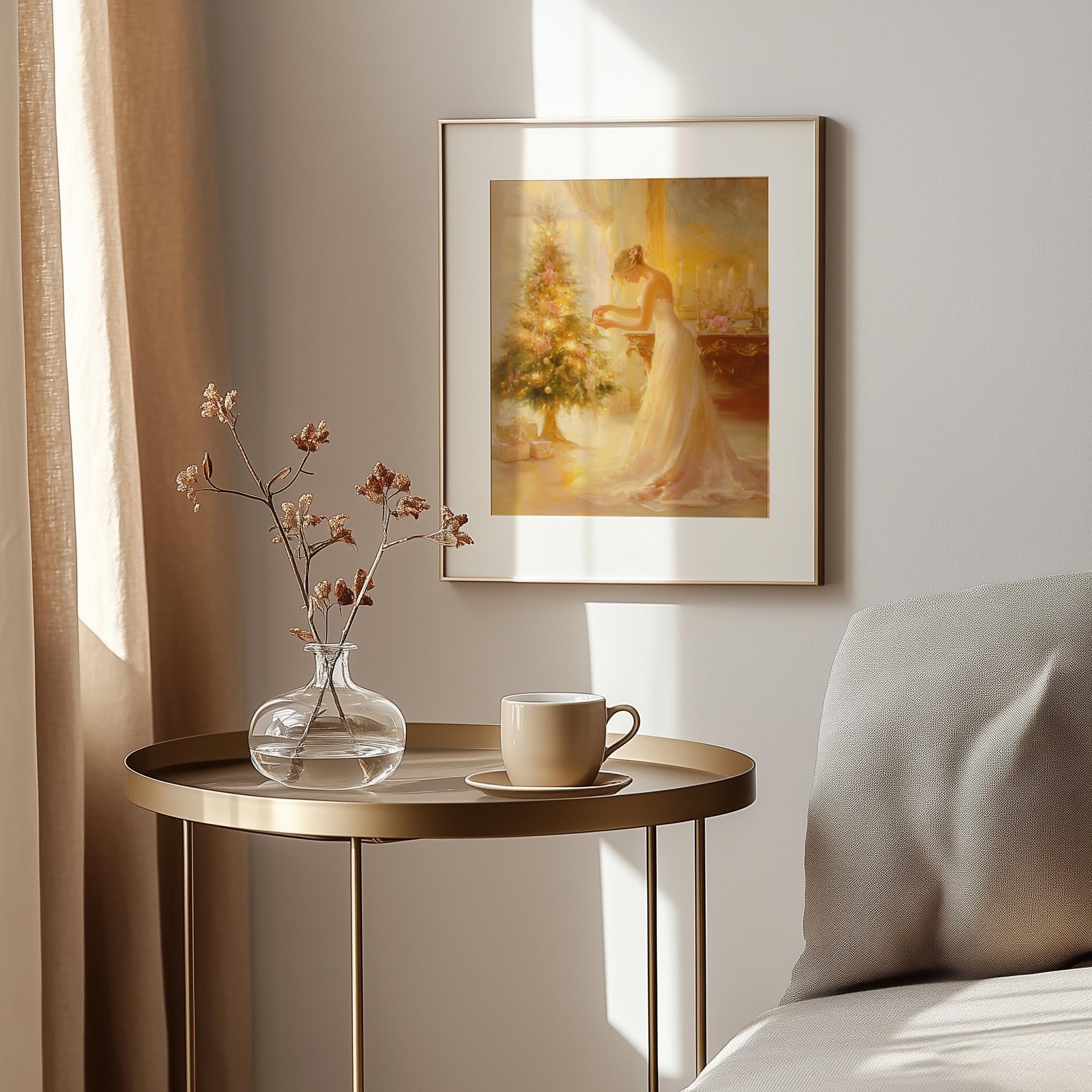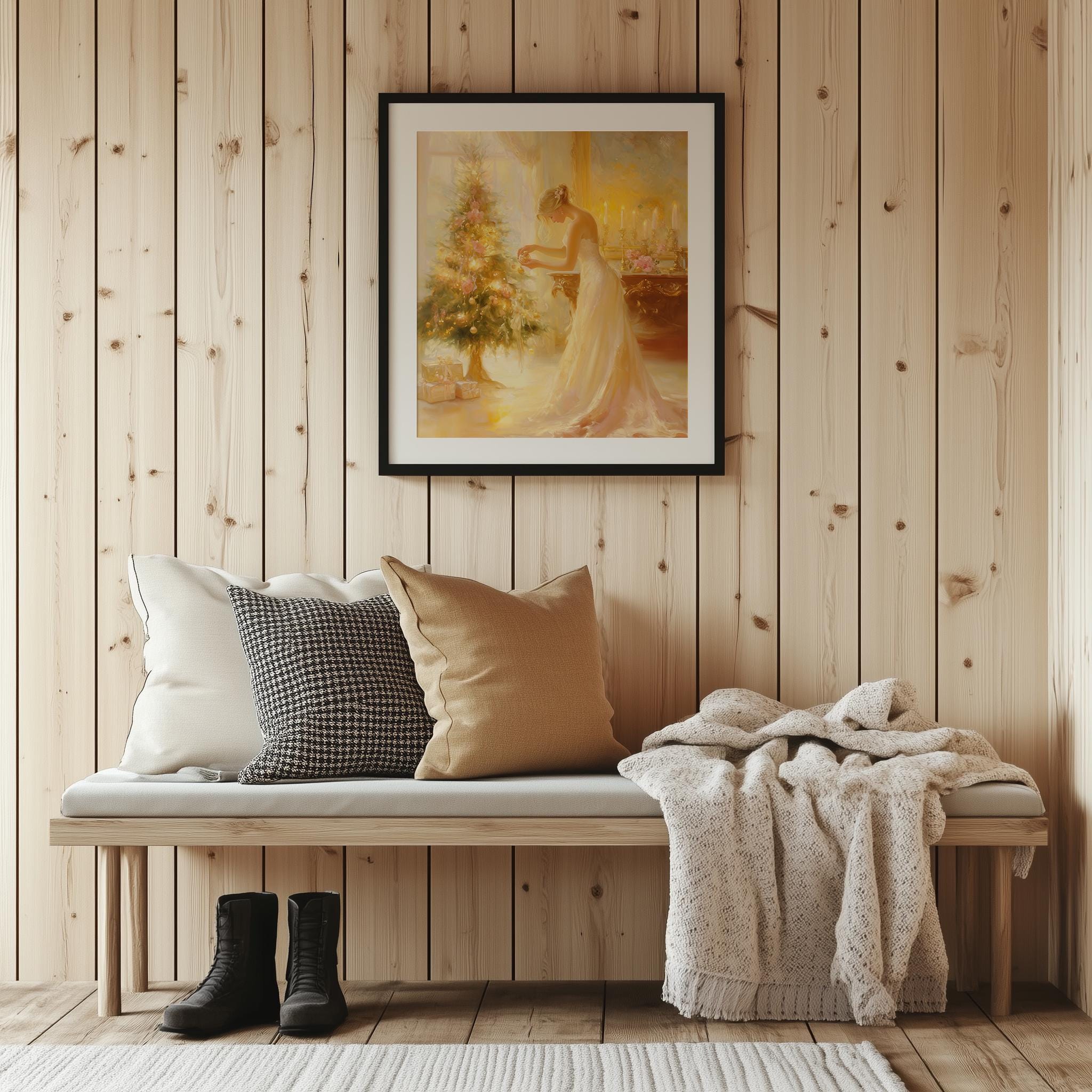 Immerse yourself in the charm with this rustic painting of an elegant woman adorned in a satin gown, standing gracefully beside a beautifully decorated pink Christmas tree. An instantly downloadable print, it's perfect for elevating your decor with budget-friendly charm. This gives you the flexibility to customize the size, frame, and material according to your personal taste and space, ensuring a perfect fit for your walls.