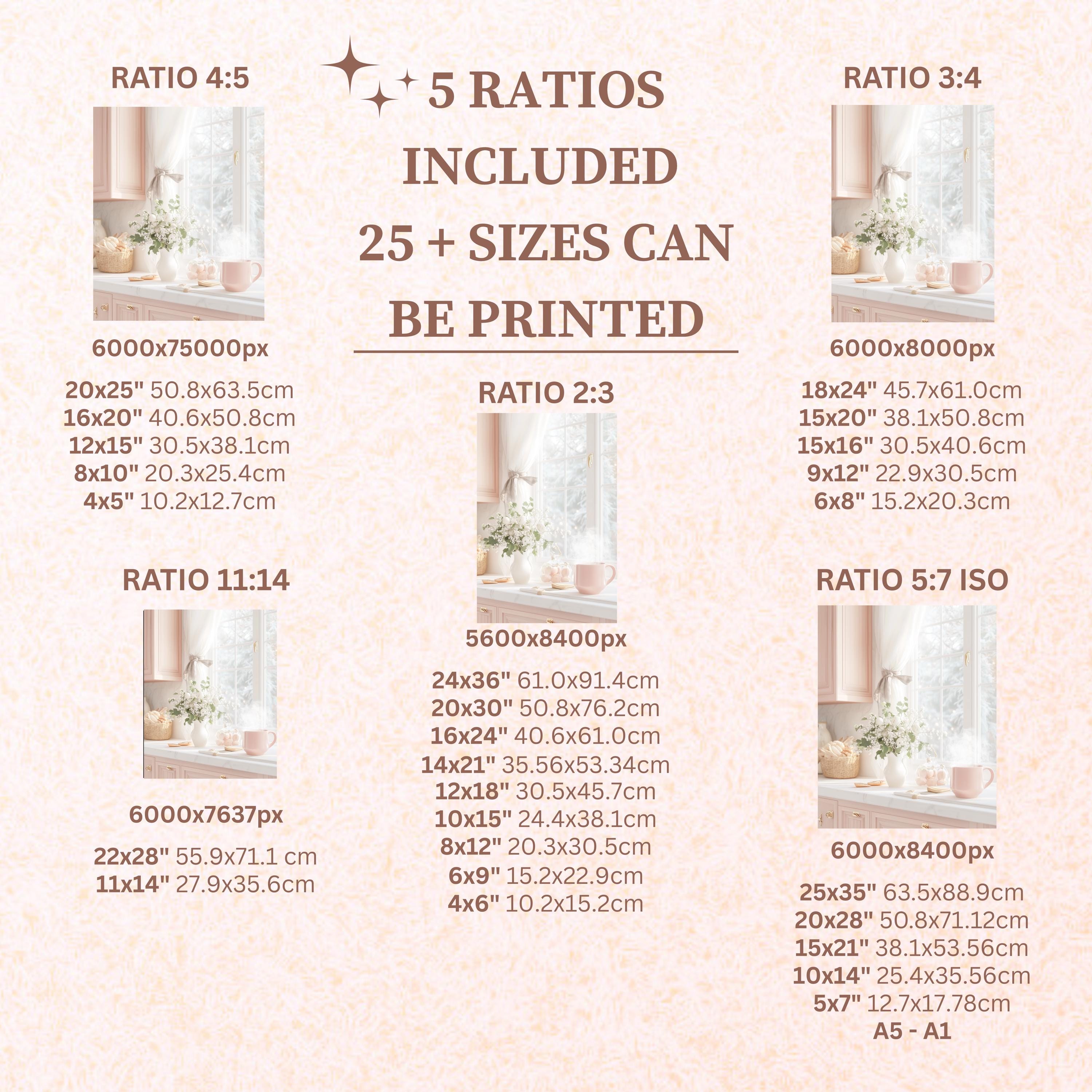Each artwork includes 5 aspect ratios with 25+ print sizes. Most standard frames are covered. One custom resize per purchase available—message before ordering.