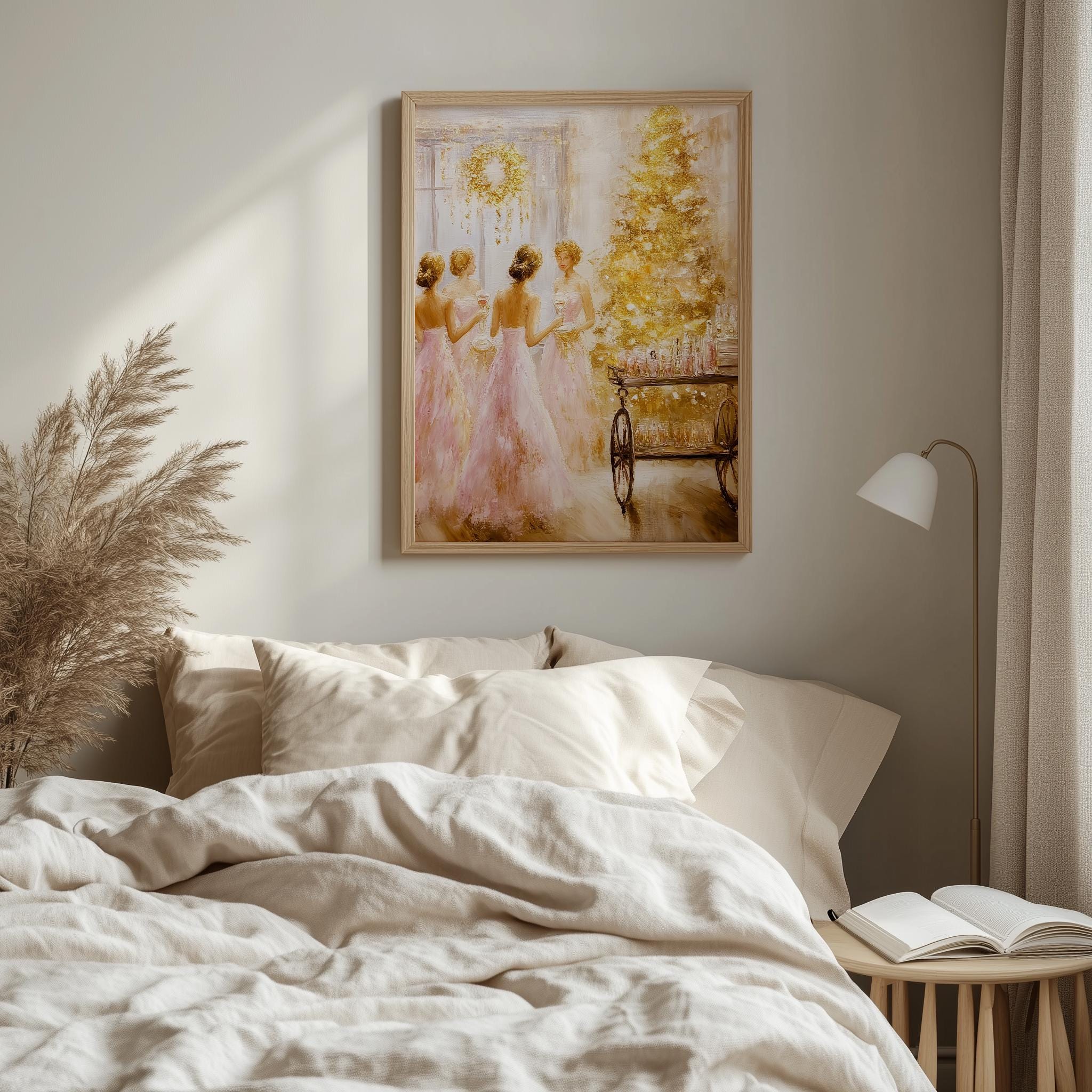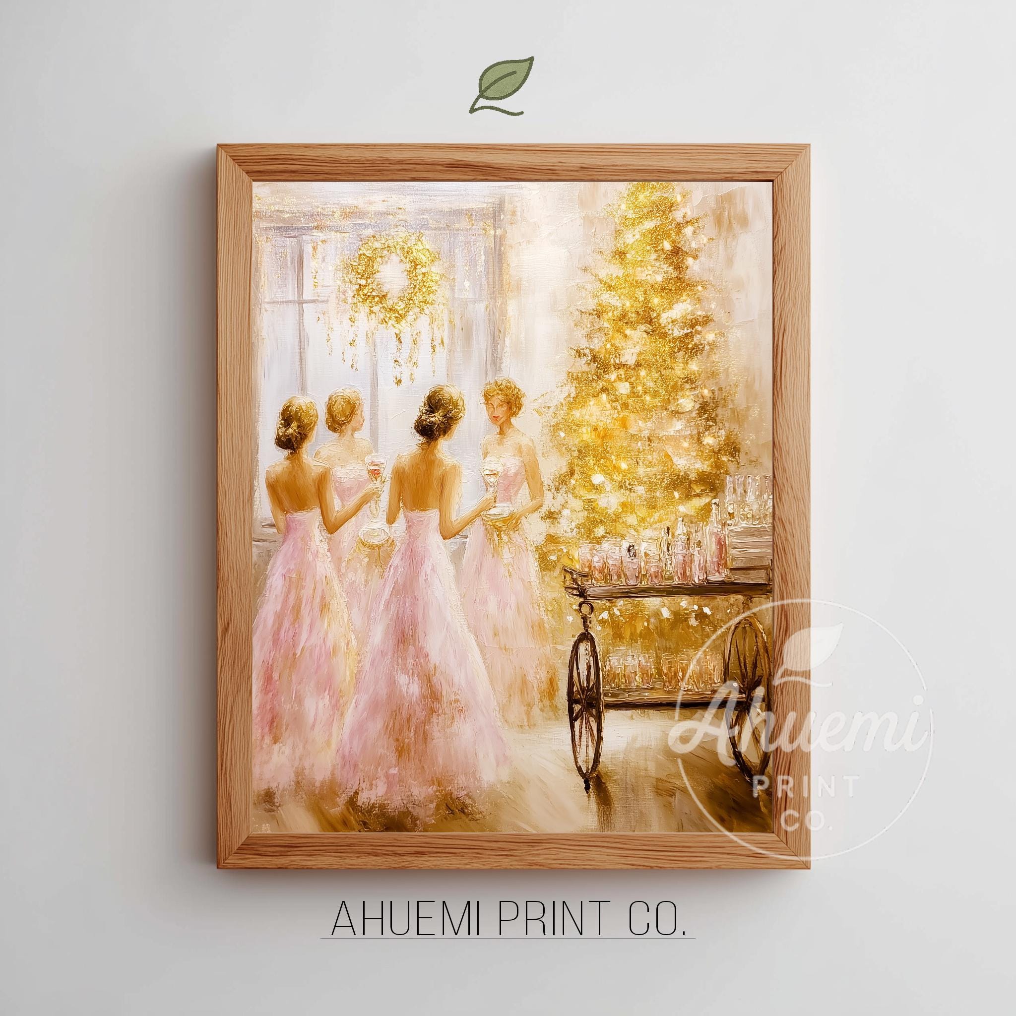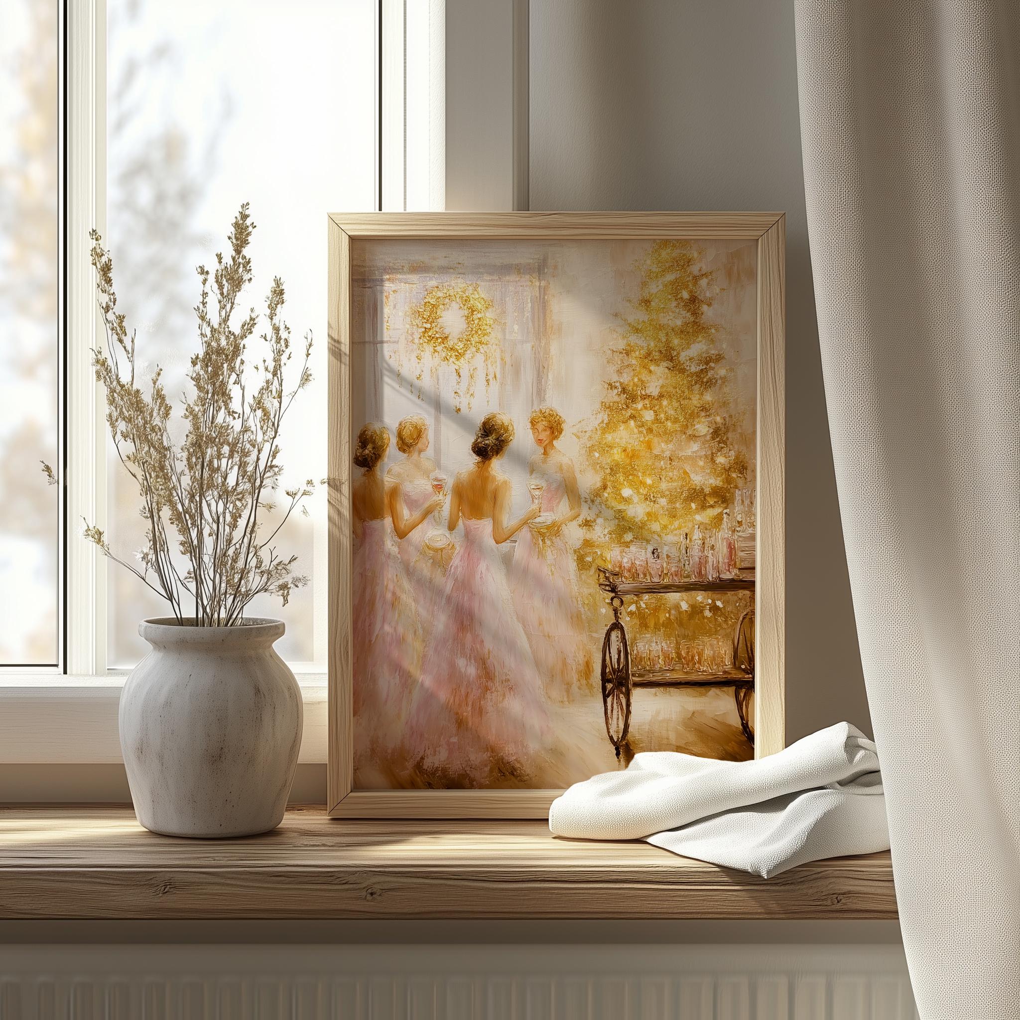 Immerse yourself in the charm with this rustic painting of elegant women celebrating the holiday season in stylish blush cocktail dresses. An instantly downloadable print, it's perfect for elevating your decor with budget-friendly charm. This gives you the flexibility to customize the size, frame, and material according to your personal taste and space, ensuring a perfect fit for your walls.