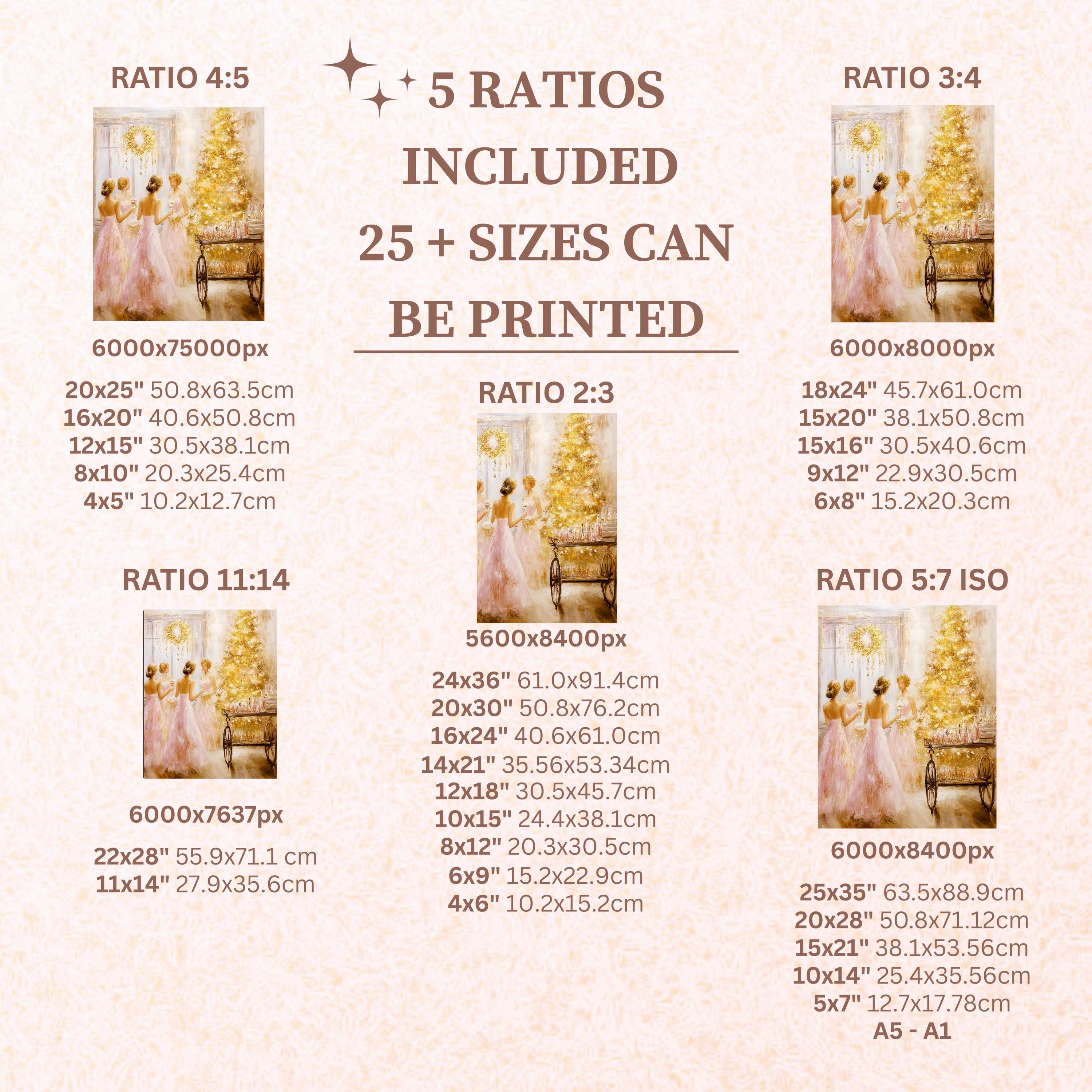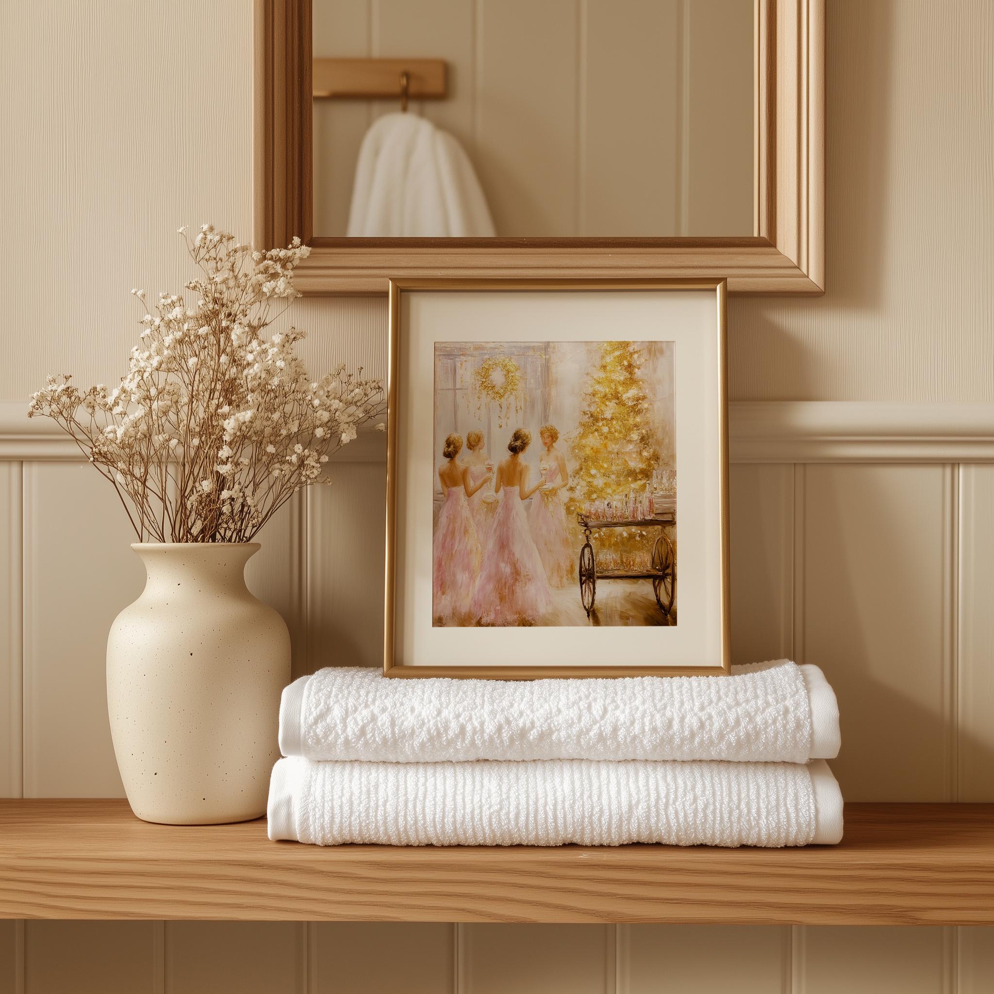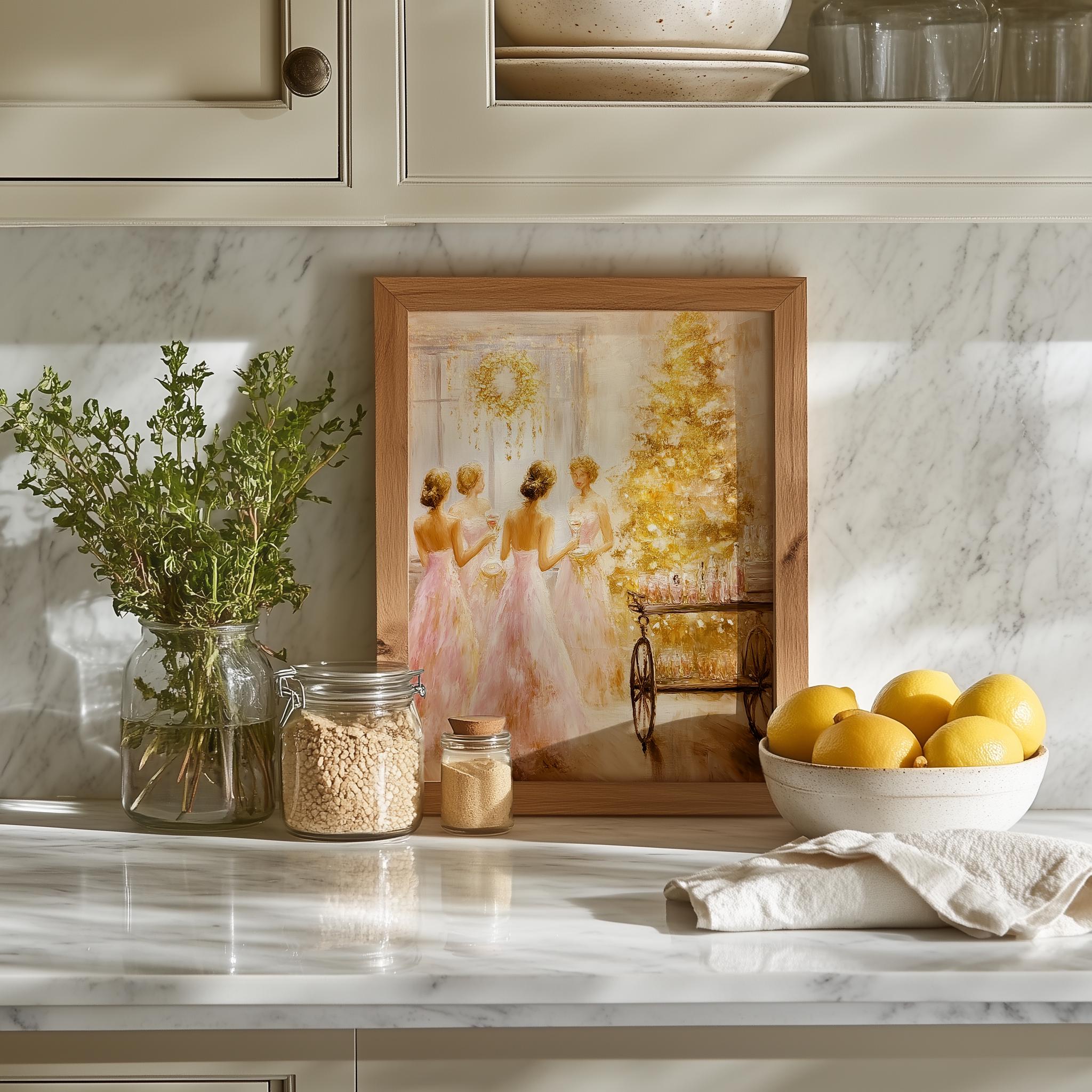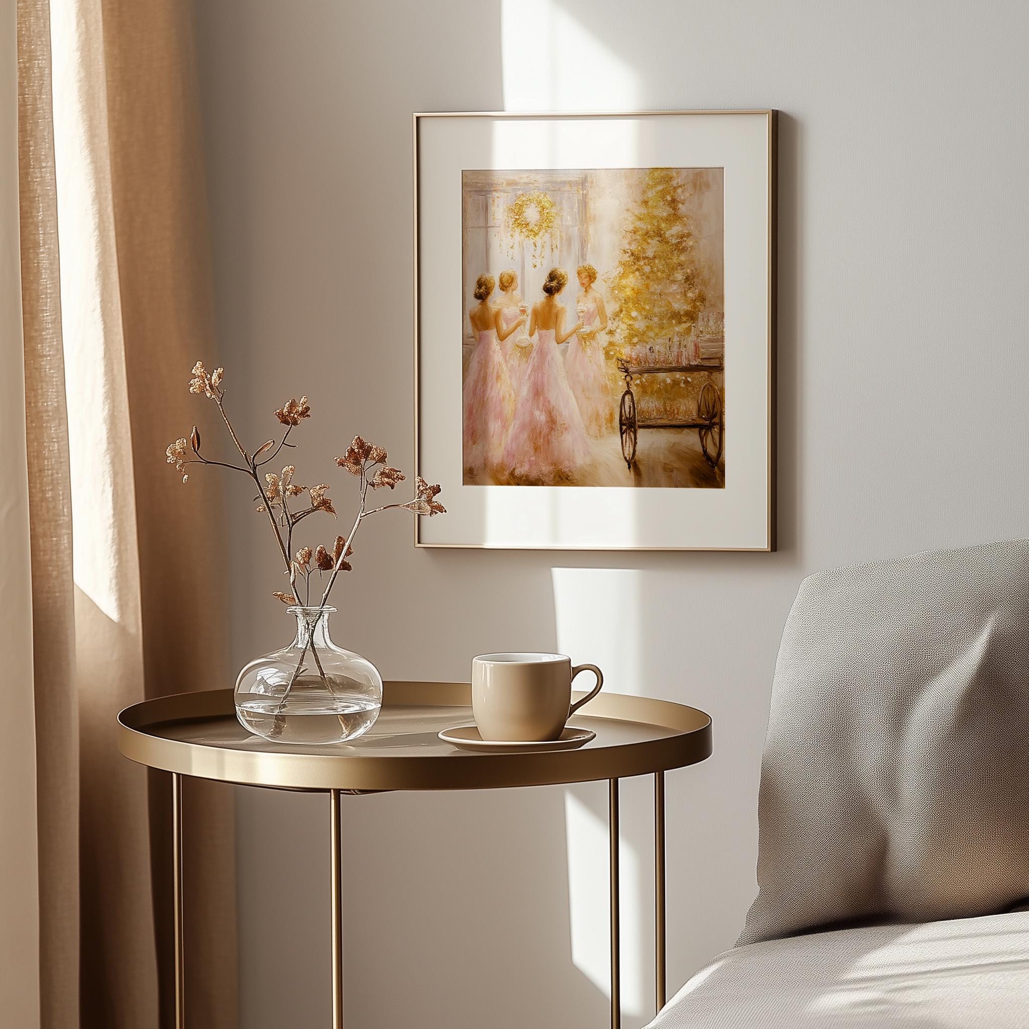 Immerse yourself in the charm with this rustic painting of elegant women celebrating the holiday season in stylish blush cocktail dresses. An instantly downloadable print, it's perfect for elevating your decor with budget-friendly charm. This gives you the flexibility to customize the size, frame, and material according to your personal taste and space, ensuring a perfect fit for your walls.