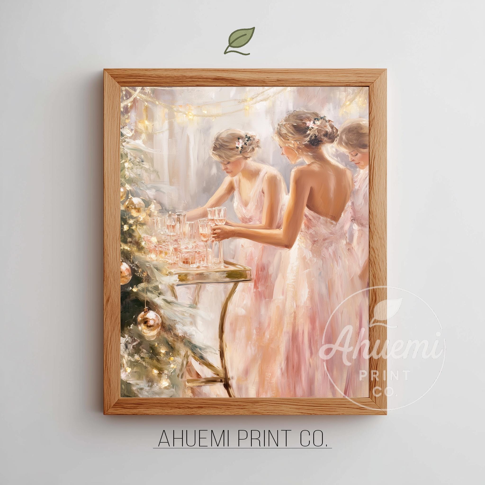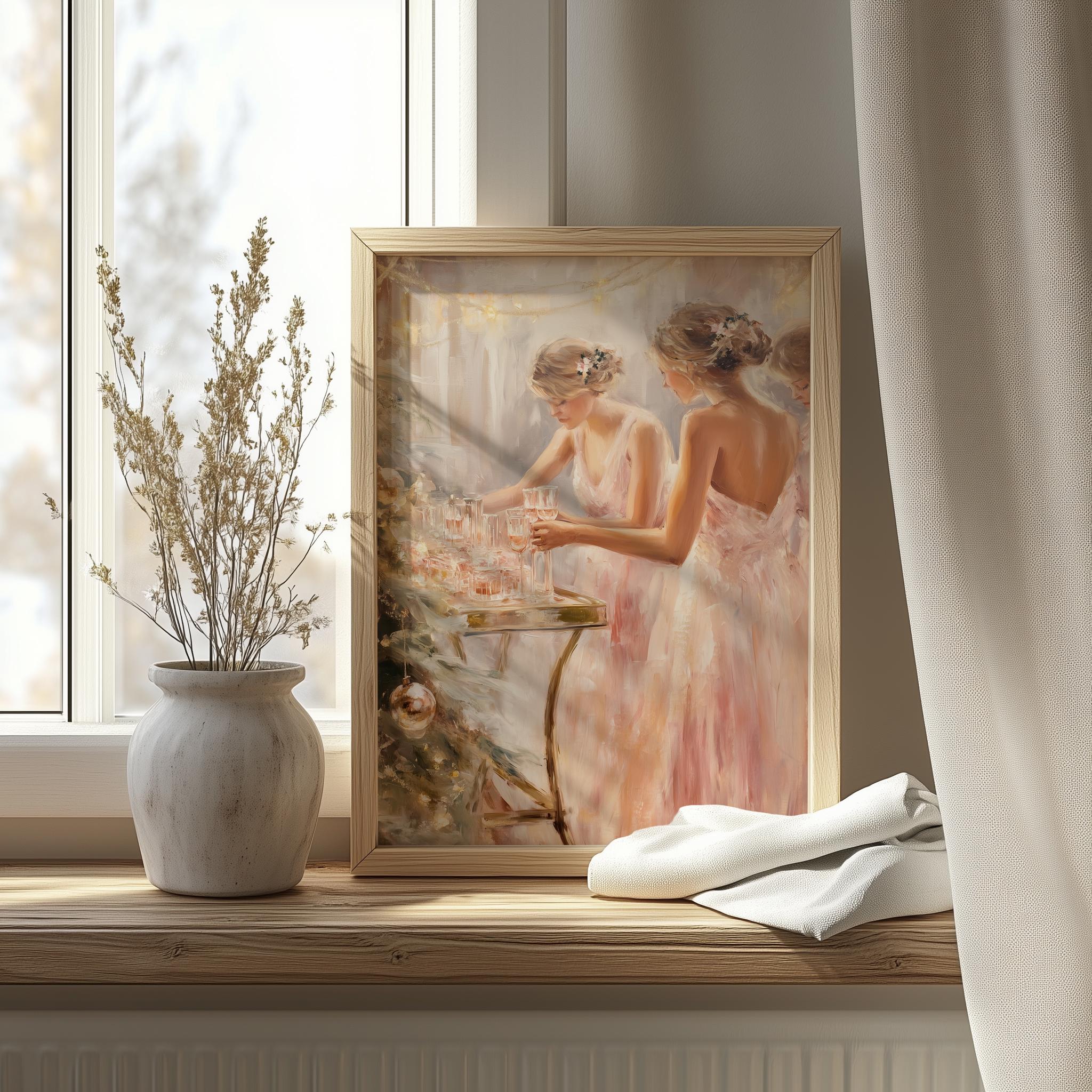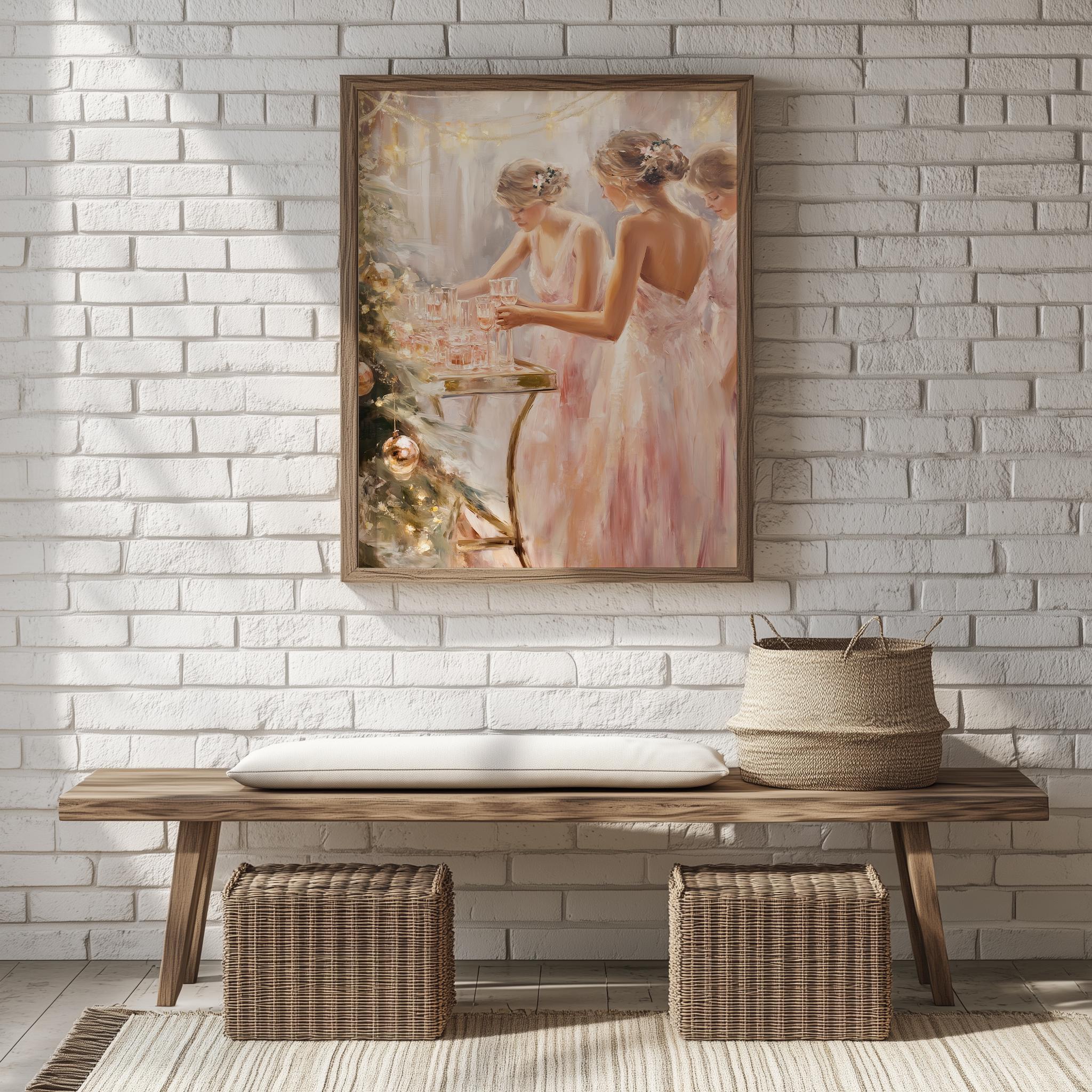 Immerse yourself in the charm with this rustic painting of elegant women celebrating a festive holiday party in a mid-century setting. An instantly downloadable print, it's perfect for elevating your decor with budget-friendly charm. This gives you the flexibility to customize the size, frame, and material according to your personal taste and space, ensuring a perfect fit for your walls.