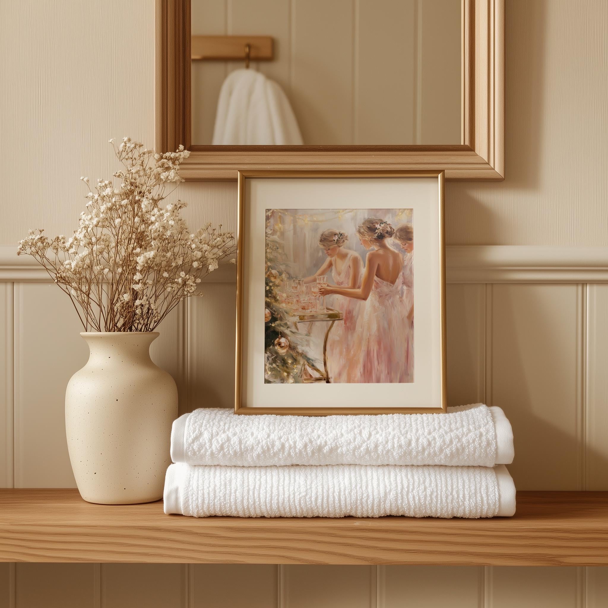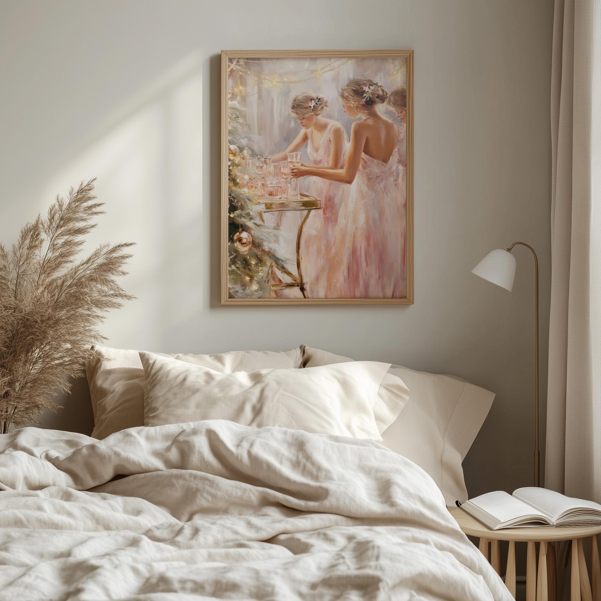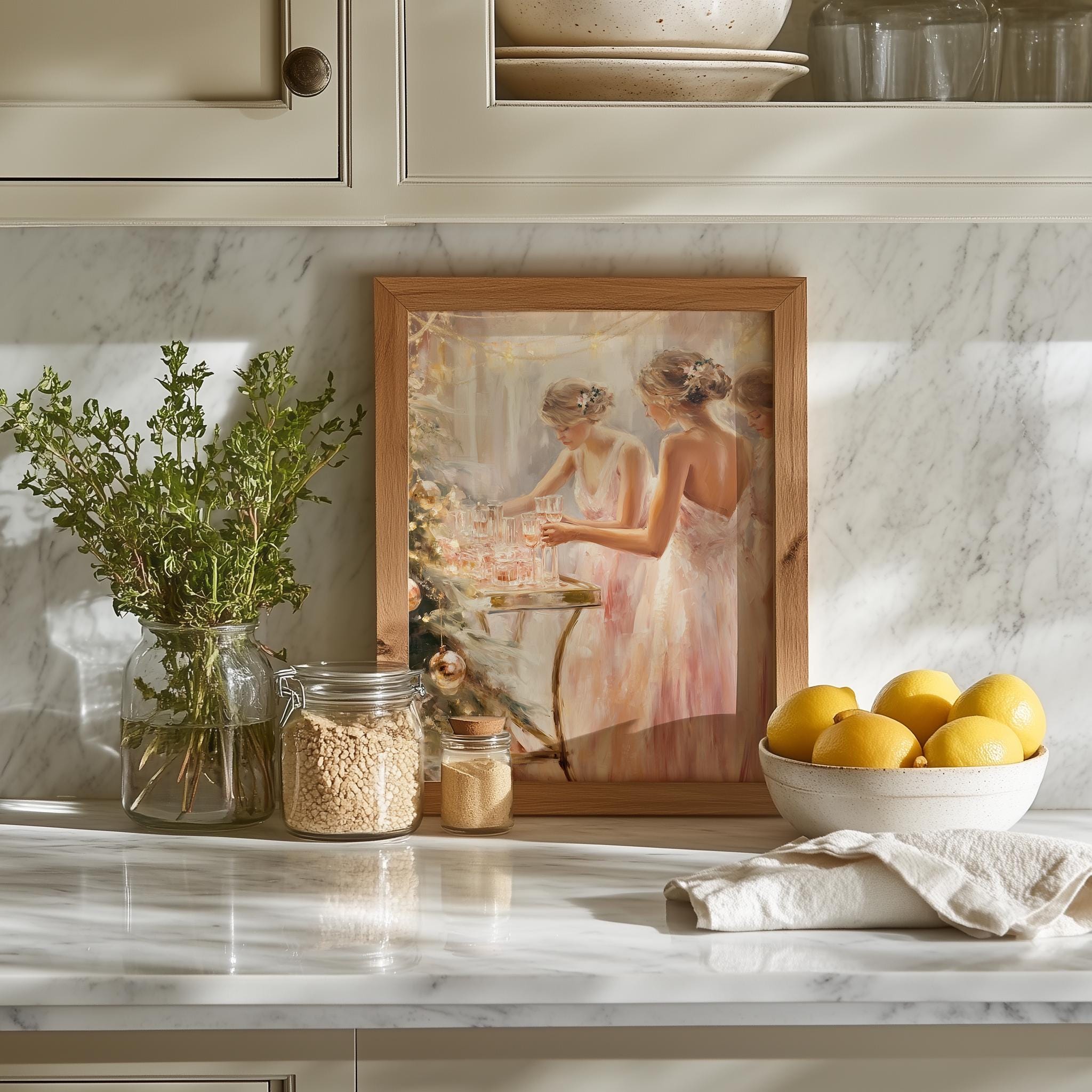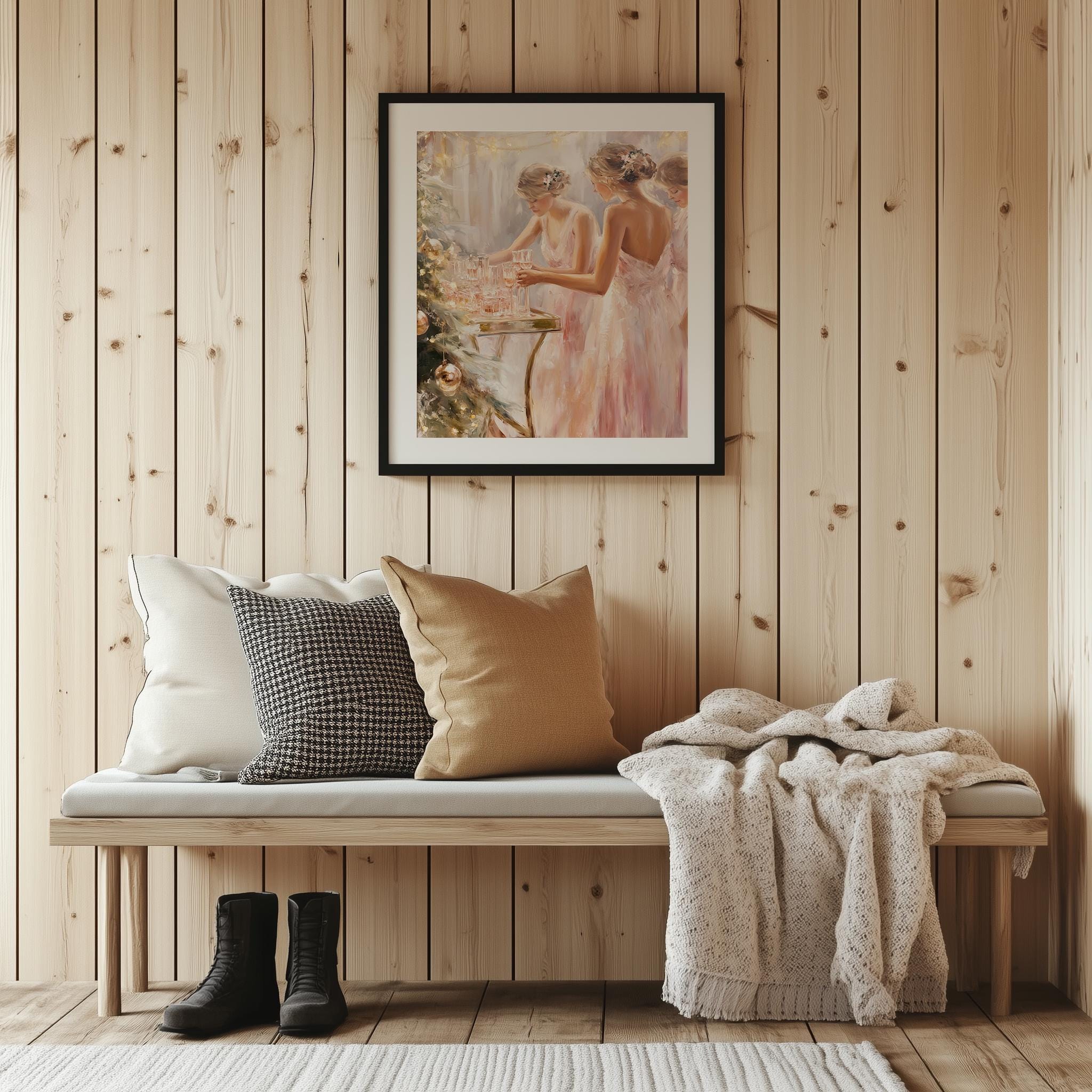 Immerse yourself in the charm with this rustic painting of elegant women celebrating a festive holiday party in a mid-century setting. An instantly downloadable print, it's perfect for elevating your decor with budget-friendly charm. This gives you the flexibility to customize the size, frame, and material according to your personal taste and space, ensuring a perfect fit for your walls.