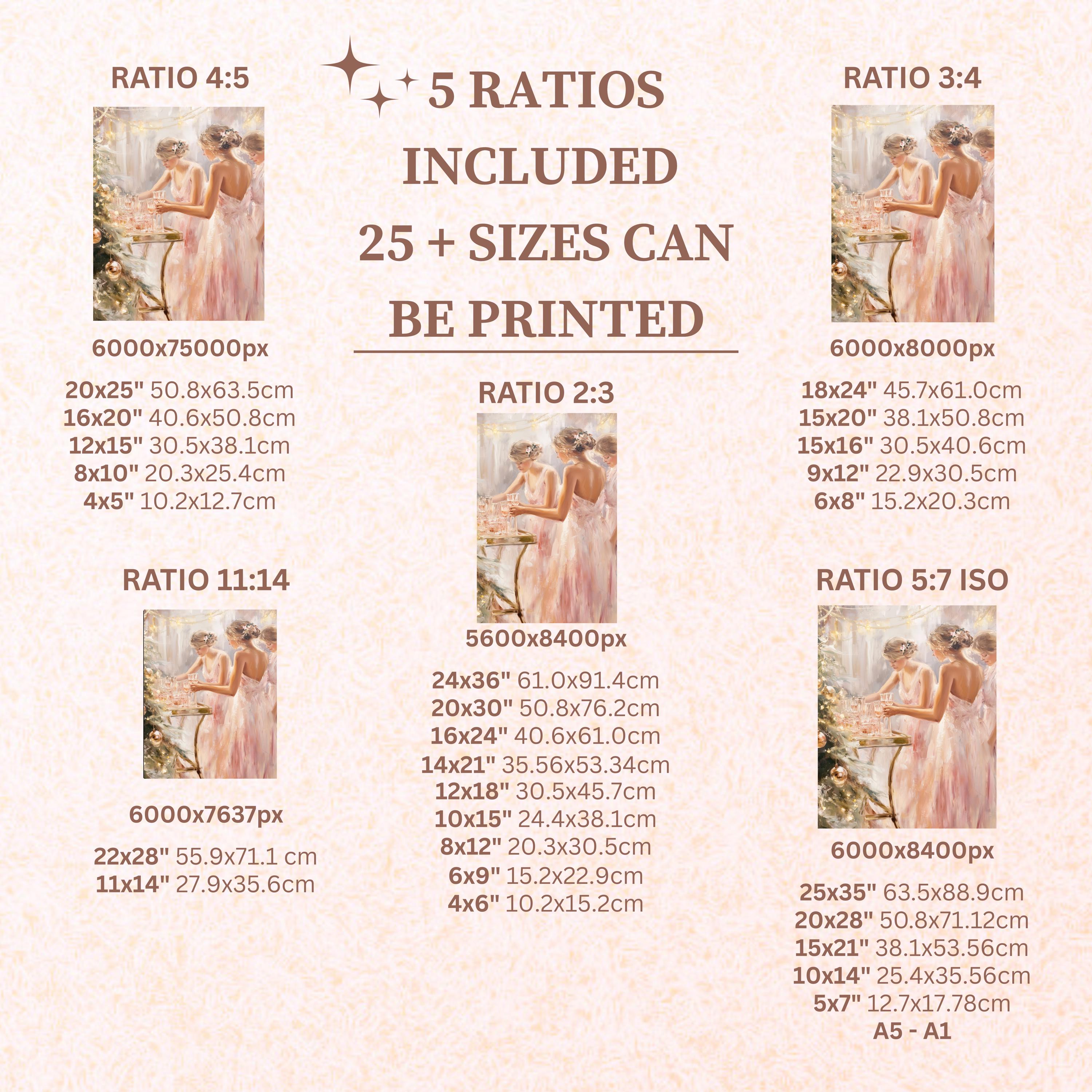 Each artwork includes 5 aspect ratios with 25+ print sizes. Most standard frames are covered. One custom resize per purchase available—message before ordering.