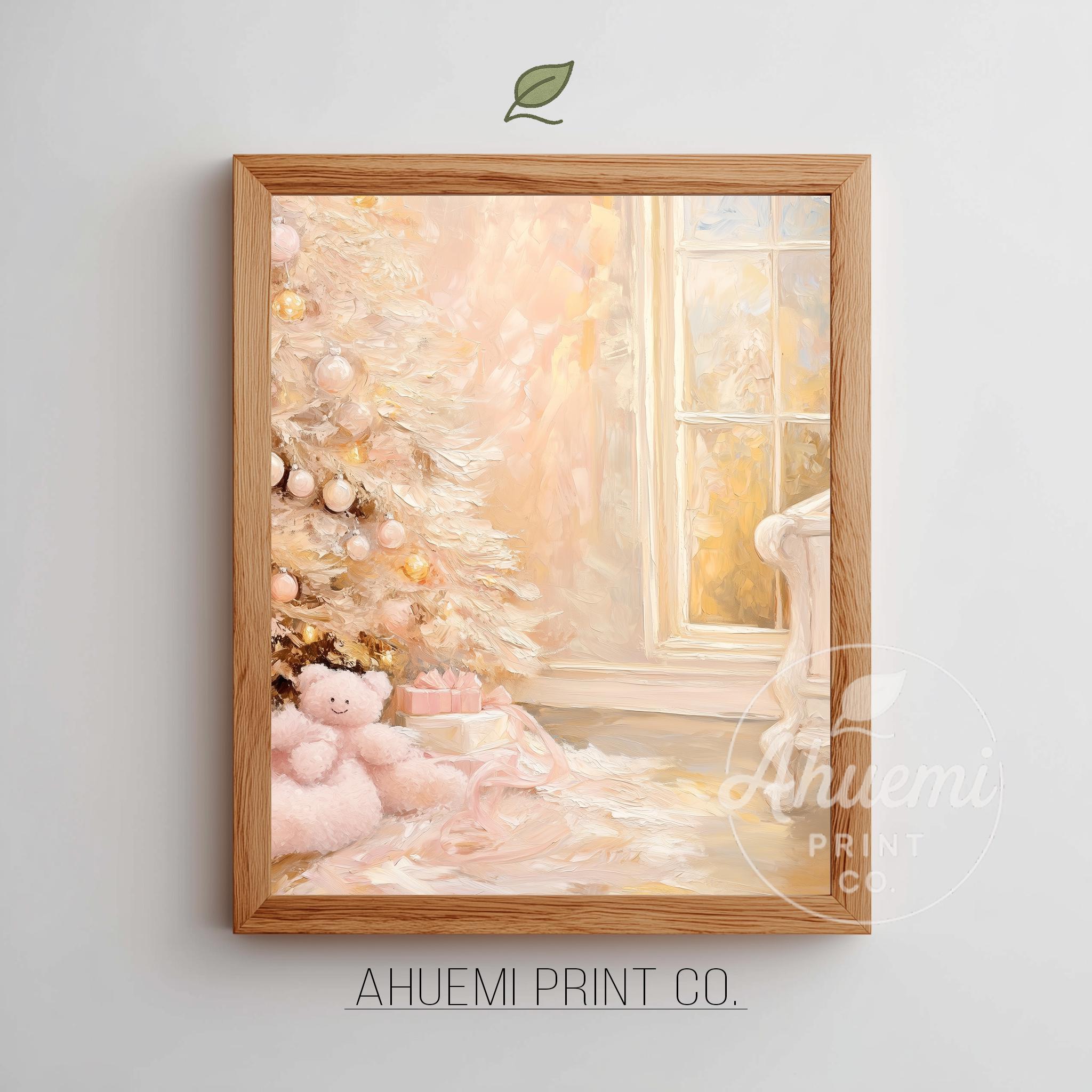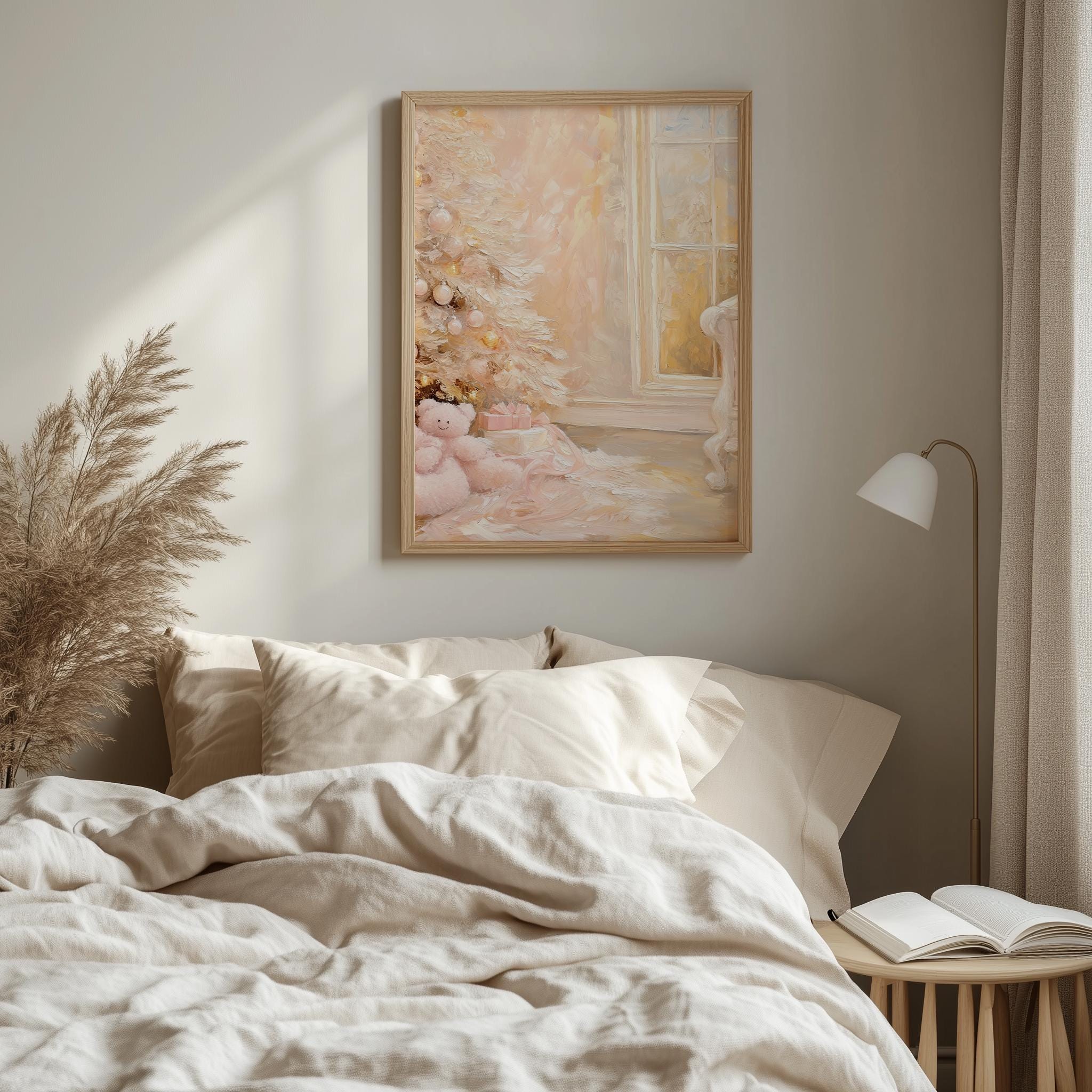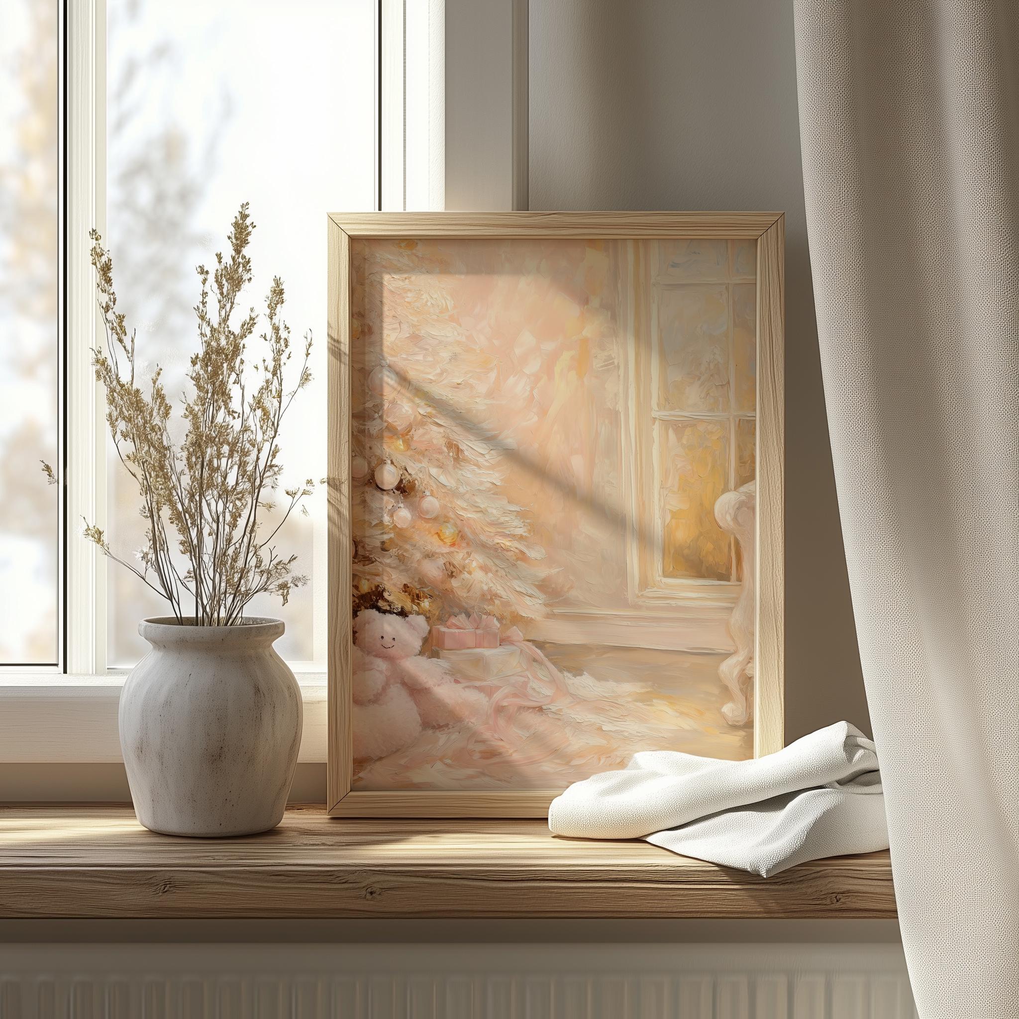Immerse yourself in the charm with this rustic painting of a delicate pale pink Christmas tree adorned with handmade ornaments. An instantly downloadable print, it's perfect for elevating your decor with budget-friendly charm. This gives you the flexibility to customize the size, frame, and material according to your personal taste and space, ensuring a perfect fit for your walls.