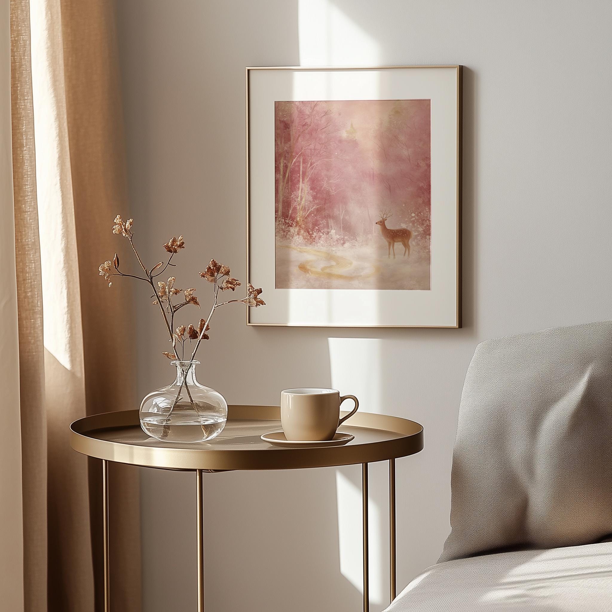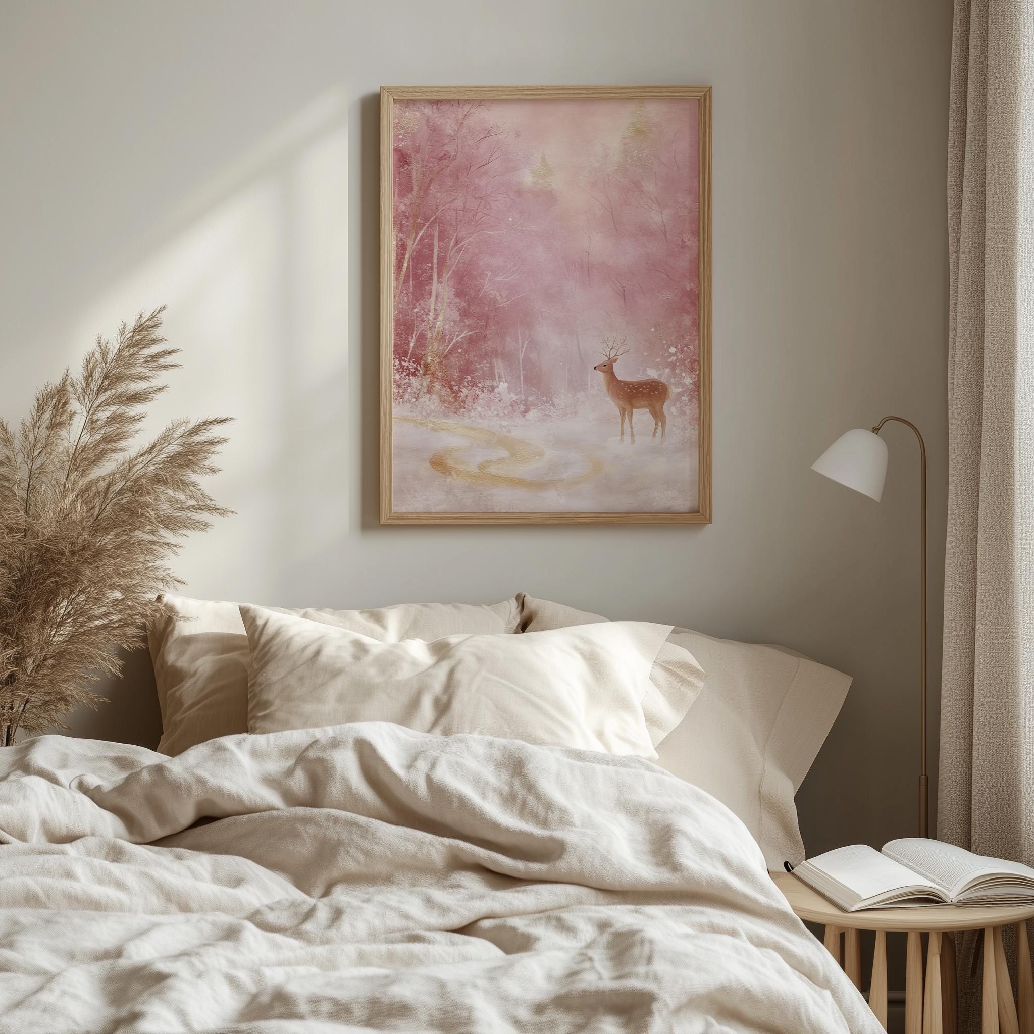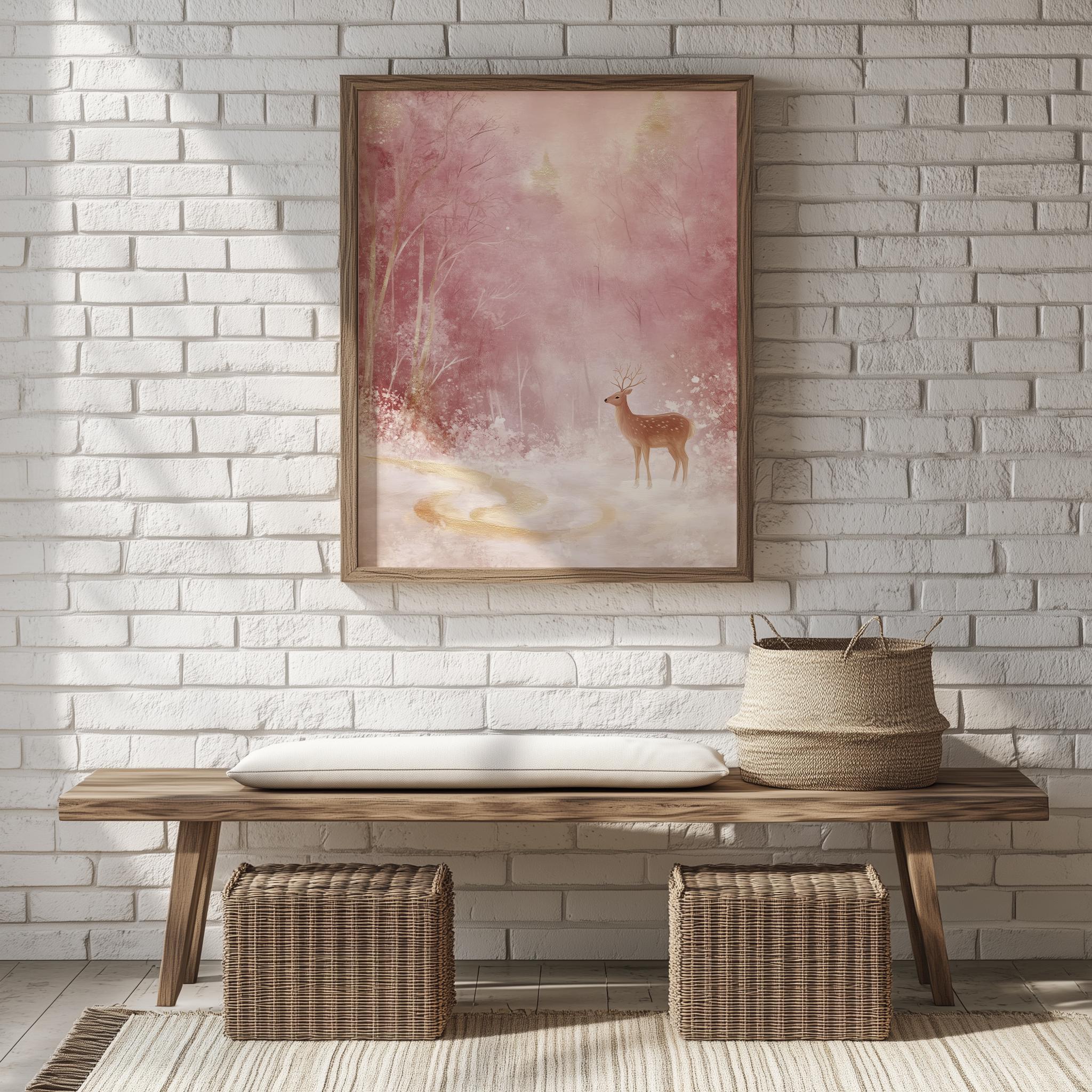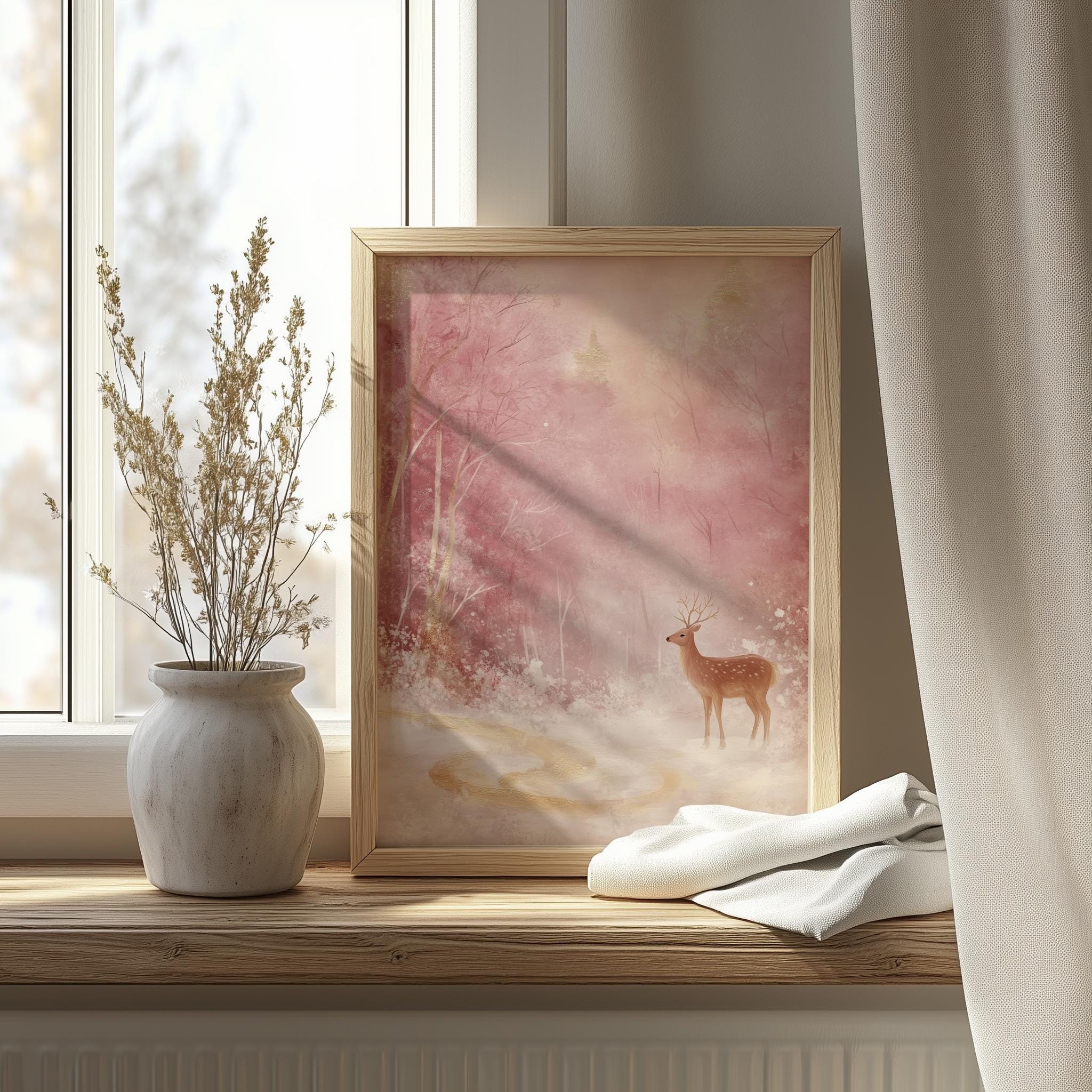 Immerse yourself in the charm with this rustic painting of a serene pastel deer gracefully wandering through a snowy twilight forest. An instantly downloadable print, it's perfect for elevating your decor with budget-friendly charm. This gives you the flexibility to customize the size, frame, and material according to your personal taste and space, ensuring a perfect fit for your walls.