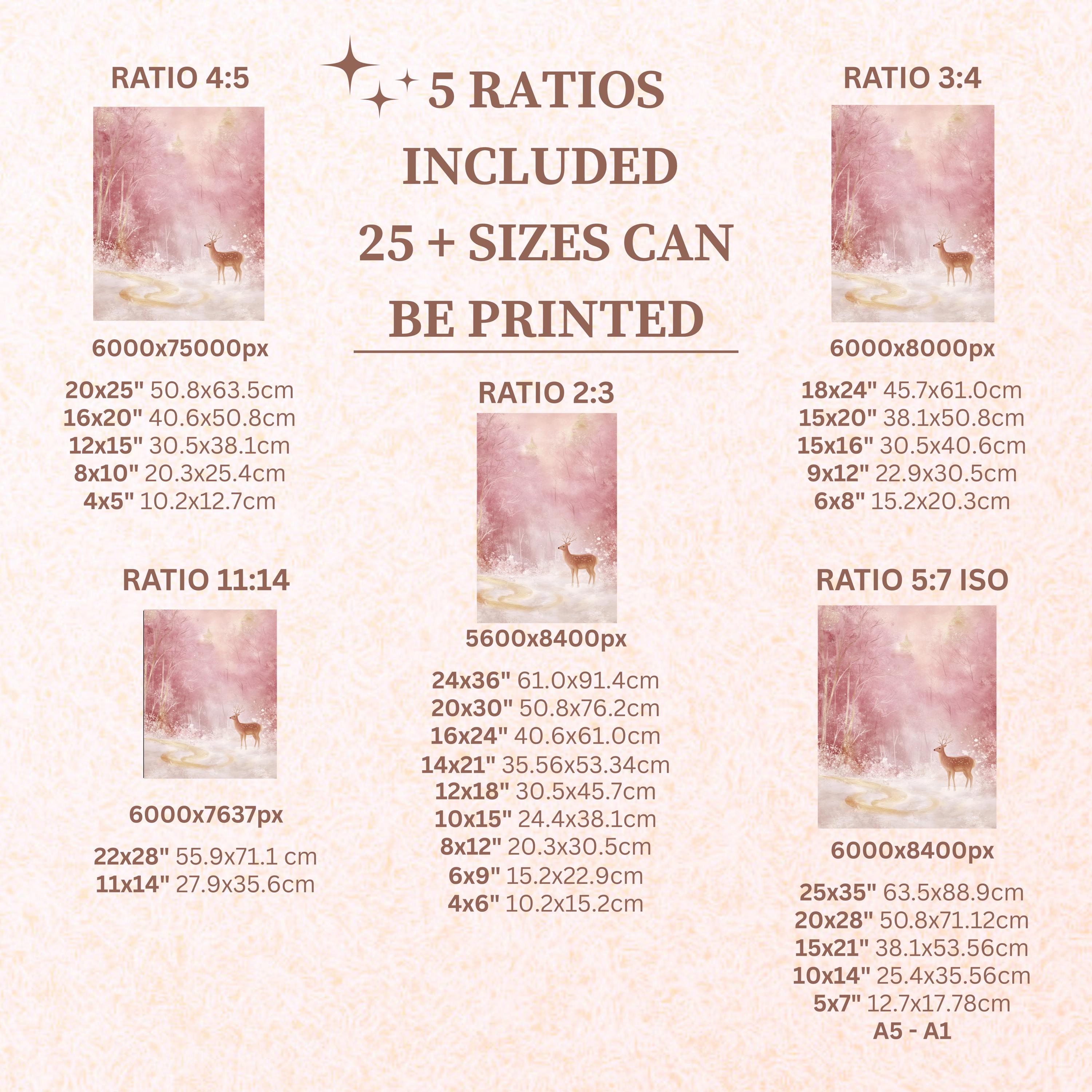 Each artwork includes 5 aspect ratios with 25+ print sizes. Most standard frames are covered. One custom resize per purchase available—message before ordering.