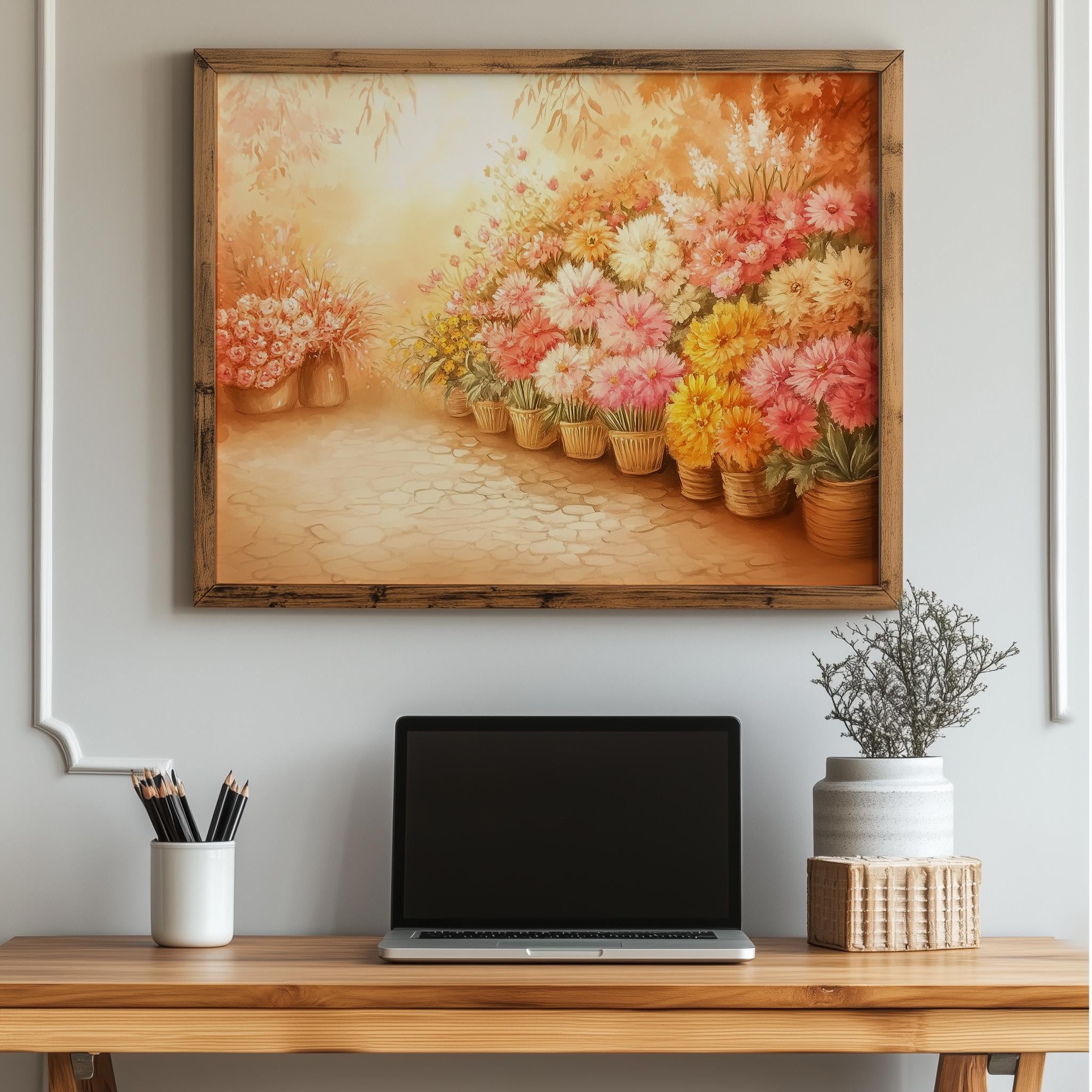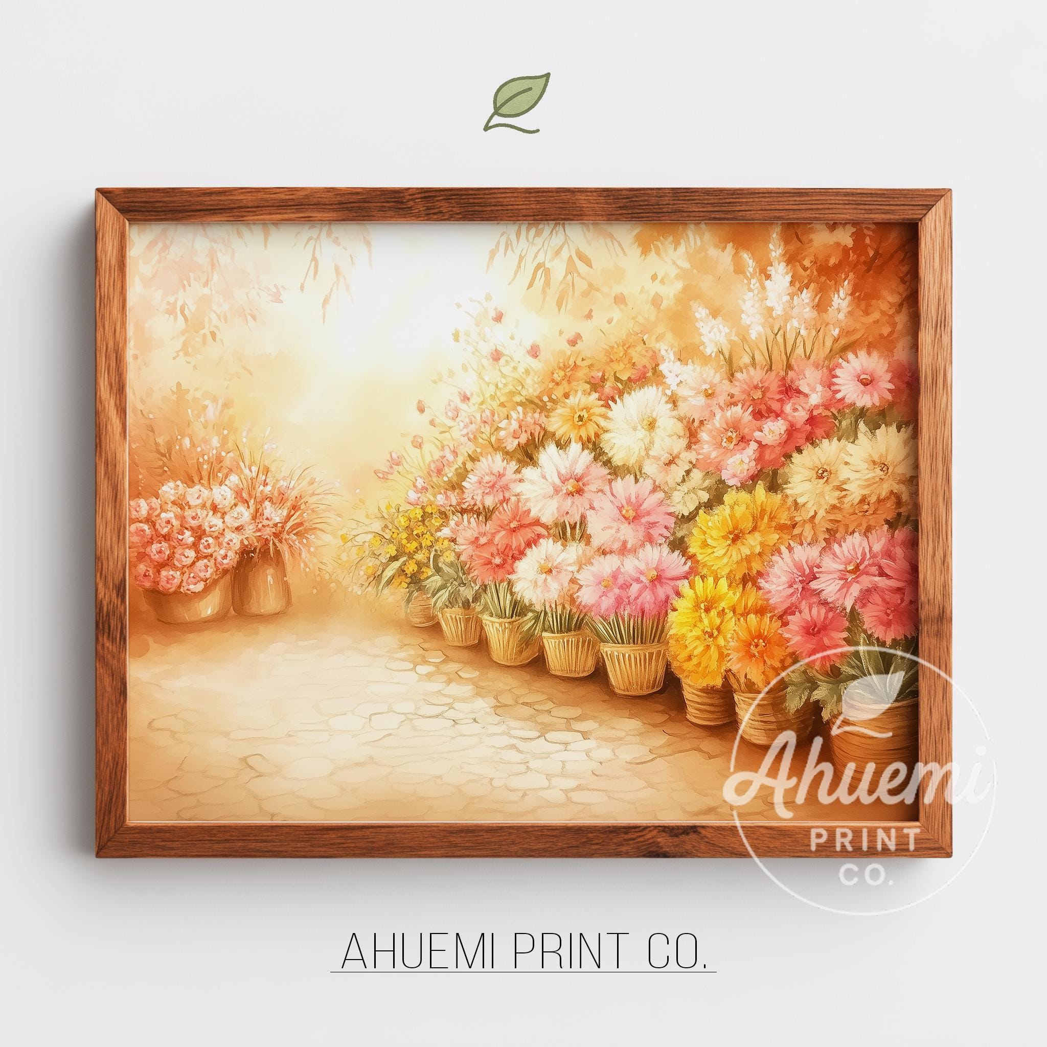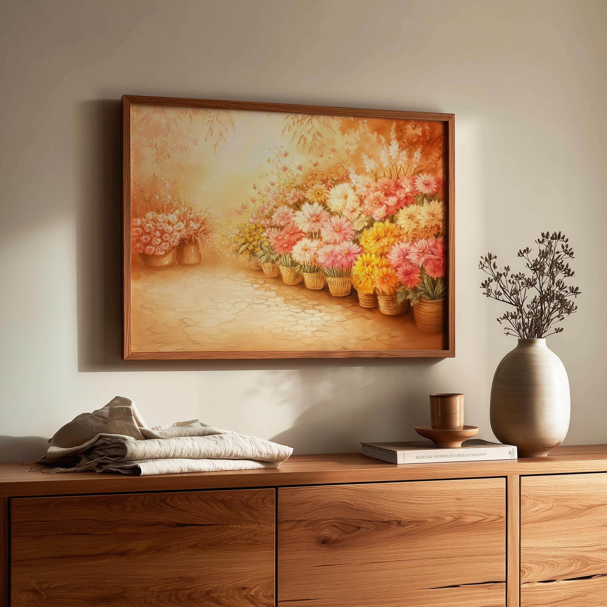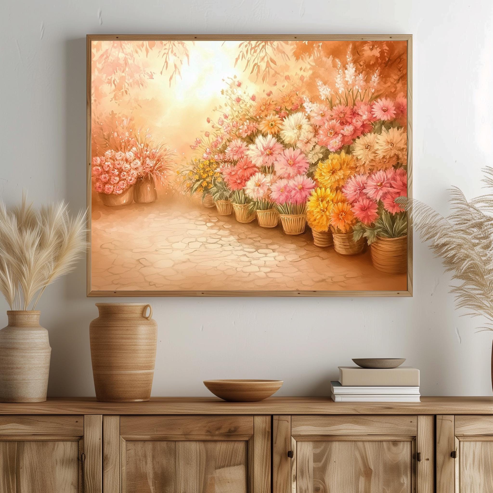 Immerse yourself in the charm with this rustic painting of a charming European flower market, filled with vibrant blooms and cozy details. An instantly downloadable print, it's perfect for elevating your decor with budget-friendly charm. This gives you the flexibility to customize the size, frame, and material according to your personal taste and space, ensuring a perfect fit for your walls.