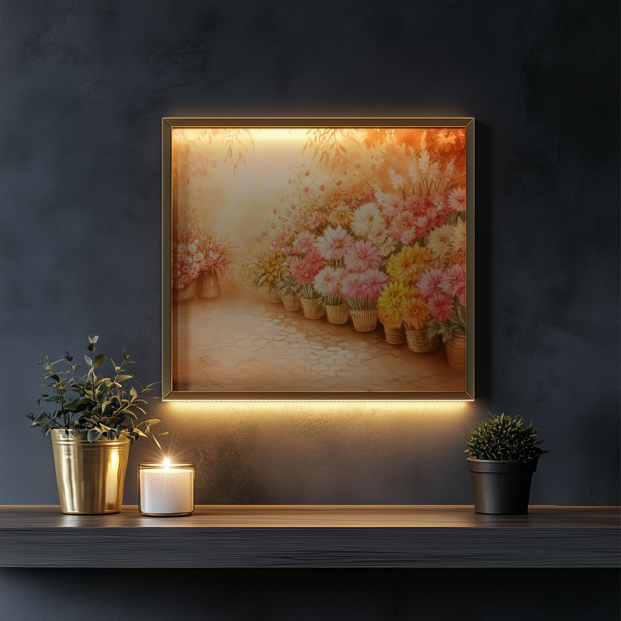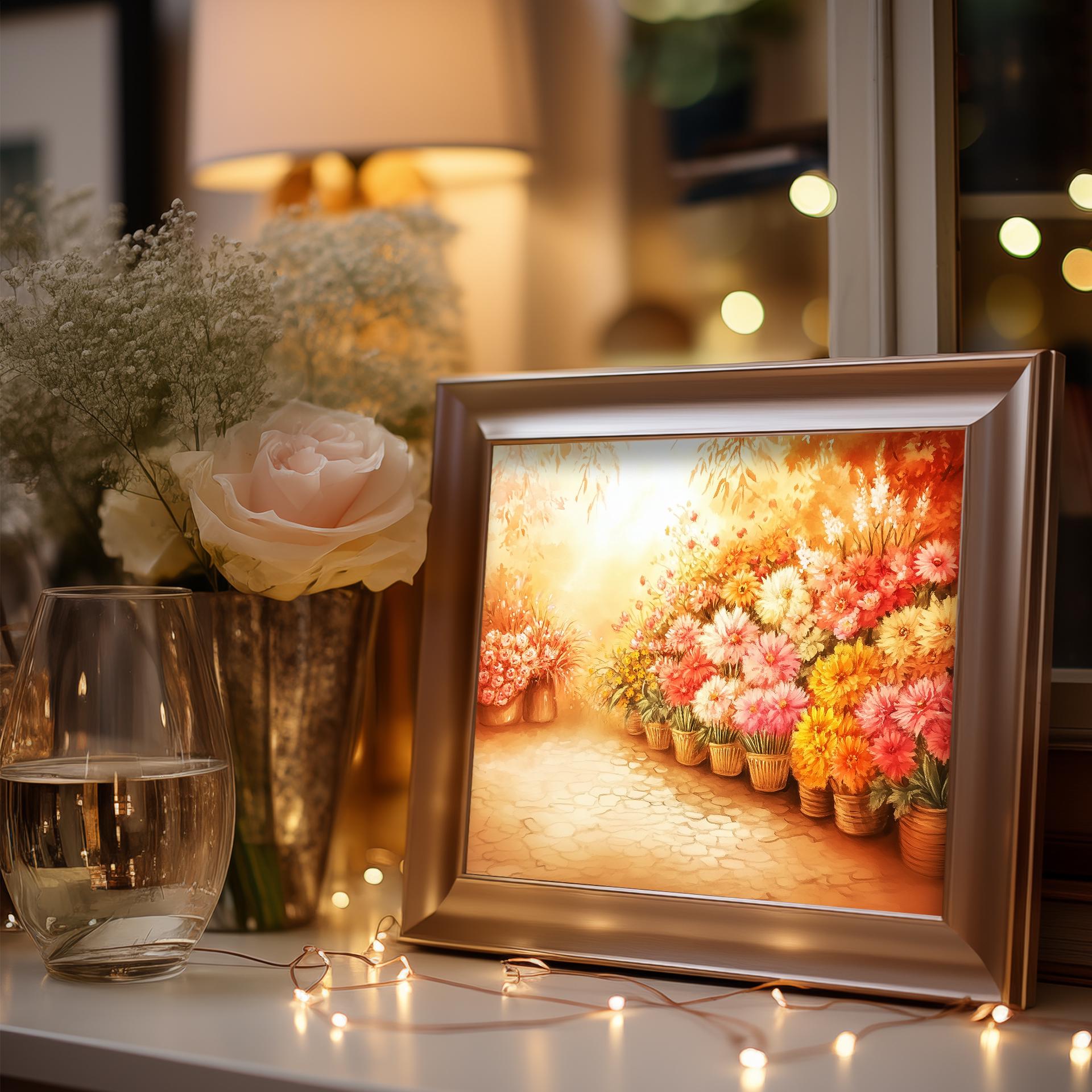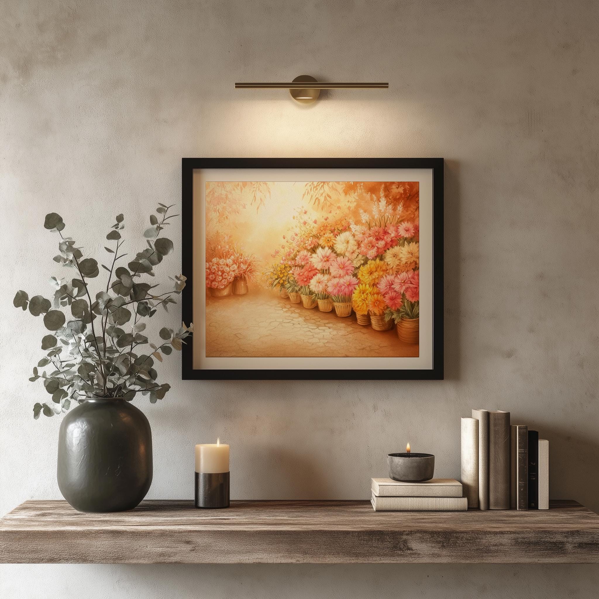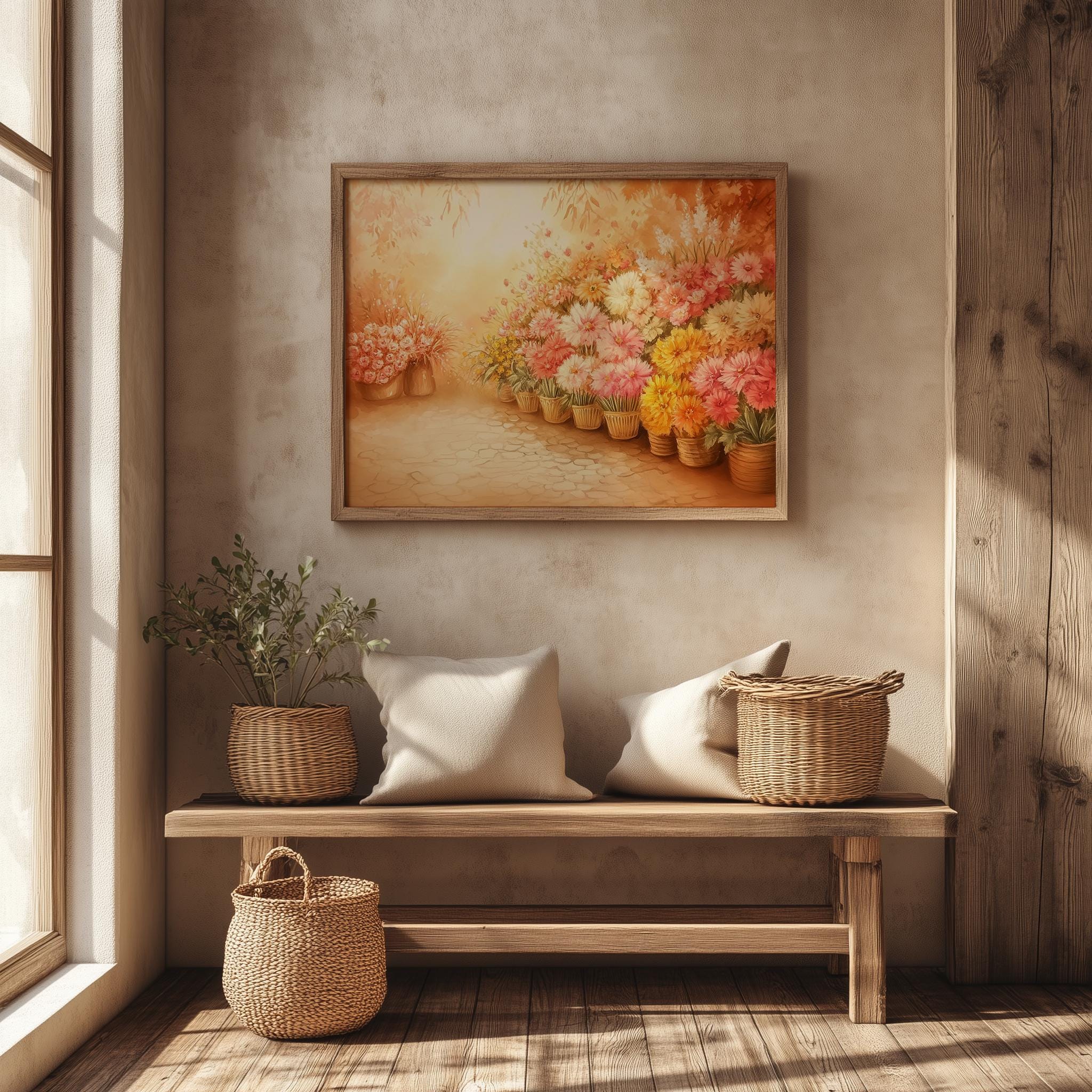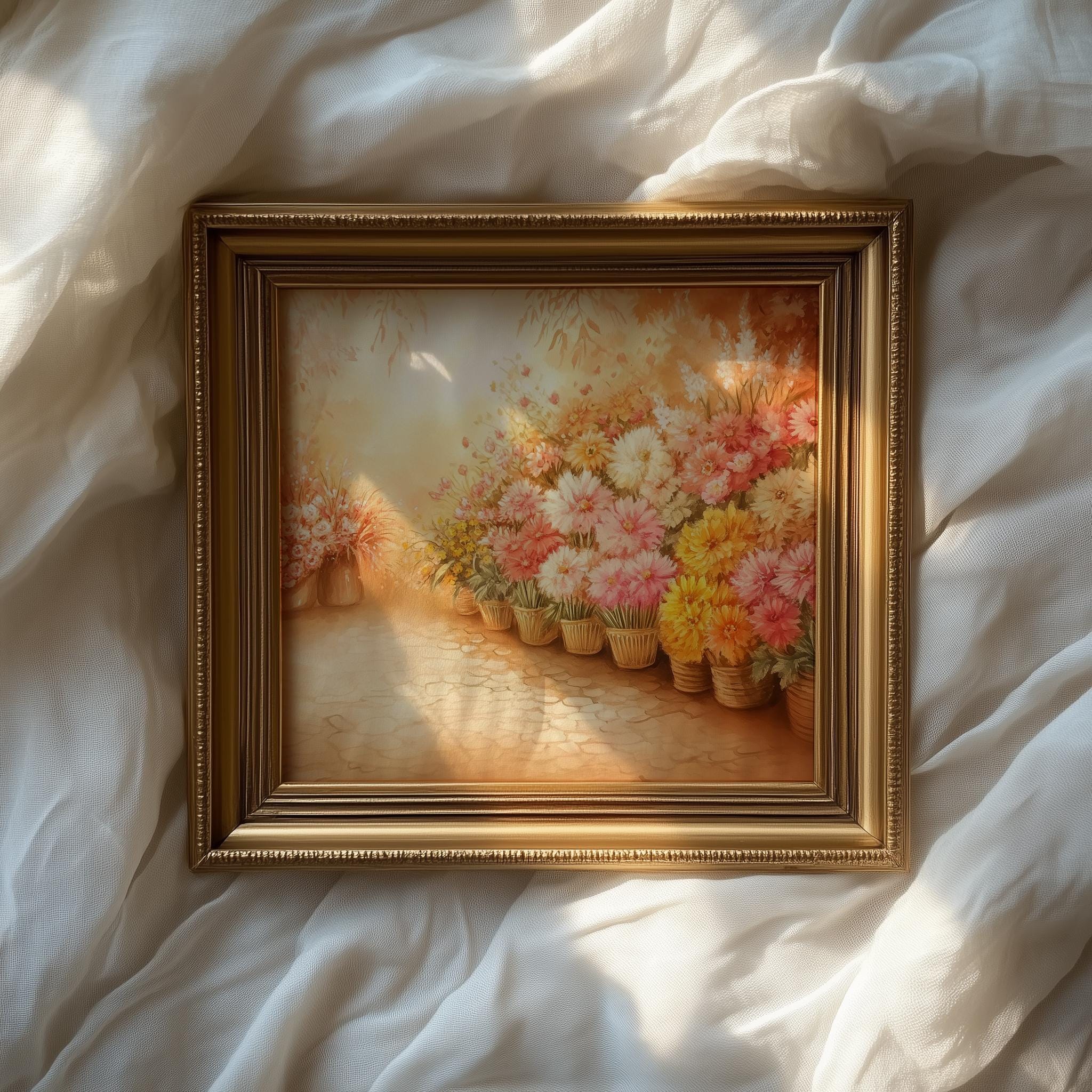 Immerse yourself in the charm with this rustic painting of a charming European flower market, filled with vibrant blooms and cozy details. An instantly downloadable print, it's perfect for elevating your decor with budget-friendly charm. This gives you the flexibility to customize the size, frame, and material according to your personal taste and space, ensuring a perfect fit for your walls.