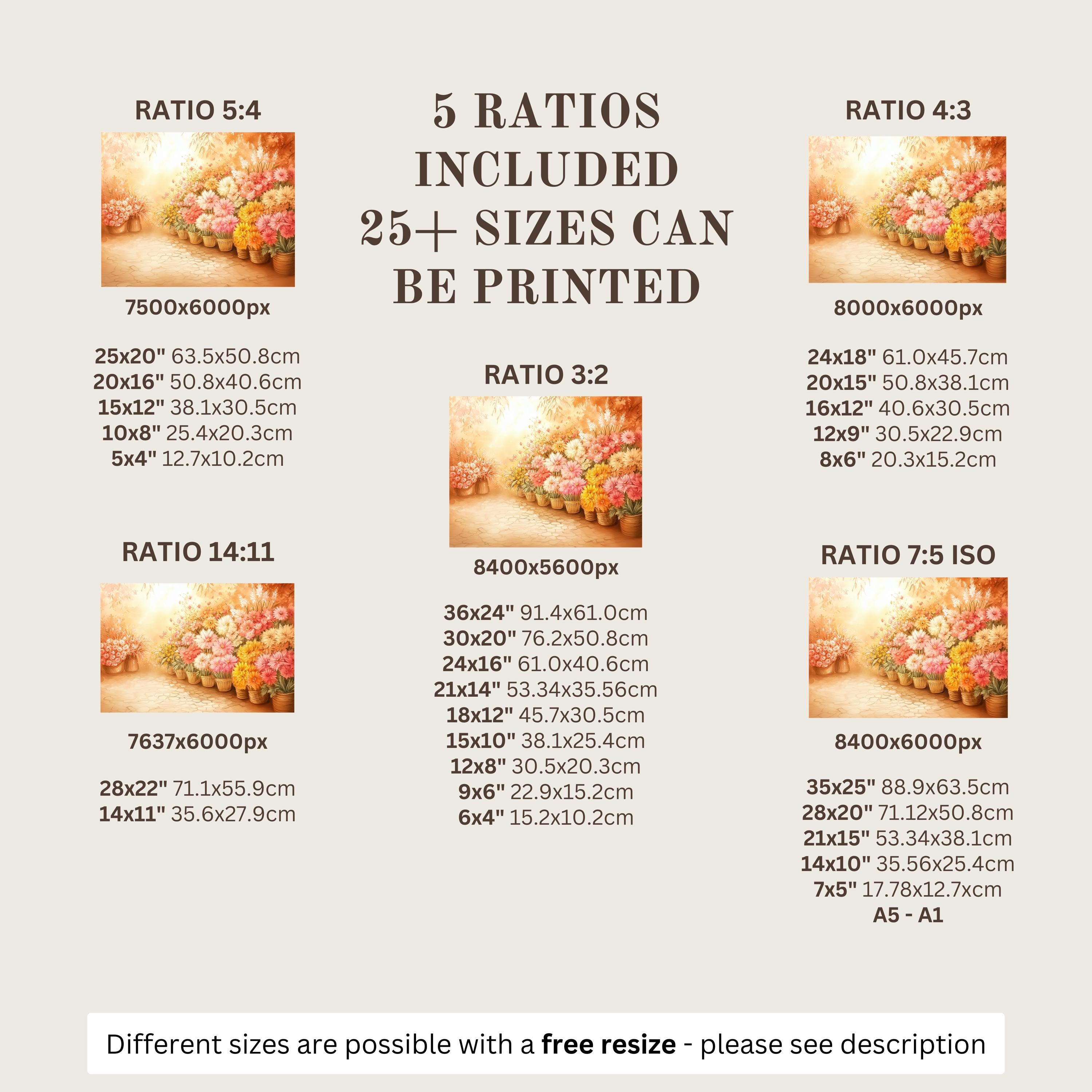 Each artwork includes 5 aspect ratios with 25+ print sizes. Most standard frames are covered. One custom resize per purchase available—message before ordering.