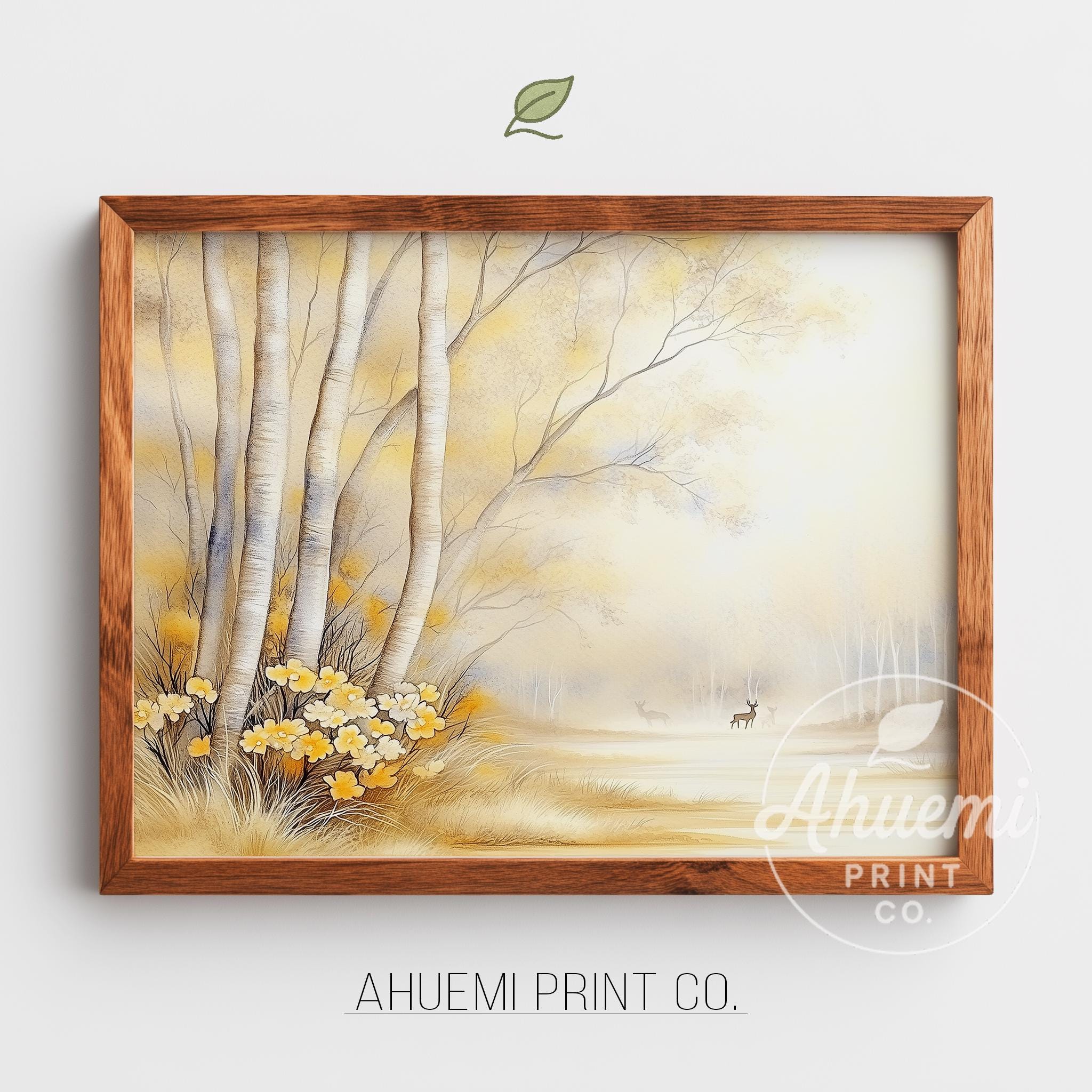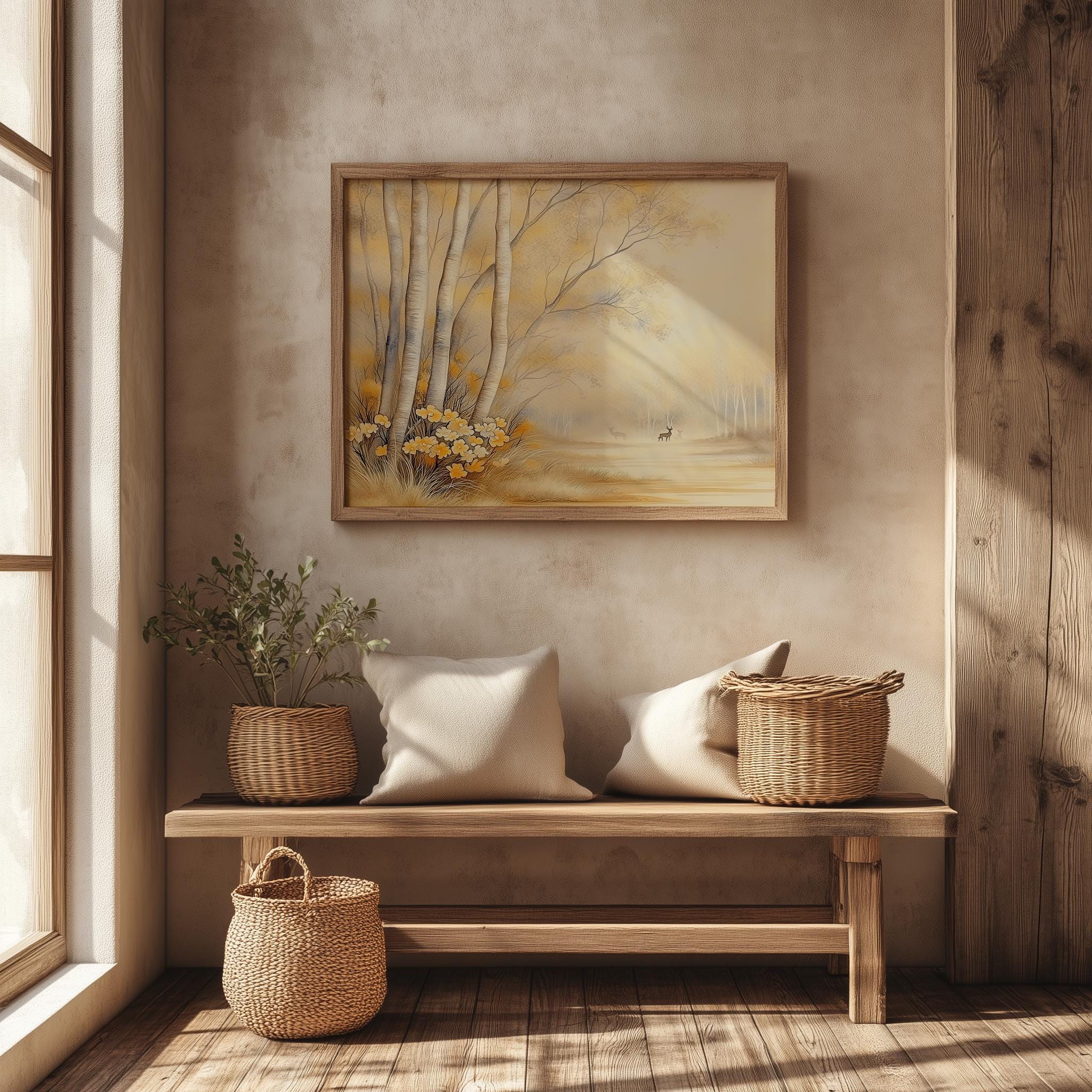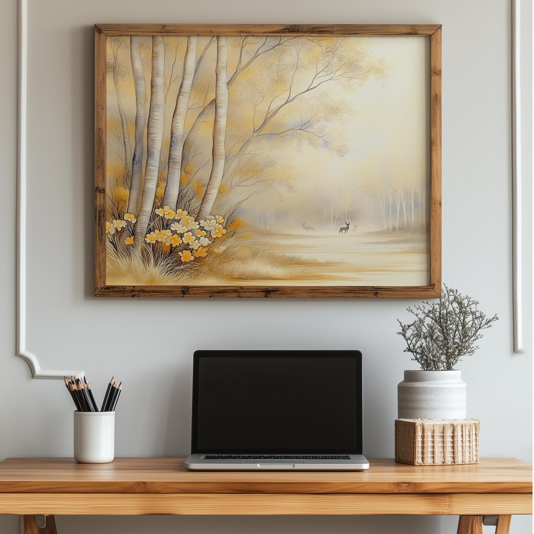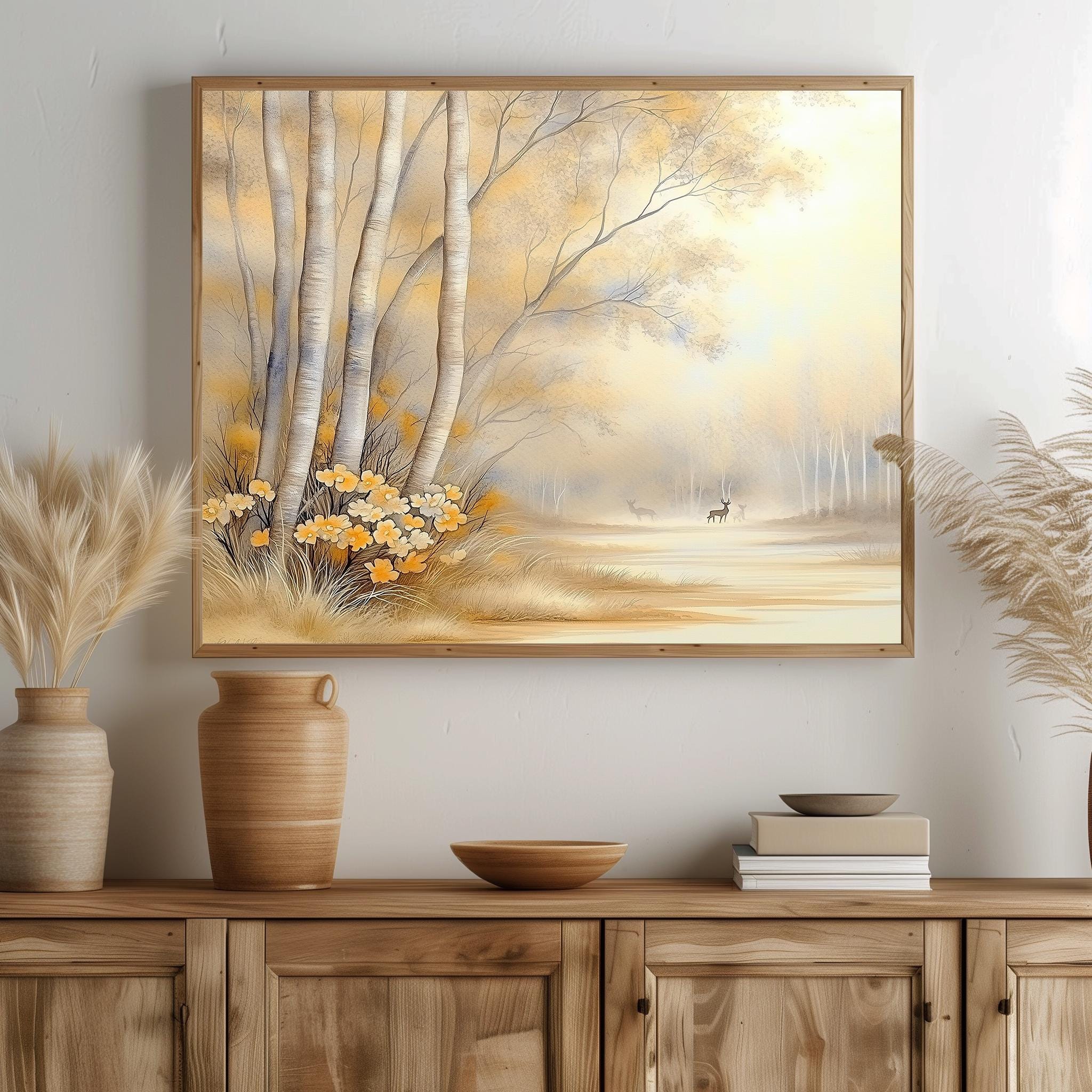 Immerse yourself in the charm with this rustic painting of a misty forest at dawn, featuring elegant birch trees surrounded by soft morning light. An instantly downloadable print, it's perfect for elevating your decor with budget-friendly charm. This gives you the flexibility to customize the size, frame, and material according to your personal taste and space, ensuring a perfect fit for your walls.