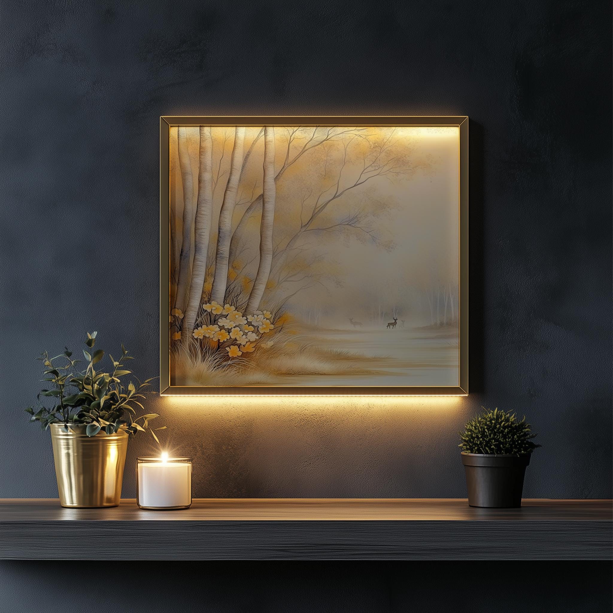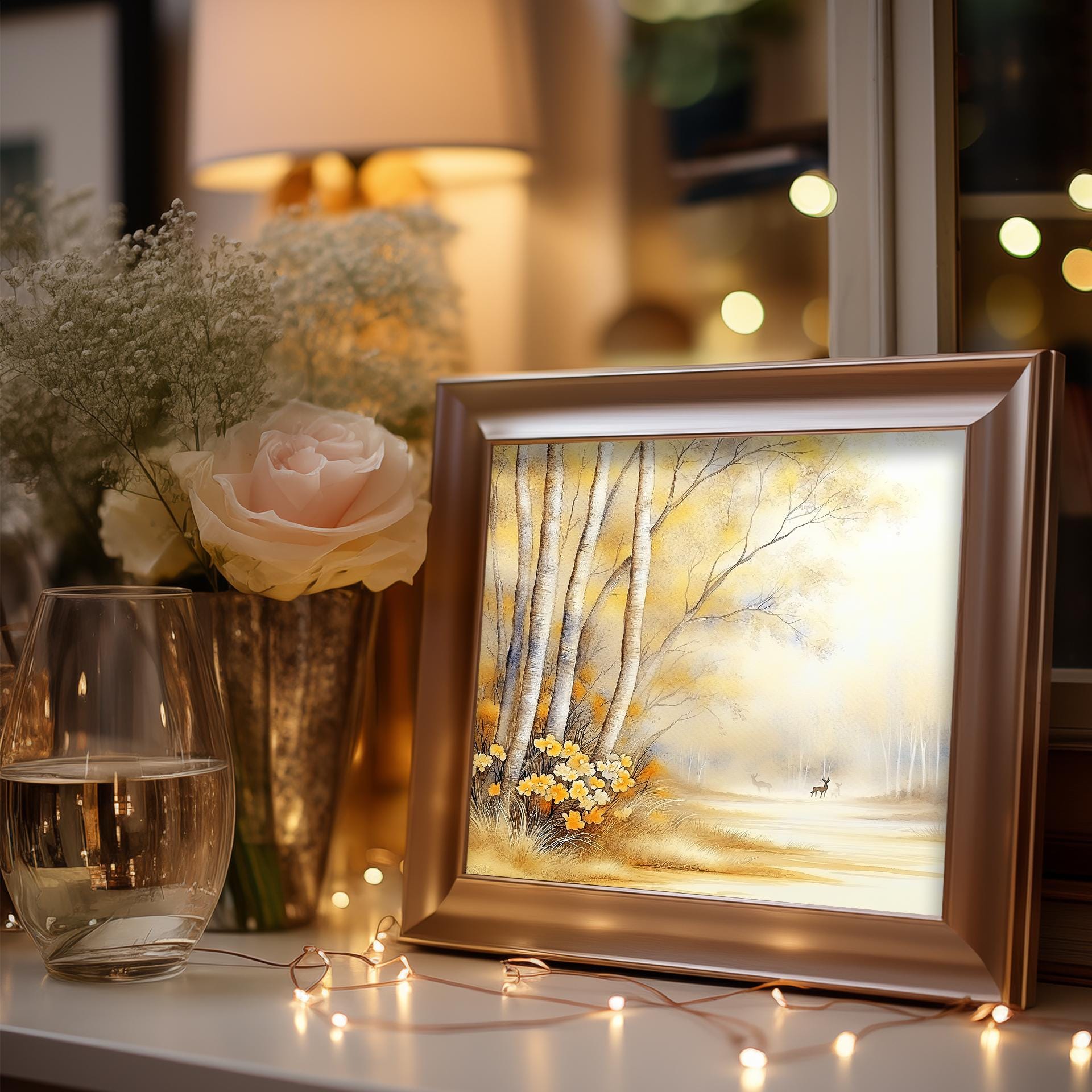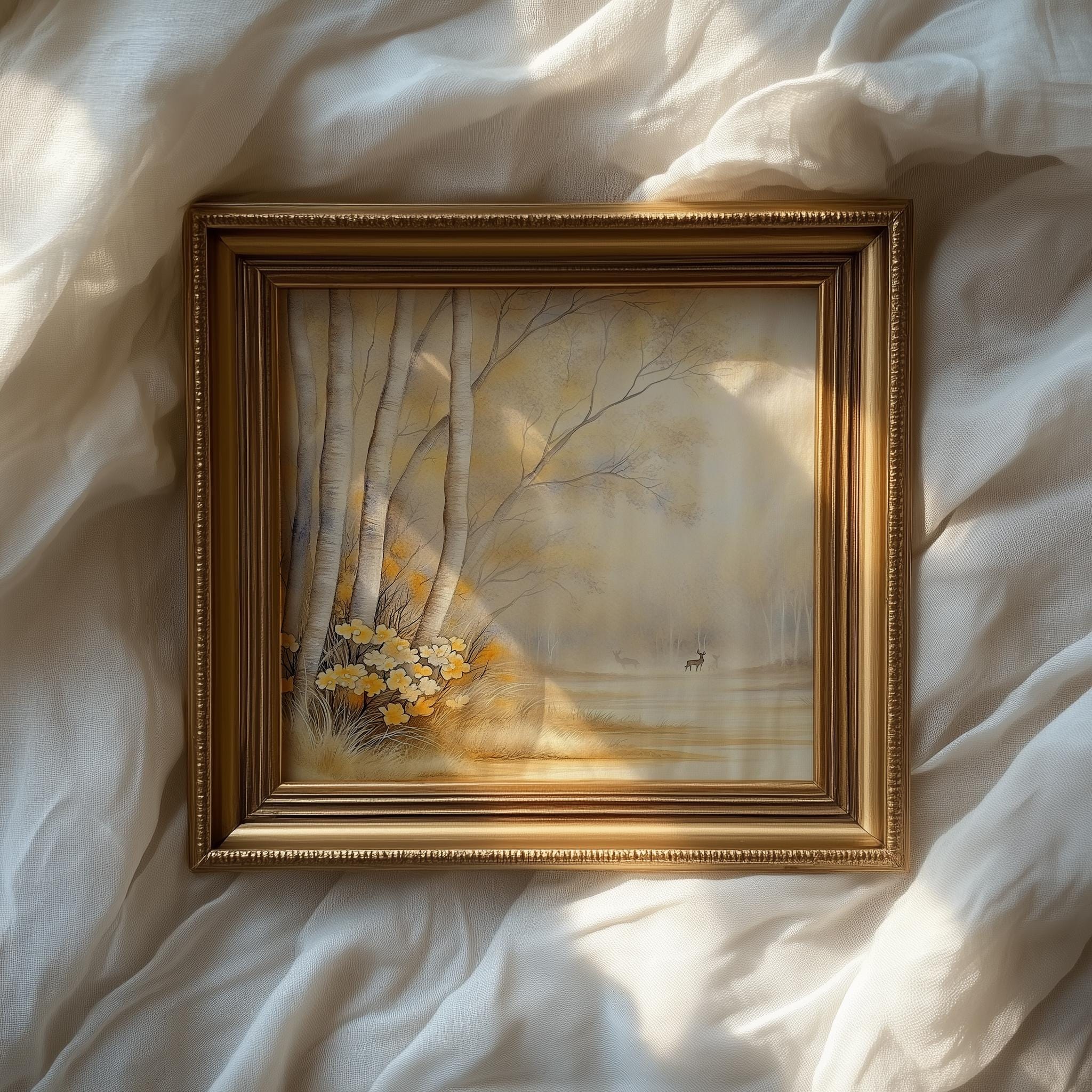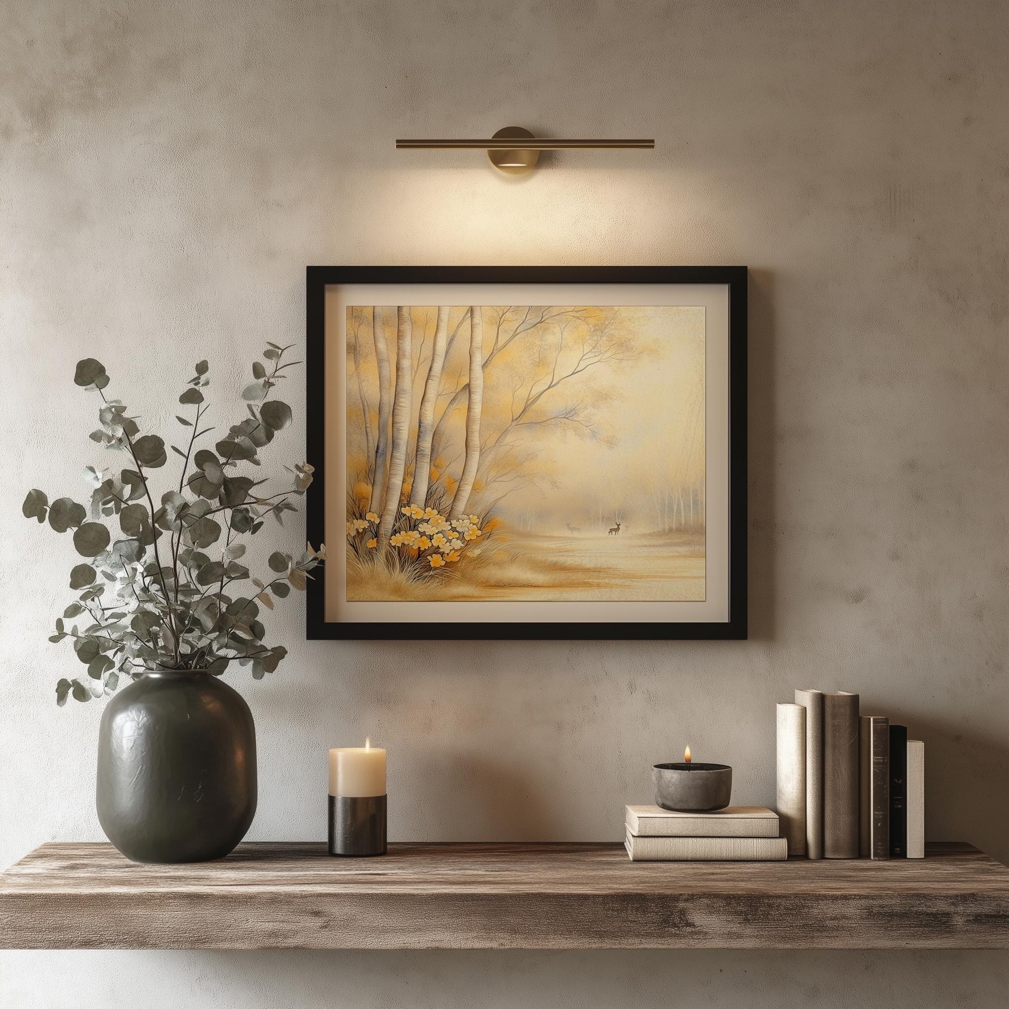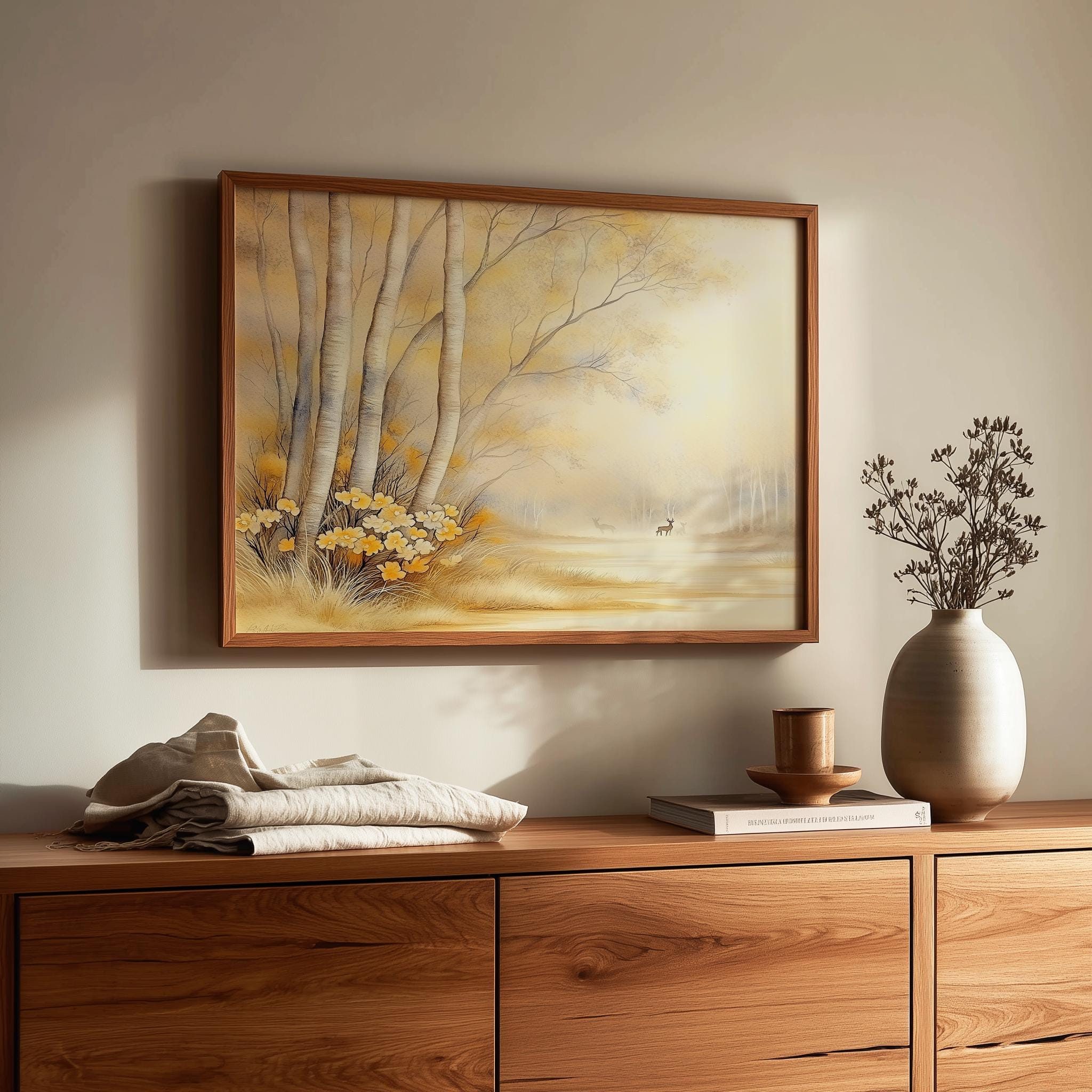 Immerse yourself in the charm with this rustic painting of a misty forest at dawn, featuring elegant birch trees surrounded by soft morning light. An instantly downloadable print, it's perfect for elevating your decor with budget-friendly charm. This gives you the flexibility to customize the size, frame, and material according to your personal taste and space, ensuring a perfect fit for your walls.