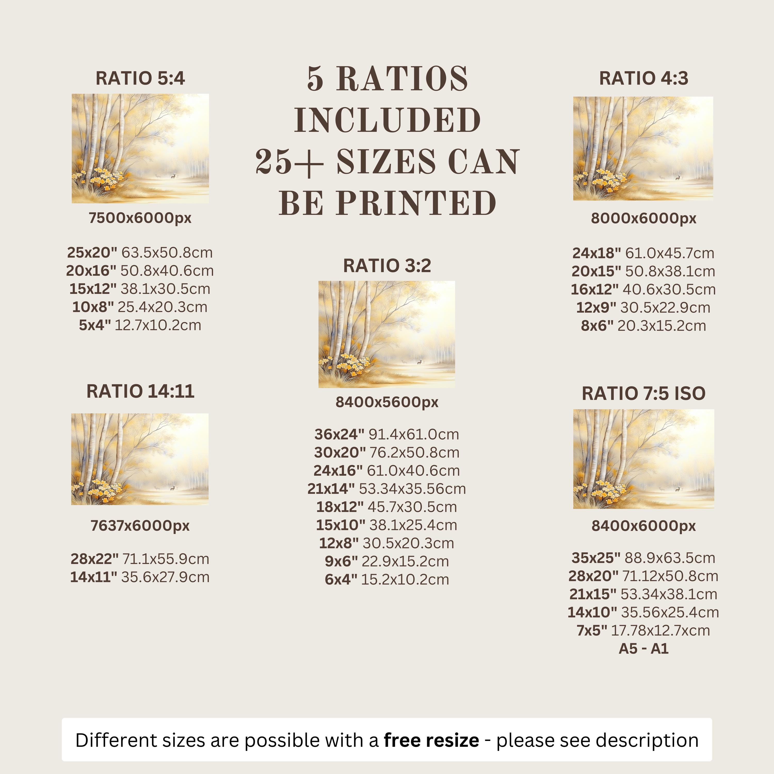 Each artwork includes 5 aspect ratios with 25+ print sizes. Most standard frames are covered. One custom resize per purchase available—message before ordering.