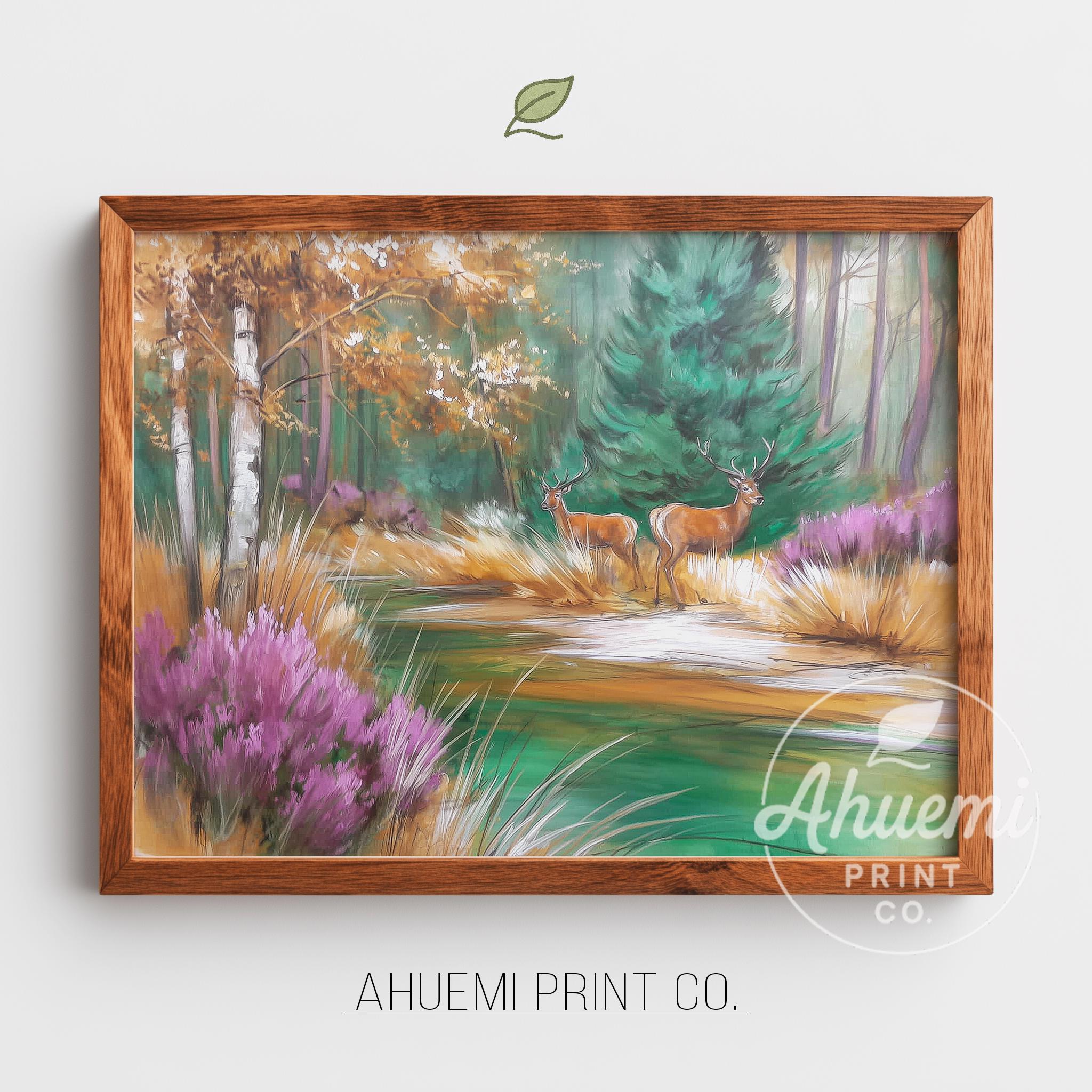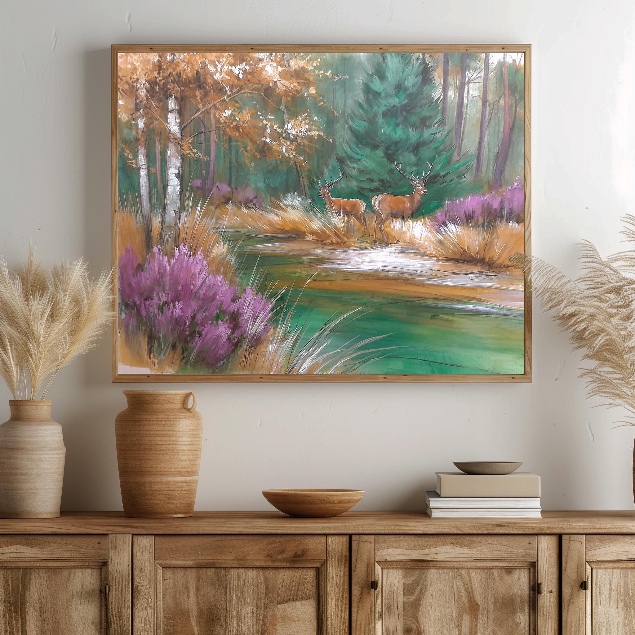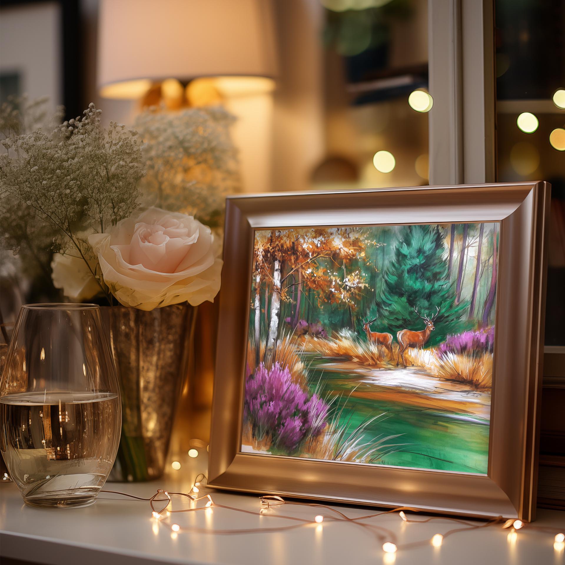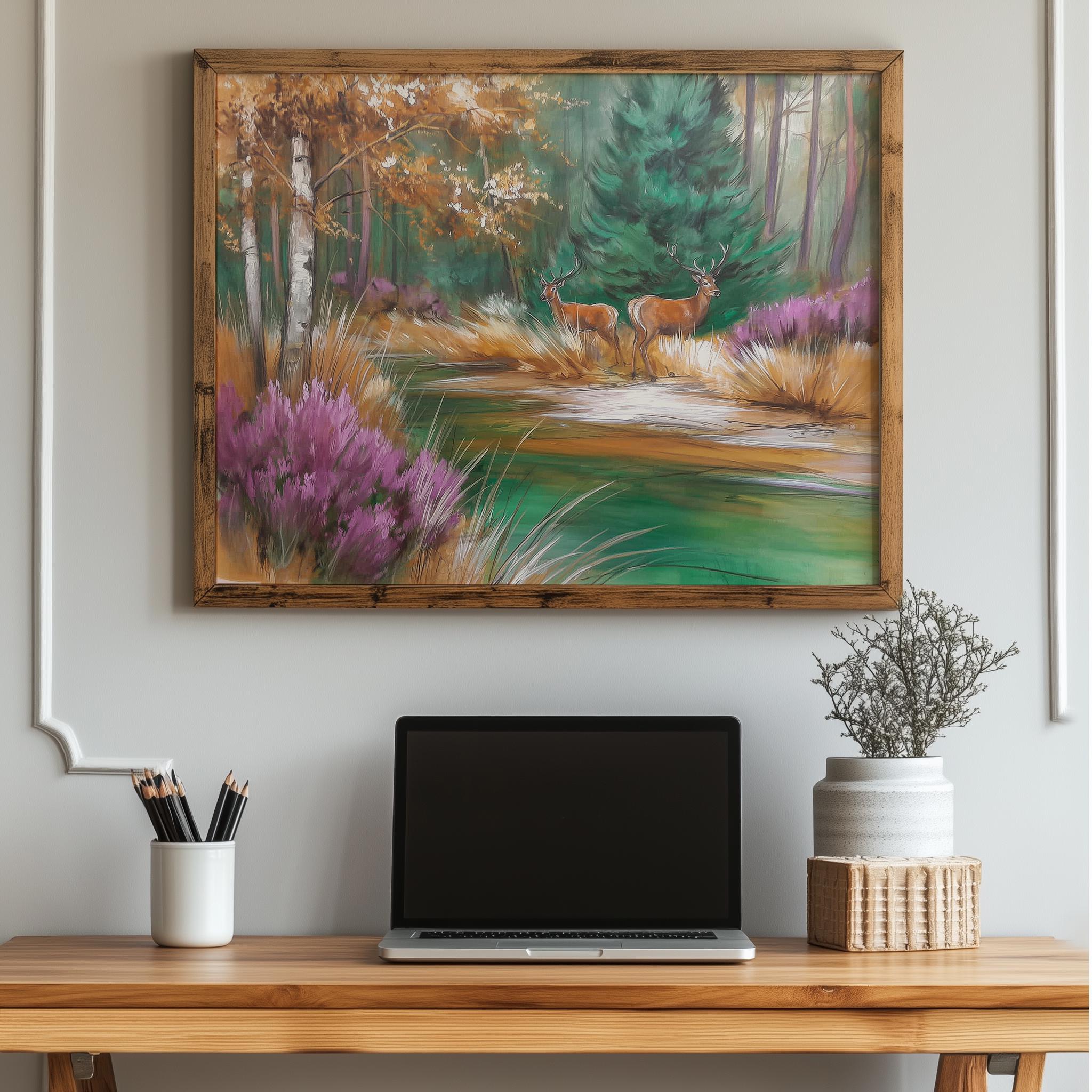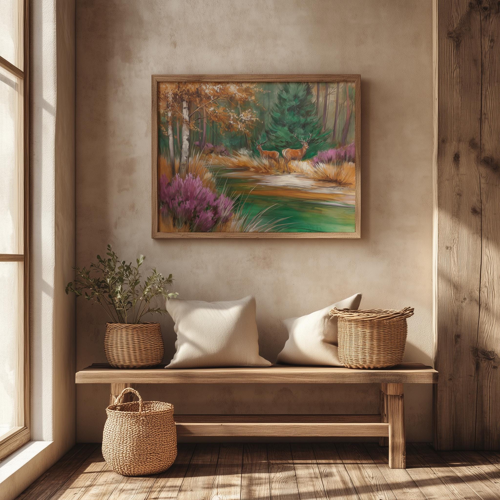 Immerse yourself in the charm with this rustic painting of a deer gracefully wandering through a misty evergreen forest at dawn. An instantly downloadable print, it's perfect for elevating your decor with budget-friendly charm. This gives you the flexibility to customize the size, frame, and material according to your personal taste and space, ensuring a perfect fit for your walls.