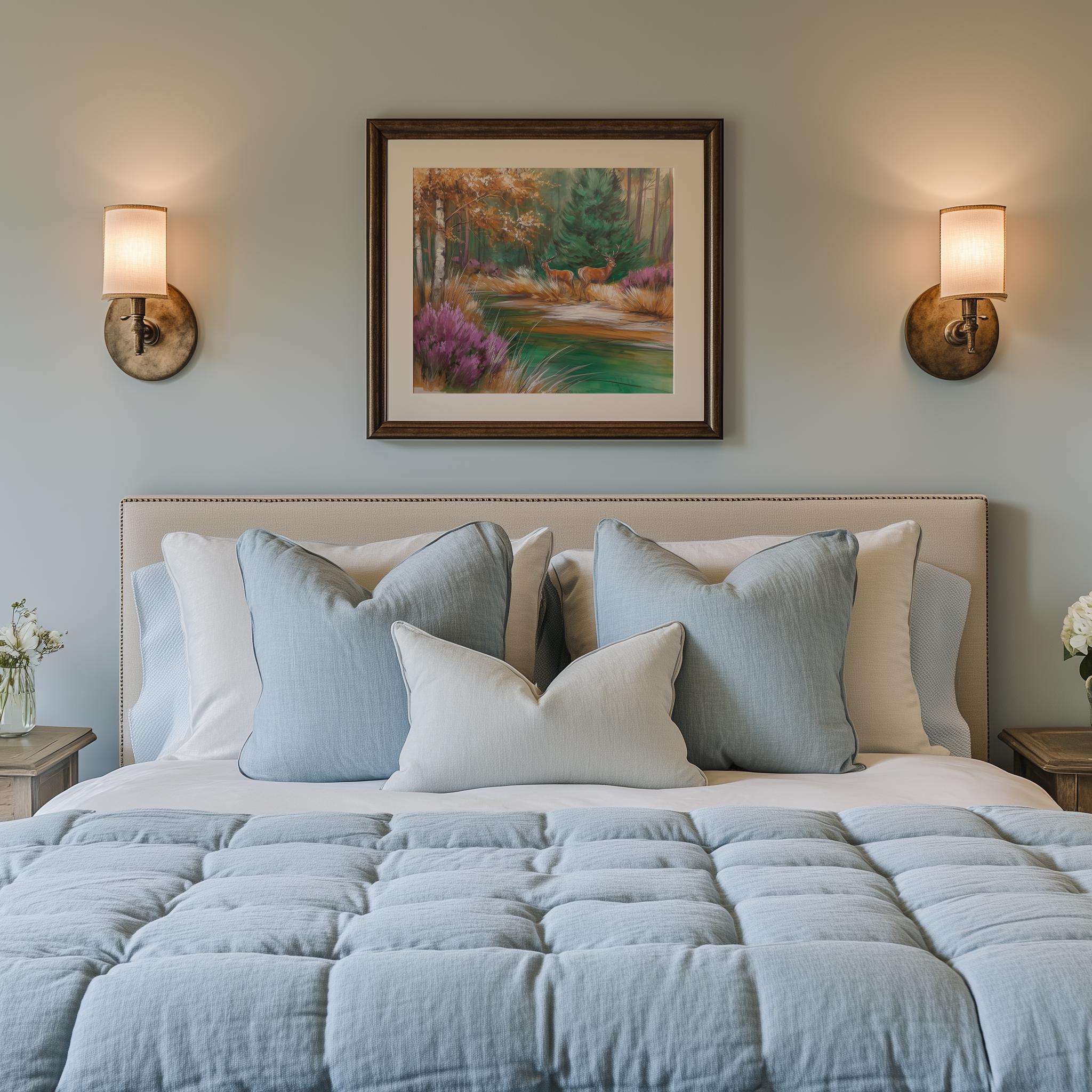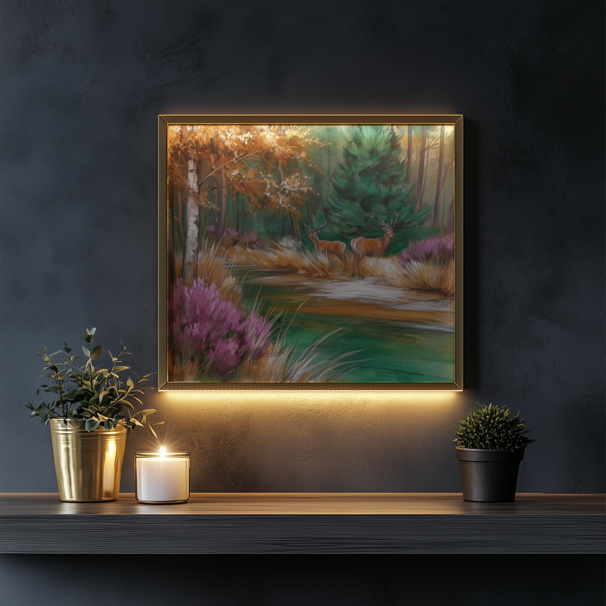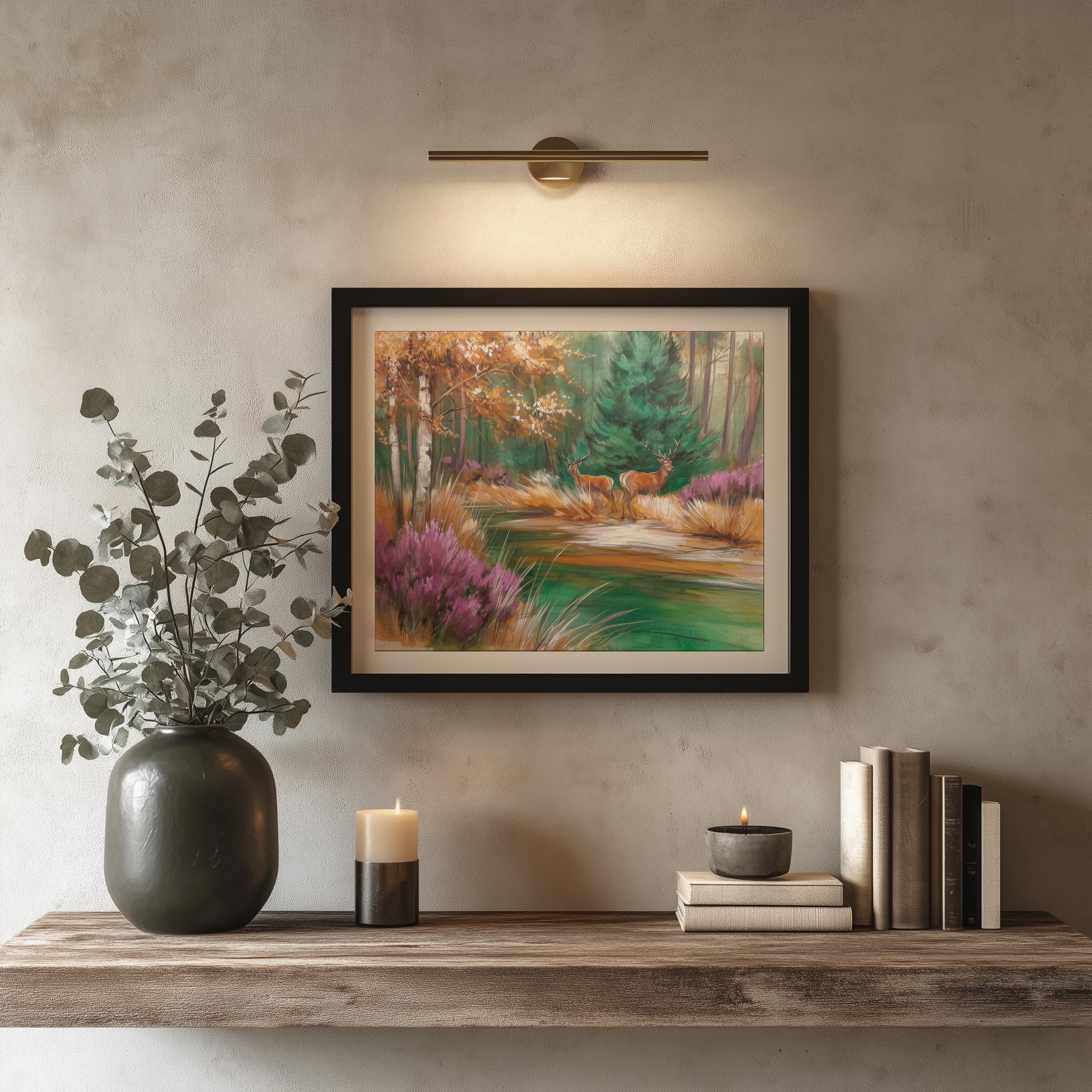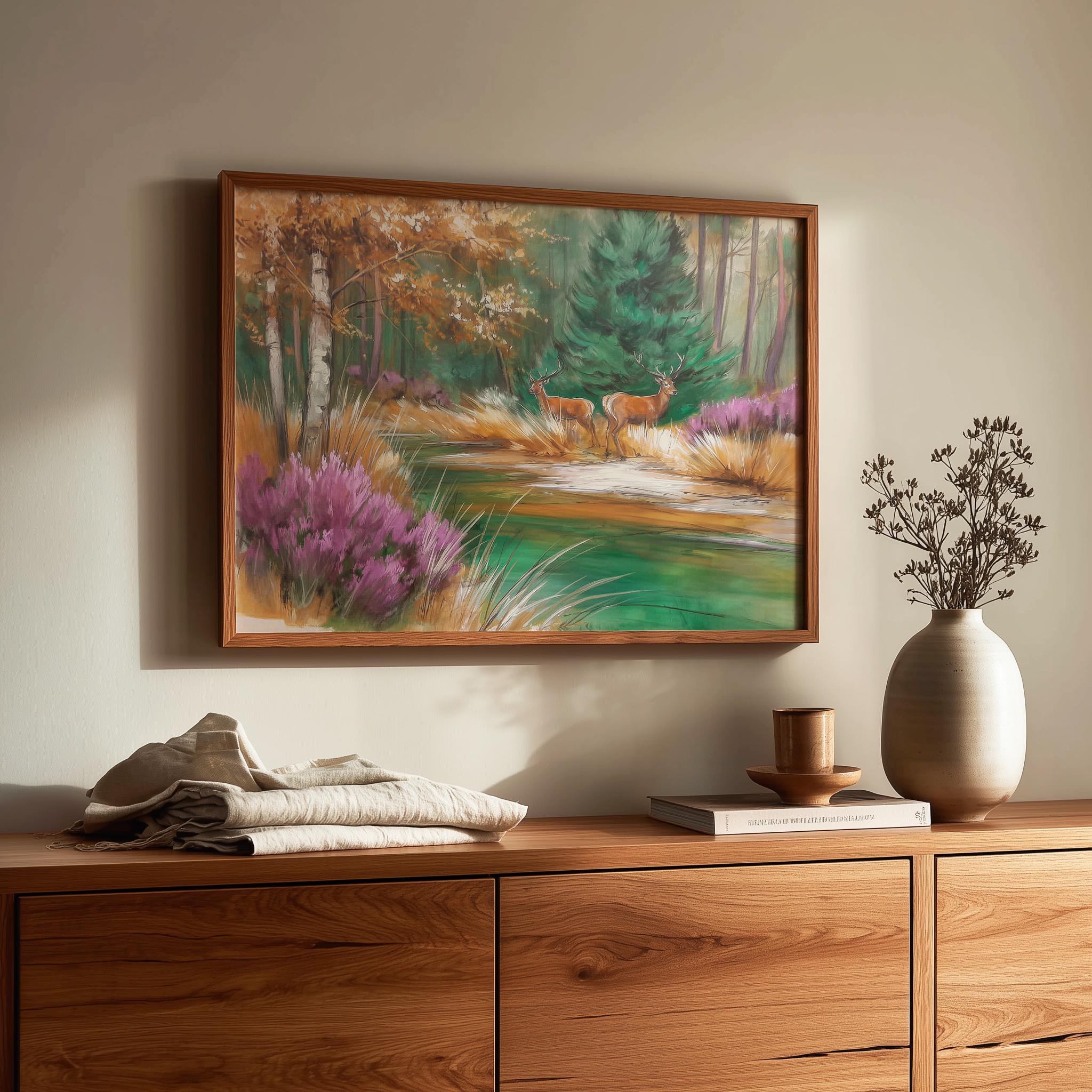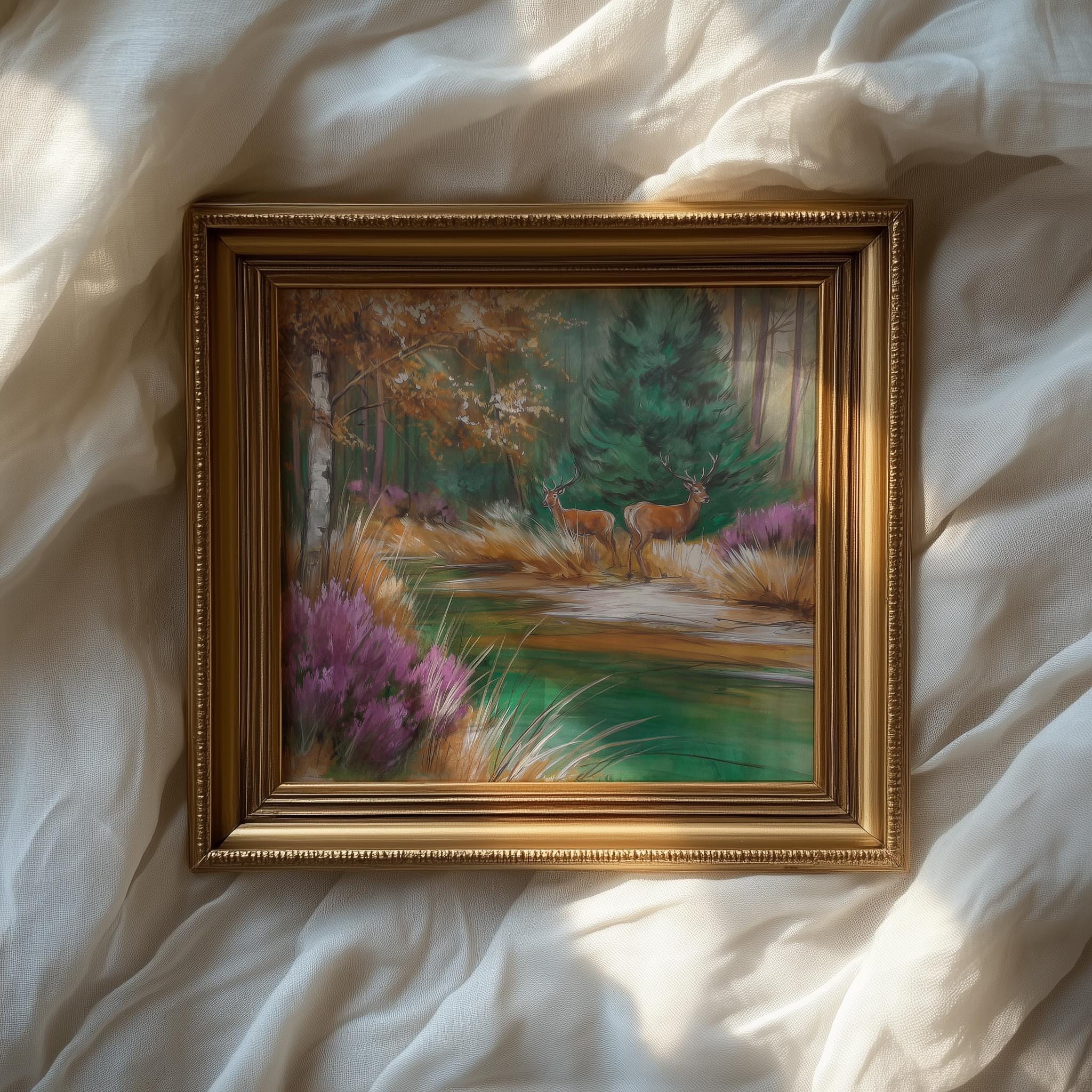 Immerse yourself in the charm with this rustic painting of a deer gracefully wandering through a misty evergreen forest at dawn. An instantly downloadable print, it's perfect for elevating your decor with budget-friendly charm. This gives you the flexibility to customize the size, frame, and material according to your personal taste and space, ensuring a perfect fit for your walls.