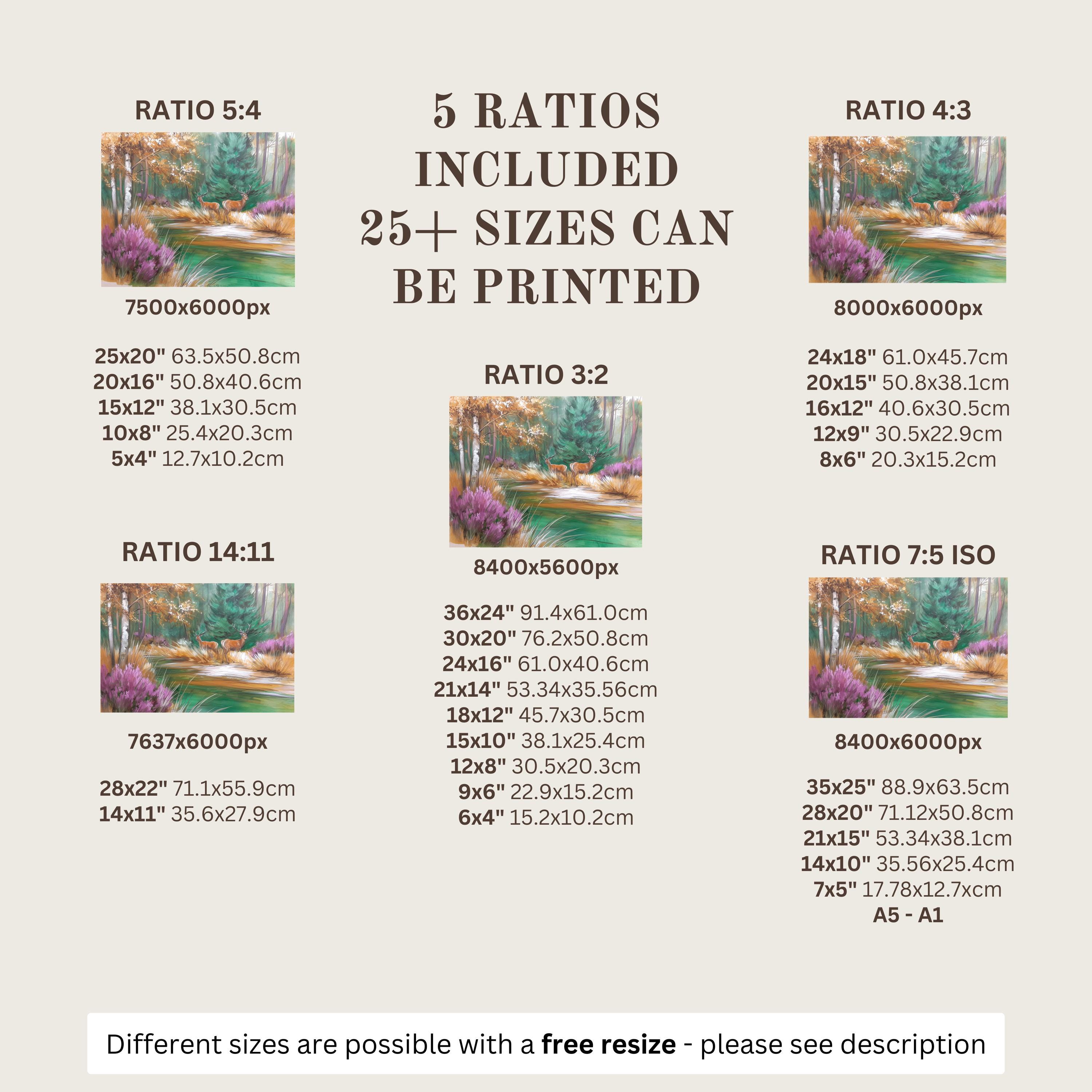 Each artwork includes 5 aspect ratios with 25+ print sizes. Most standard frames are covered. One custom resize per purchase available—message before ordering.