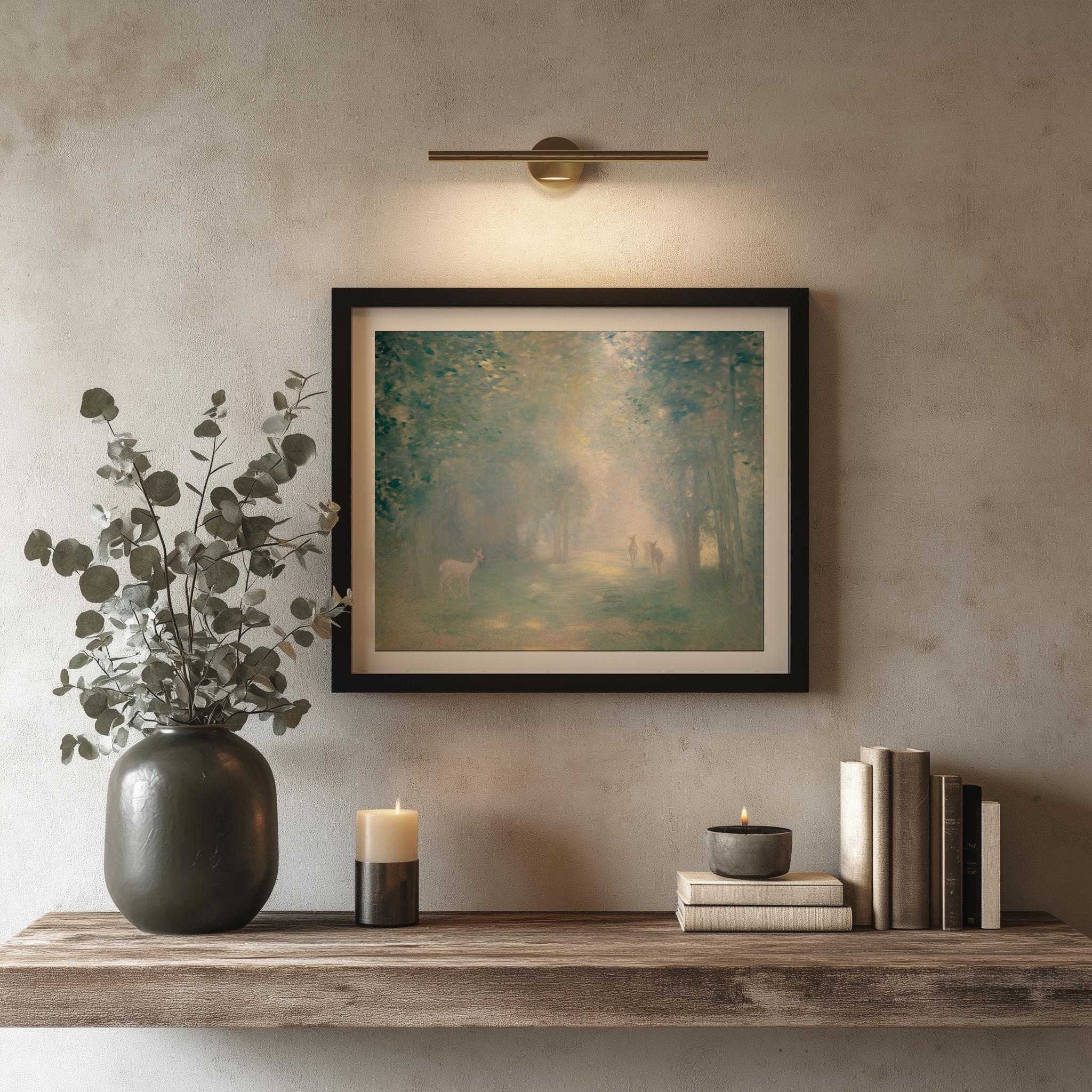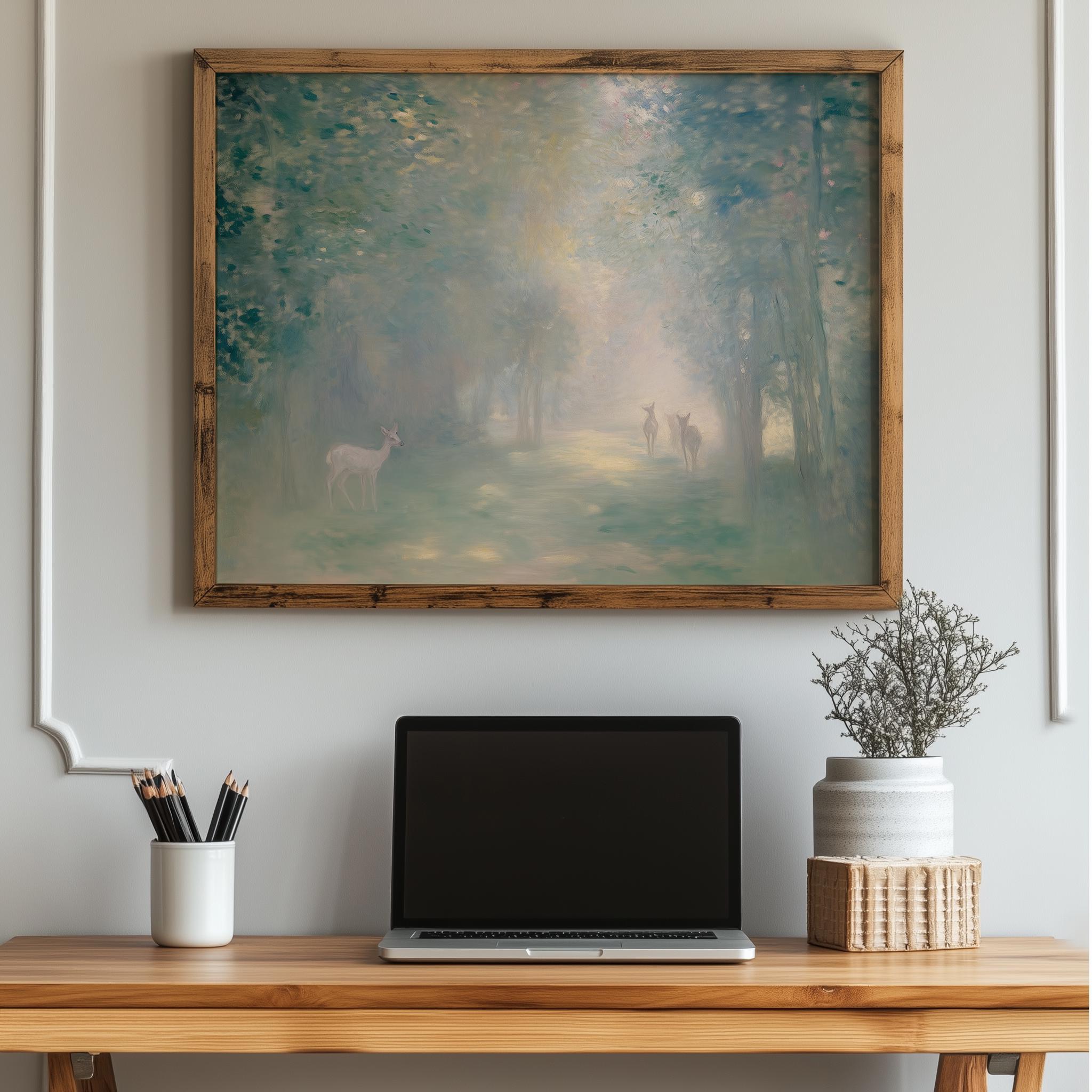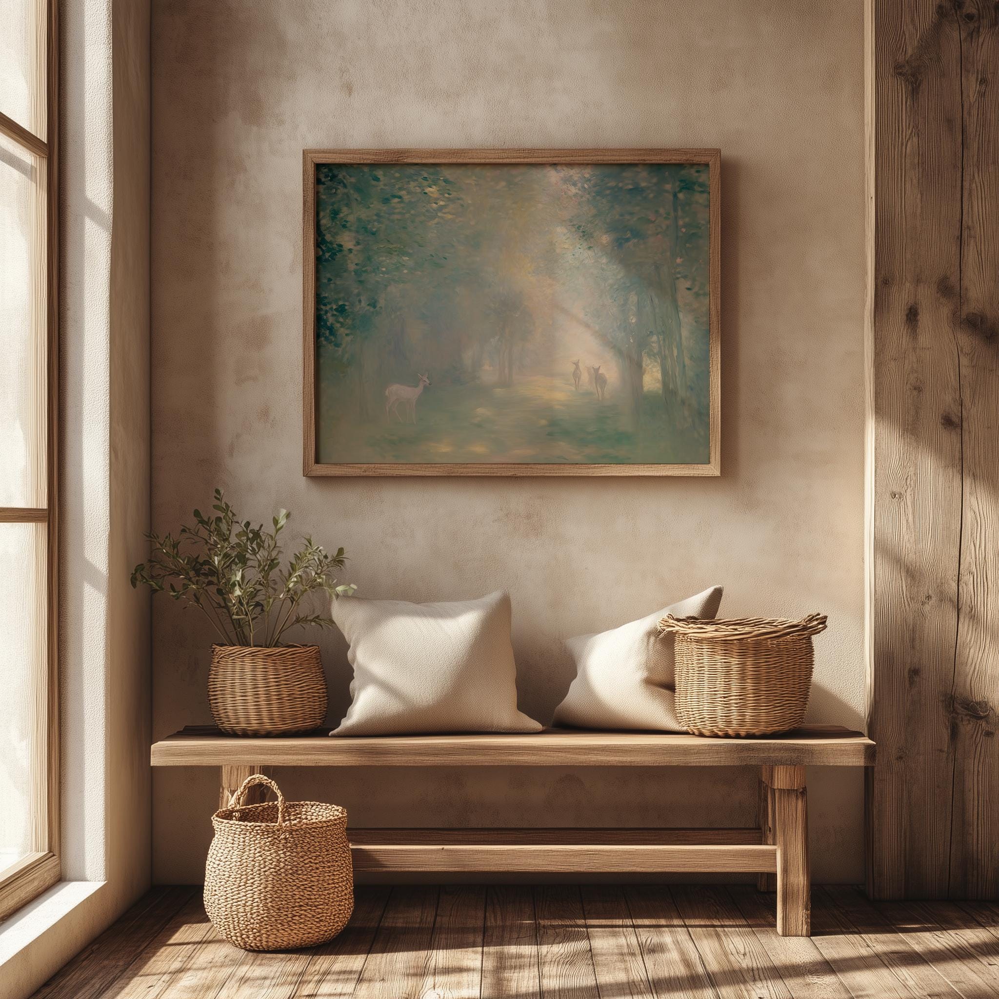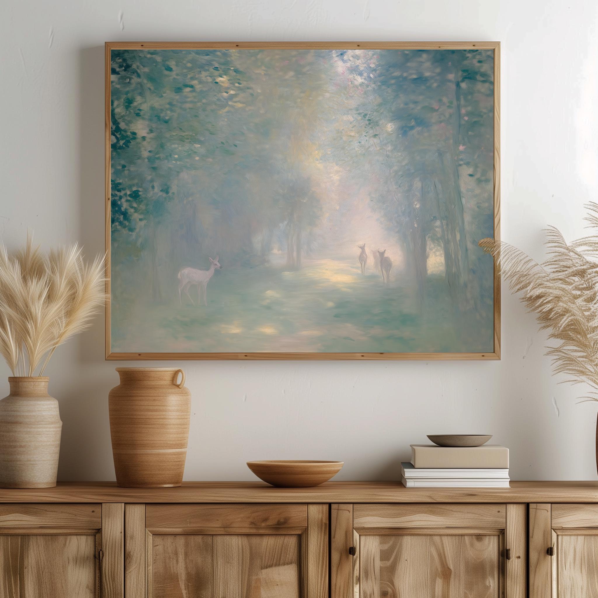 Immerse yourself in the charm with this rustic painting of a misty forest at dawn featuring graceful deer silhouettes. An instantly downloadable print, it's perfect for elevating your decor with budget-friendly charm. This gives you the flexibility to customize the size, frame, and material according to your personal taste and space, ensuring a perfect fit for your walls.