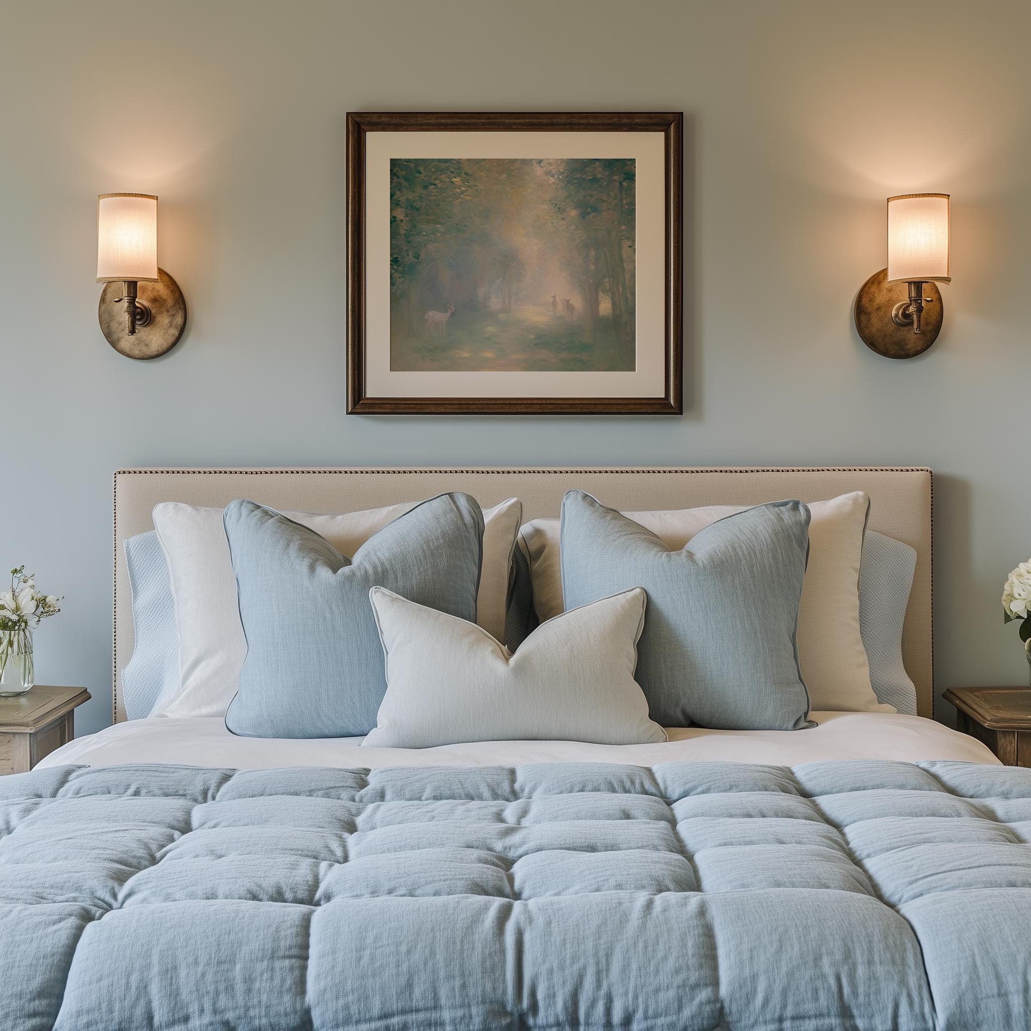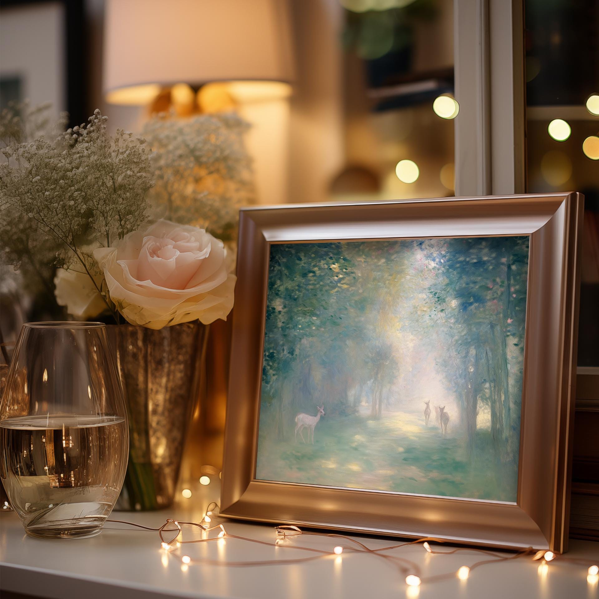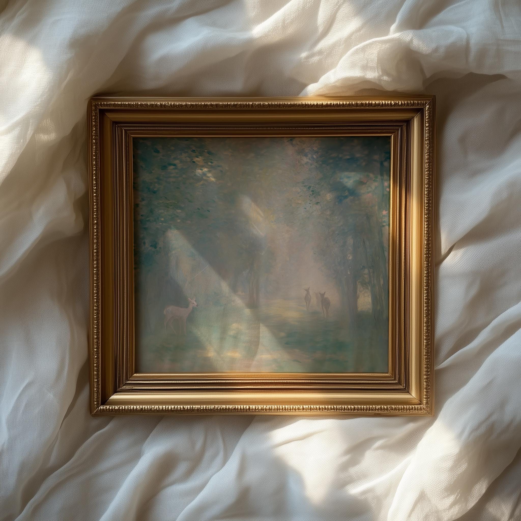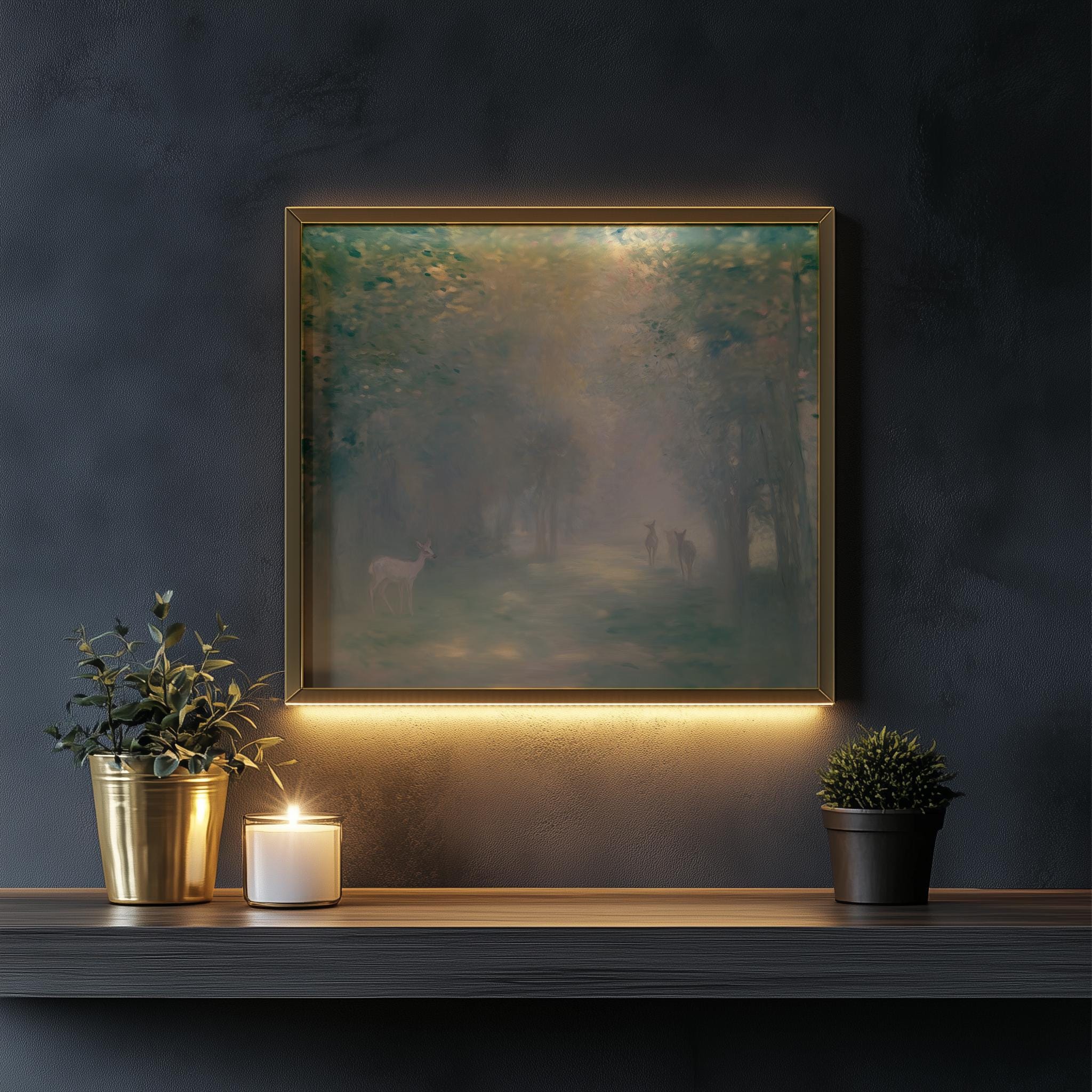 Immerse yourself in the charm with this rustic painting of a misty forest at dawn featuring graceful deer silhouettes. An instantly downloadable print, it's perfect for elevating your decor with budget-friendly charm. This gives you the flexibility to customize the size, frame, and material according to your personal taste and space, ensuring a perfect fit for your walls.