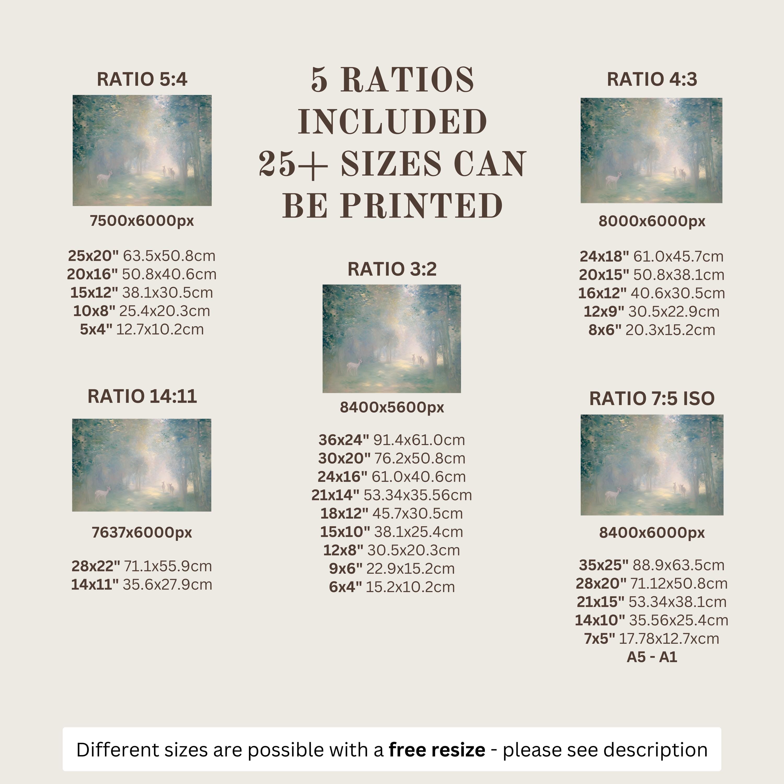 Each artwork includes 5 aspect ratios with 25+ print sizes. Most standard frames are covered. One custom resize per purchase available—message before ordering.