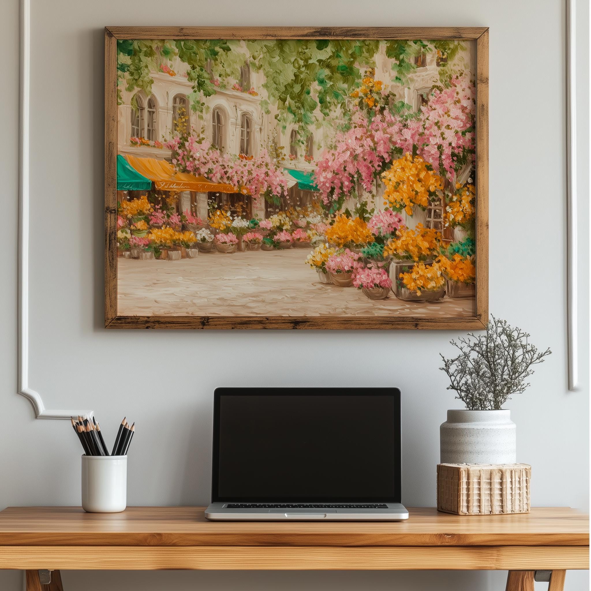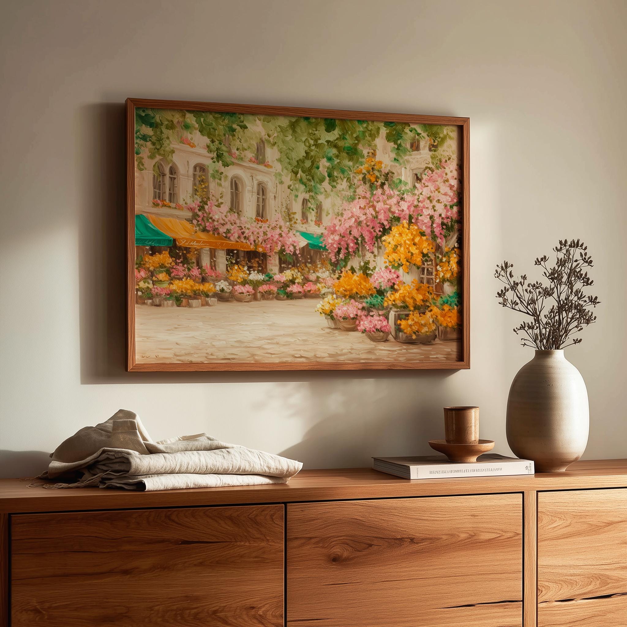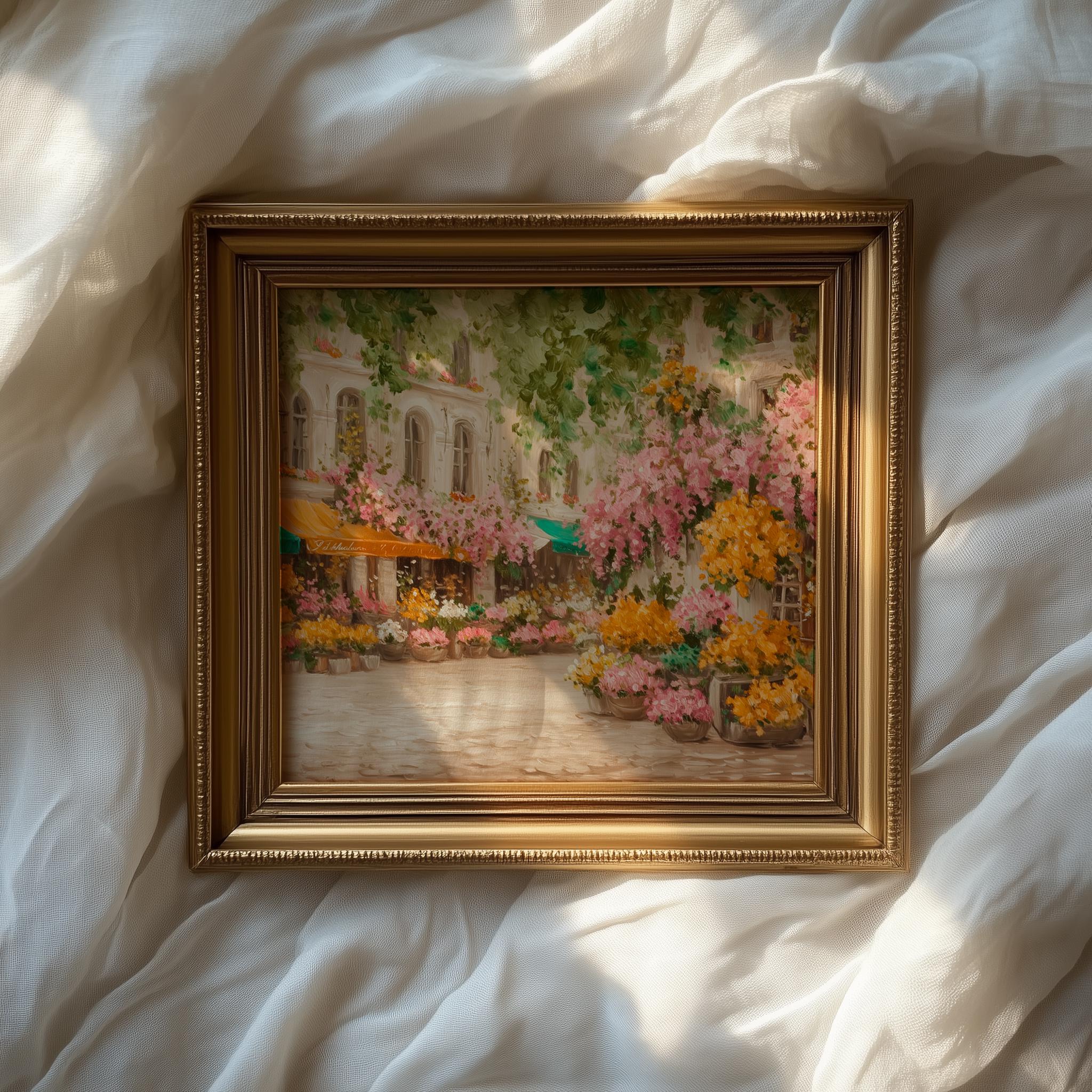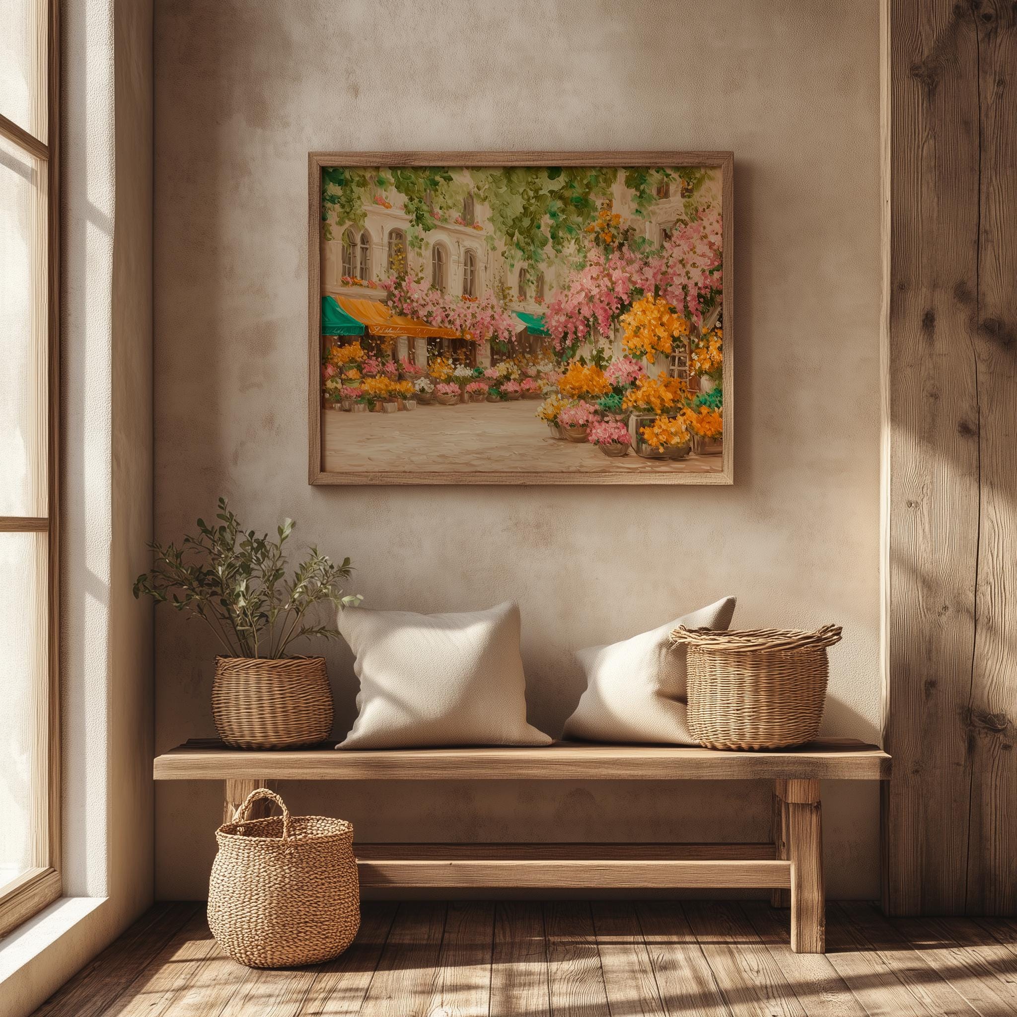 Immerse yourself in the charm with this rustic painting of a charming flower market scene, complete with quaint stalls and vibrant blooms. An instantly downloadable print, it's perfect for elevating your decor with budget-friendly charm. This gives you the flexibility to customize the size, frame, and material according to your personal taste and space, ensuring a perfect fit for your walls.