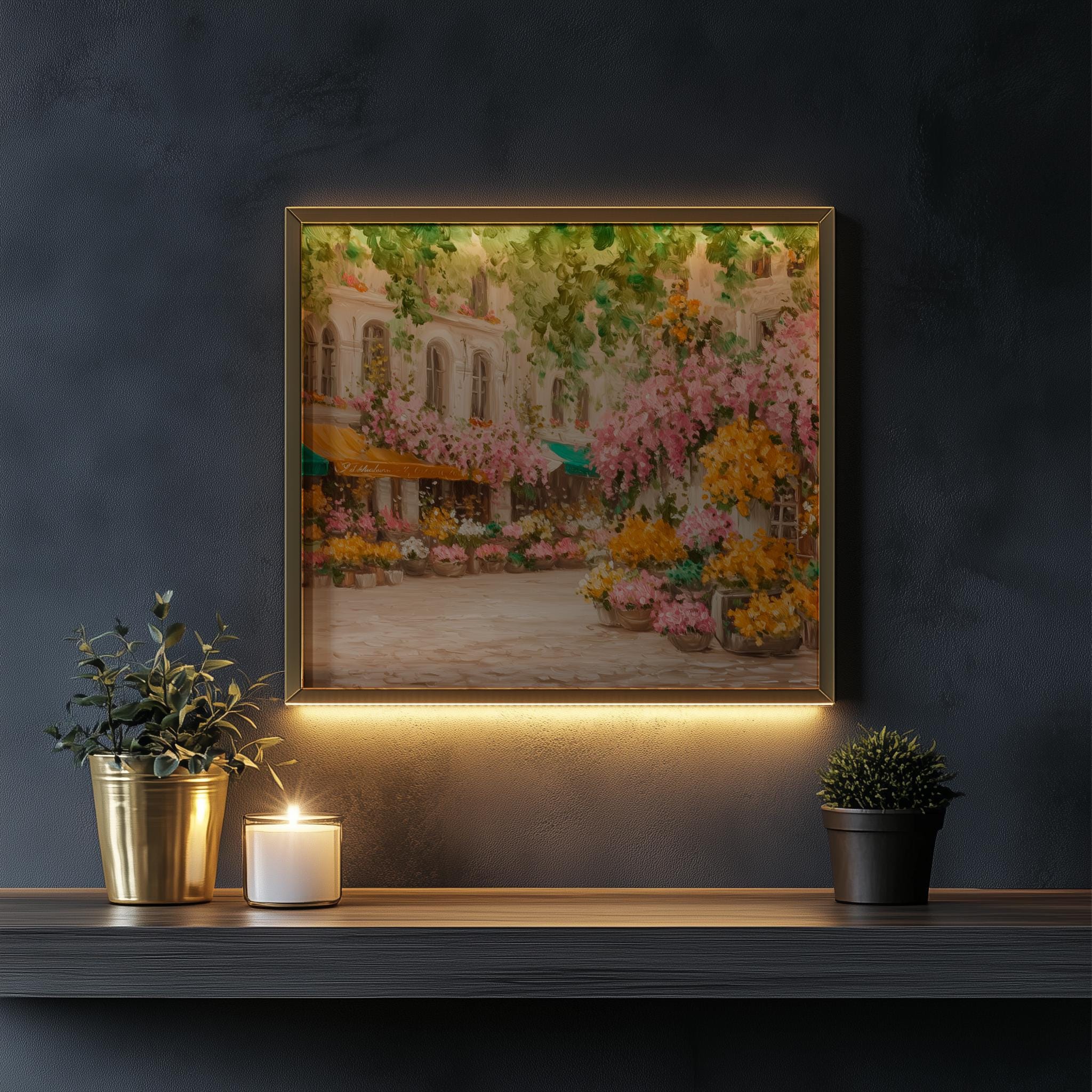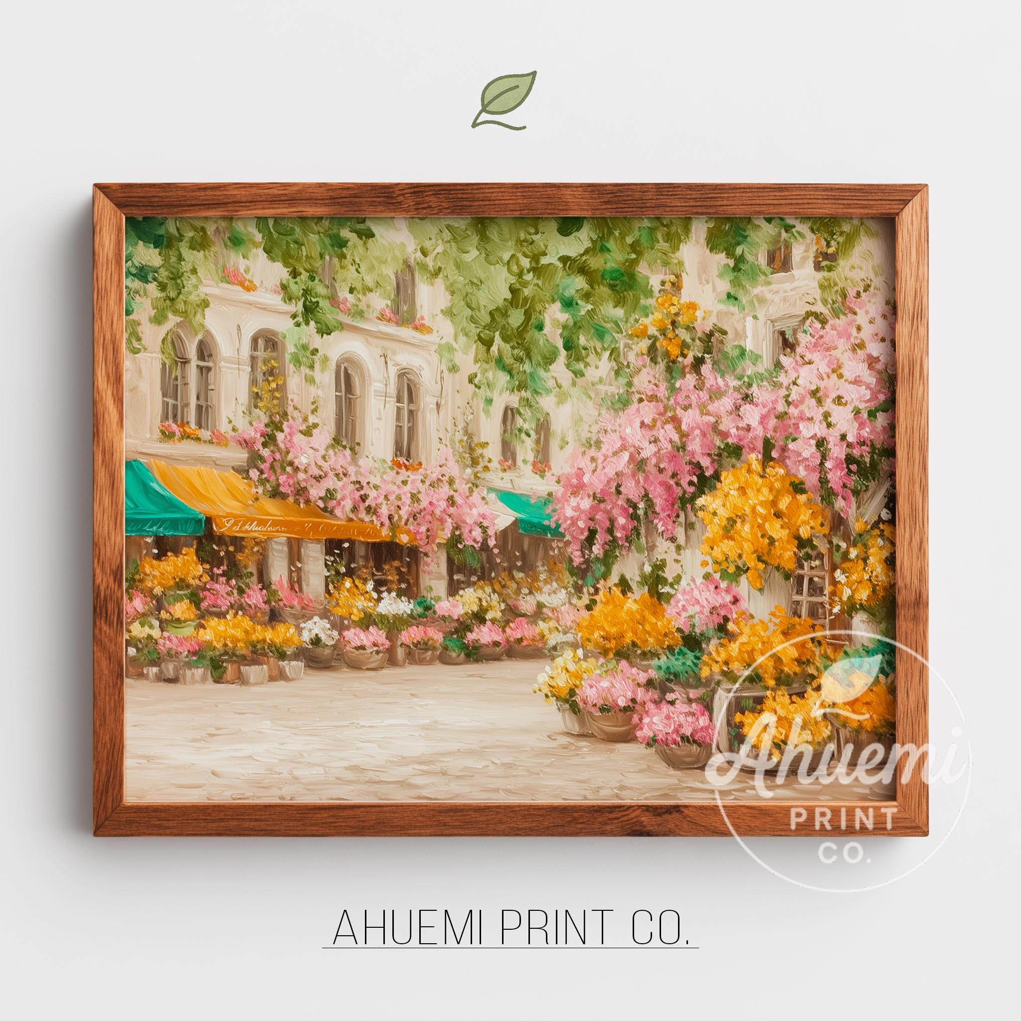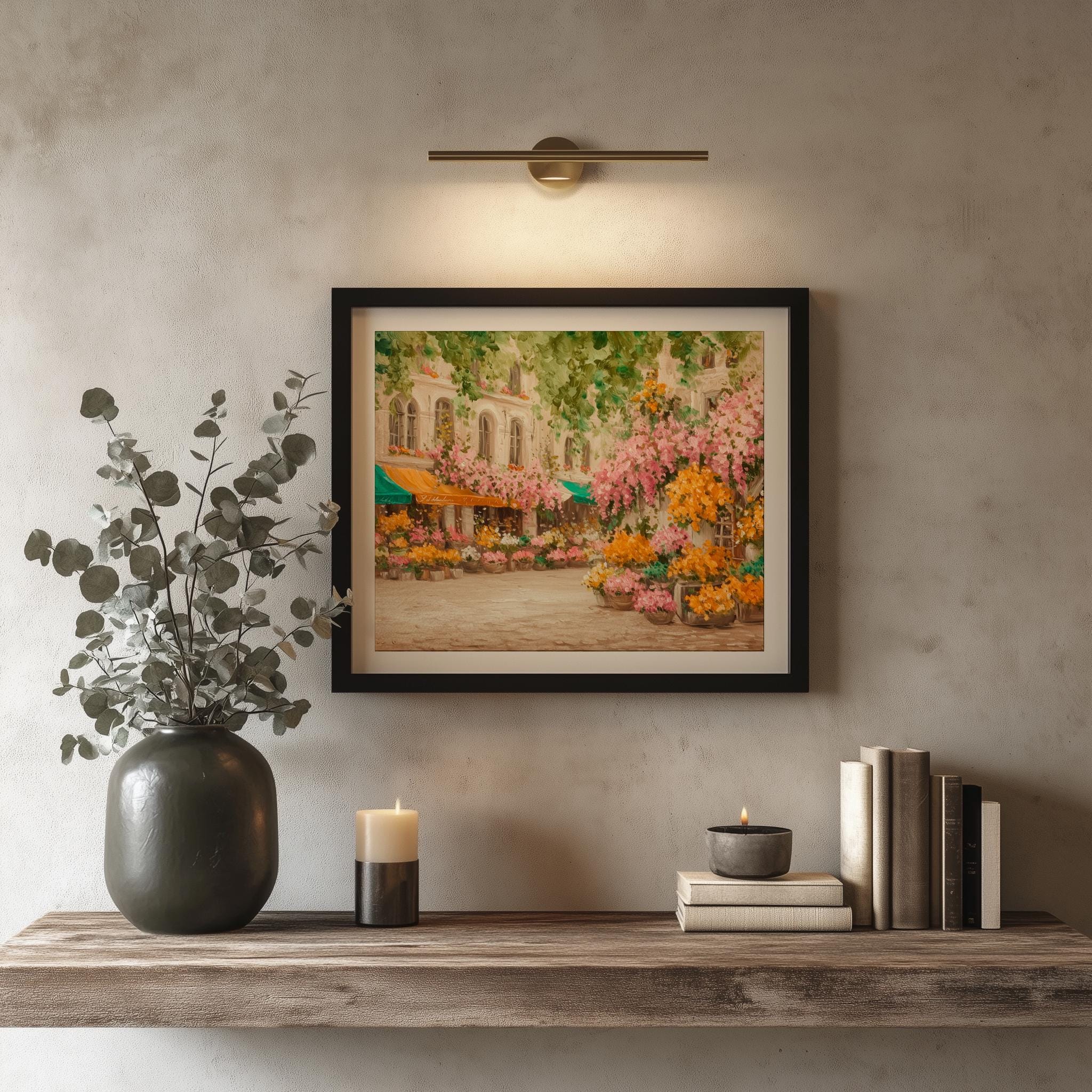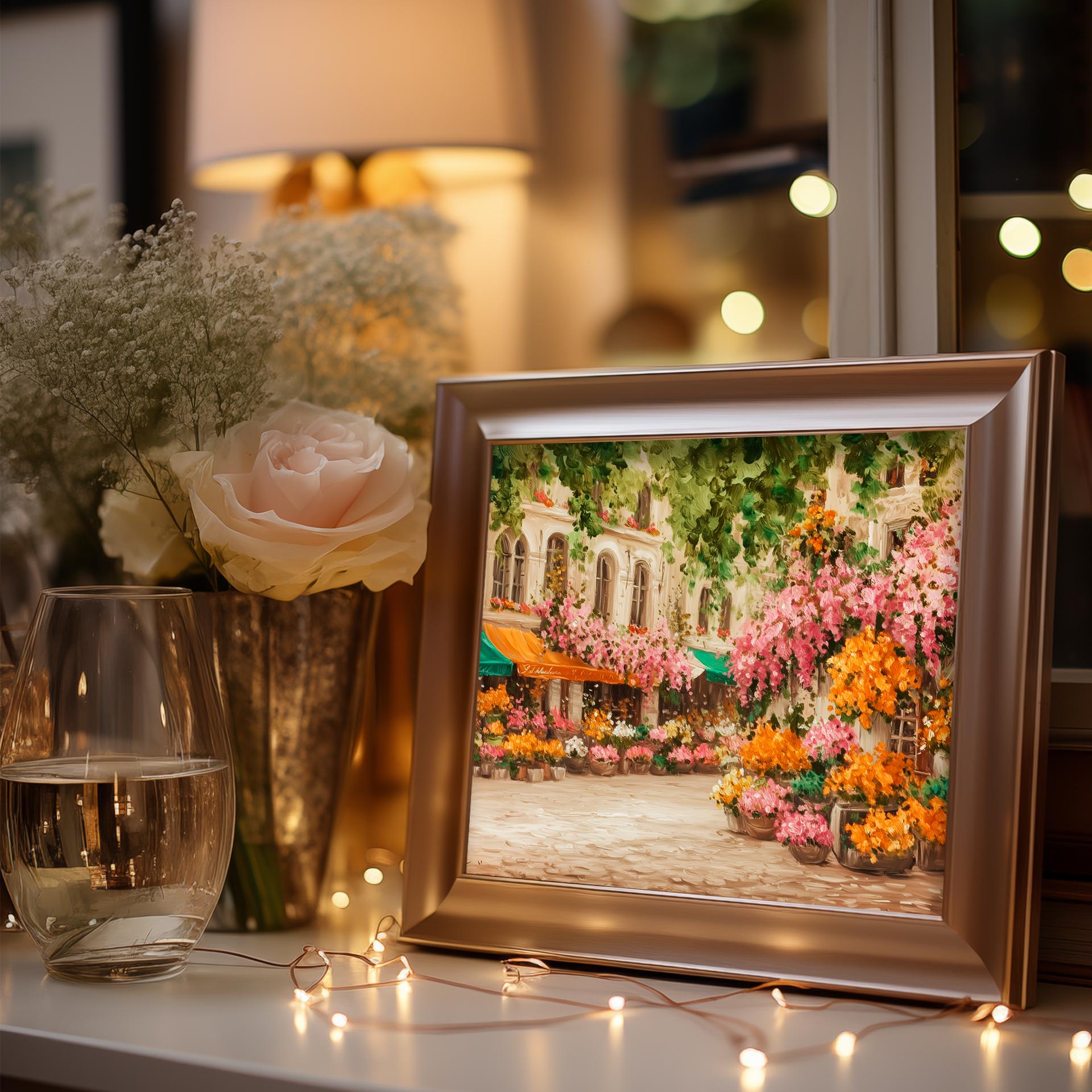 Immerse yourself in the charm with this rustic painting of a charming flower market scene, complete with quaint stalls and vibrant blooms. An instantly downloadable print, it's perfect for elevating your decor with budget-friendly charm. This gives you the flexibility to customize the size, frame, and material according to your personal taste and space, ensuring a perfect fit for your walls.