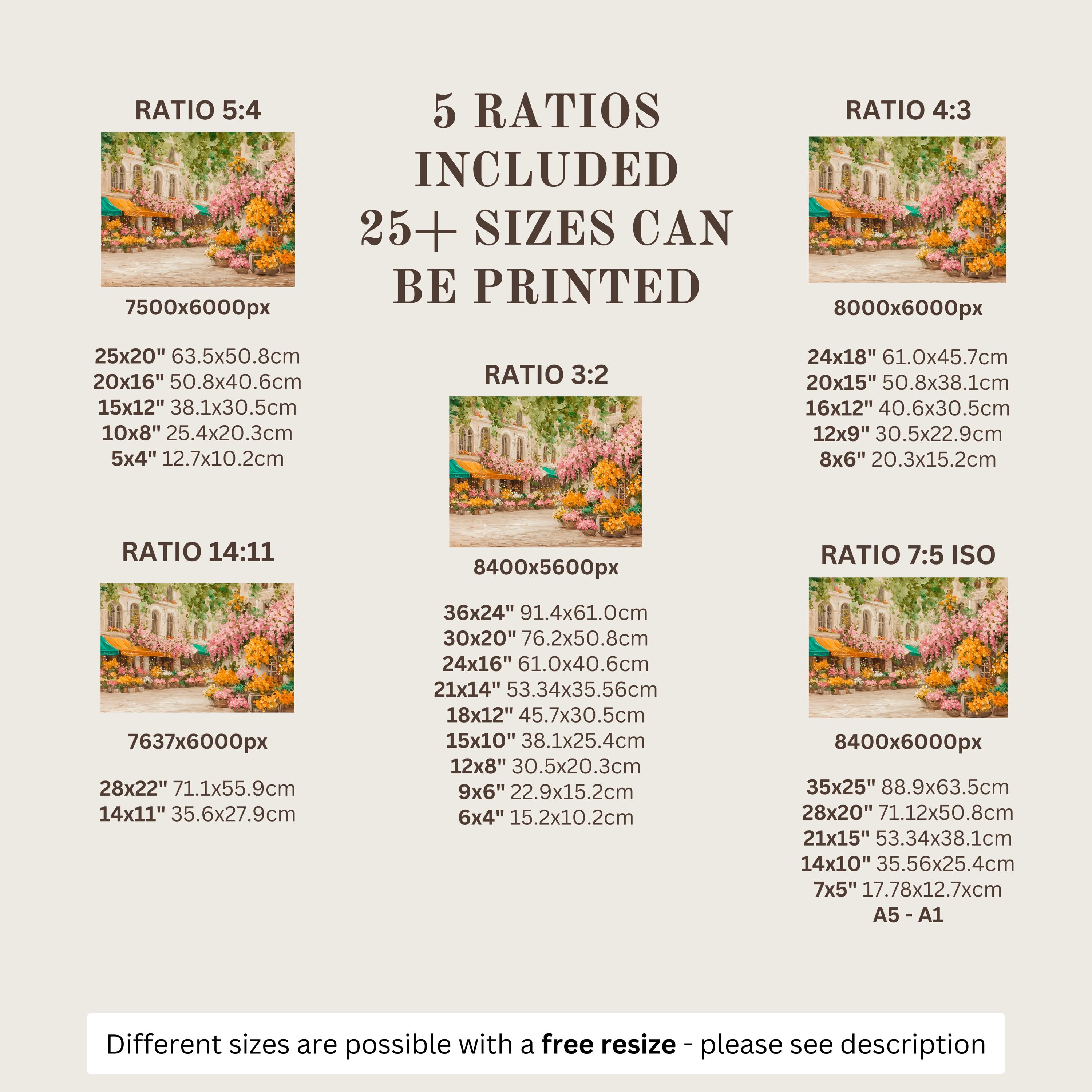 Each artwork includes 5 aspect ratios with 25+ print sizes. Most standard frames are covered. One custom resize per purchase available—message before ordering.